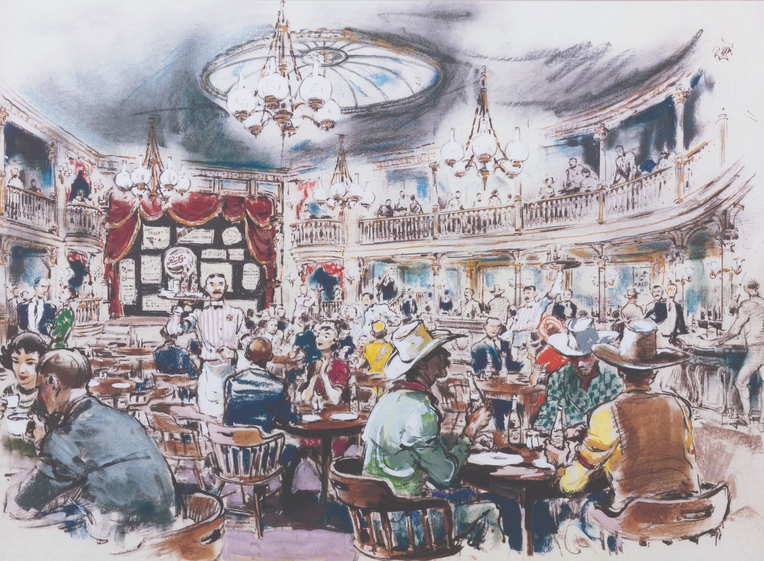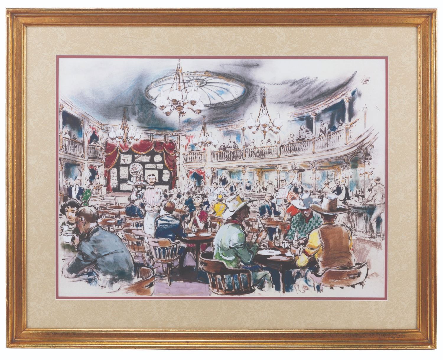 (Disneyland Hotel, 2000s) A framed print of Imagineer Sam McKim’s concept art for the Golden Horseshoe Saloon in Frontierland. This high-quality print was displayed in the Disneyland Hotel. The artwork has an image size of 20" x 26.75" in its 28.25" x 35.25" gold-toned original frame. The print is in fine condition, while the frame is in very good condition with light wear. This item requires special shipping arrangements. Please inquire before bidding.