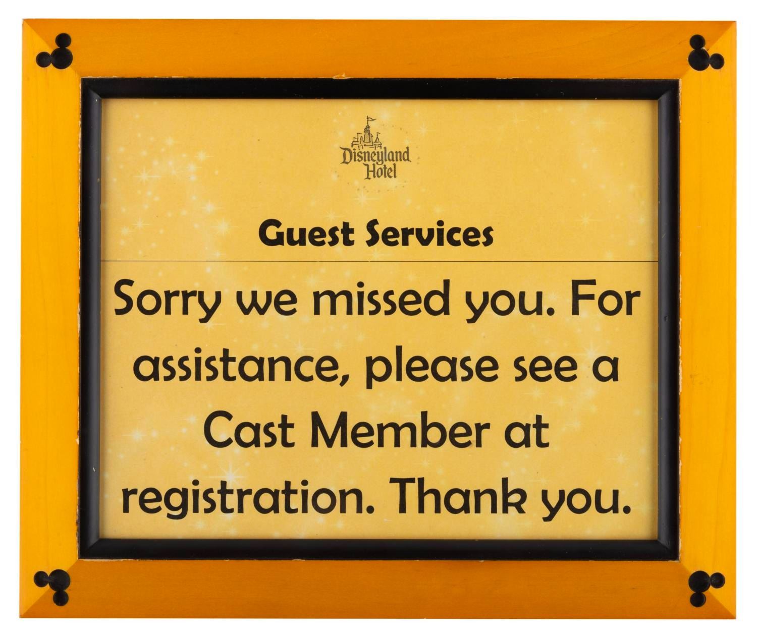 (Disneyland Hotel, 2000s-2010s) A framed Disneyland Hotel Guest Services sign directing Guests to the Hotel registration when no Cast Members were available. Measuring 8” x 10” and 10” x 12.5” framed, the sign is in good condition with some wear from Hotel use.