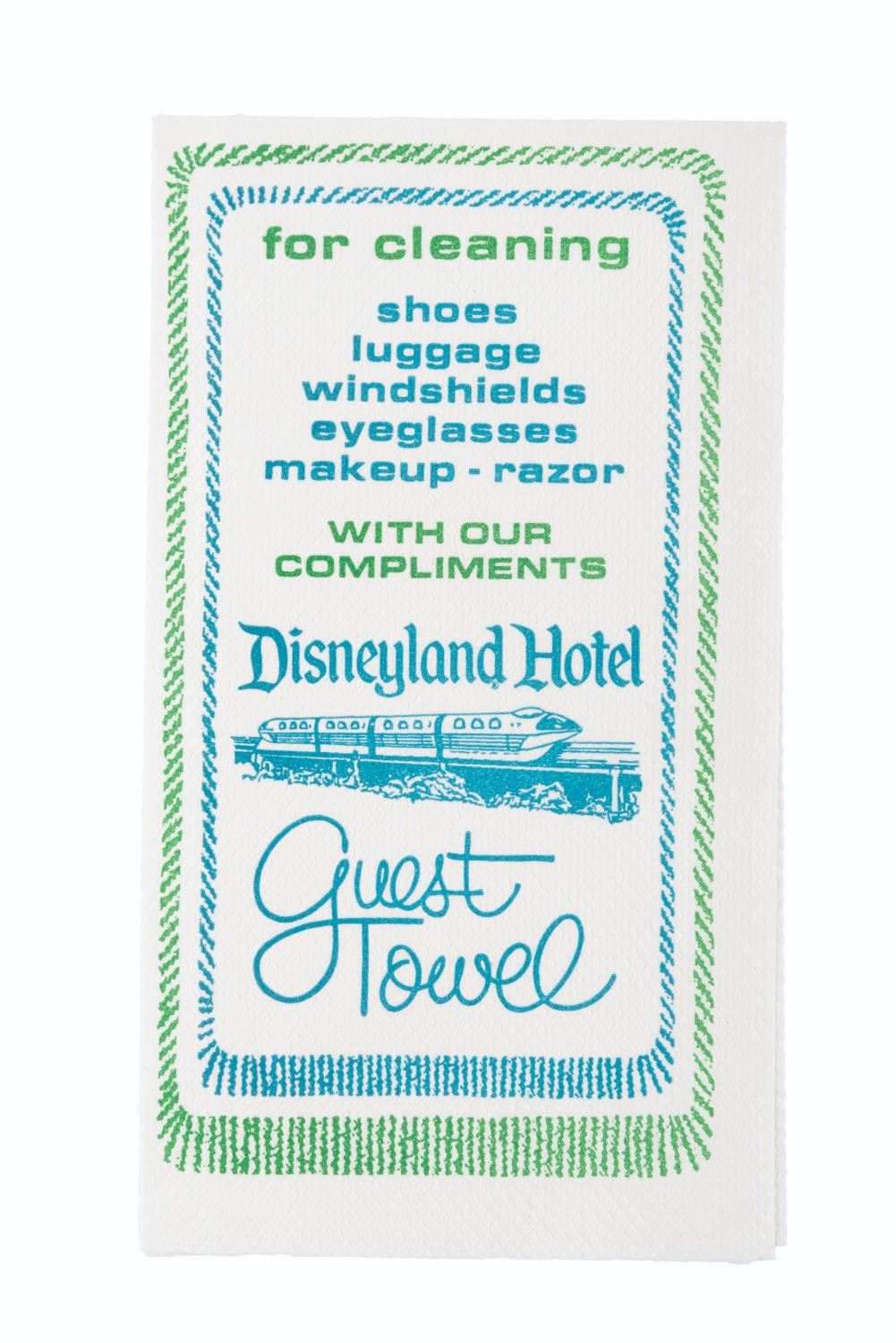 (Disneyland, 1970s) A decorative complimentary guest towel from the Disneyland Hotel featuring an image of the Monorail. Measuring 8.5" x 4.75" the towel is in fine condition.