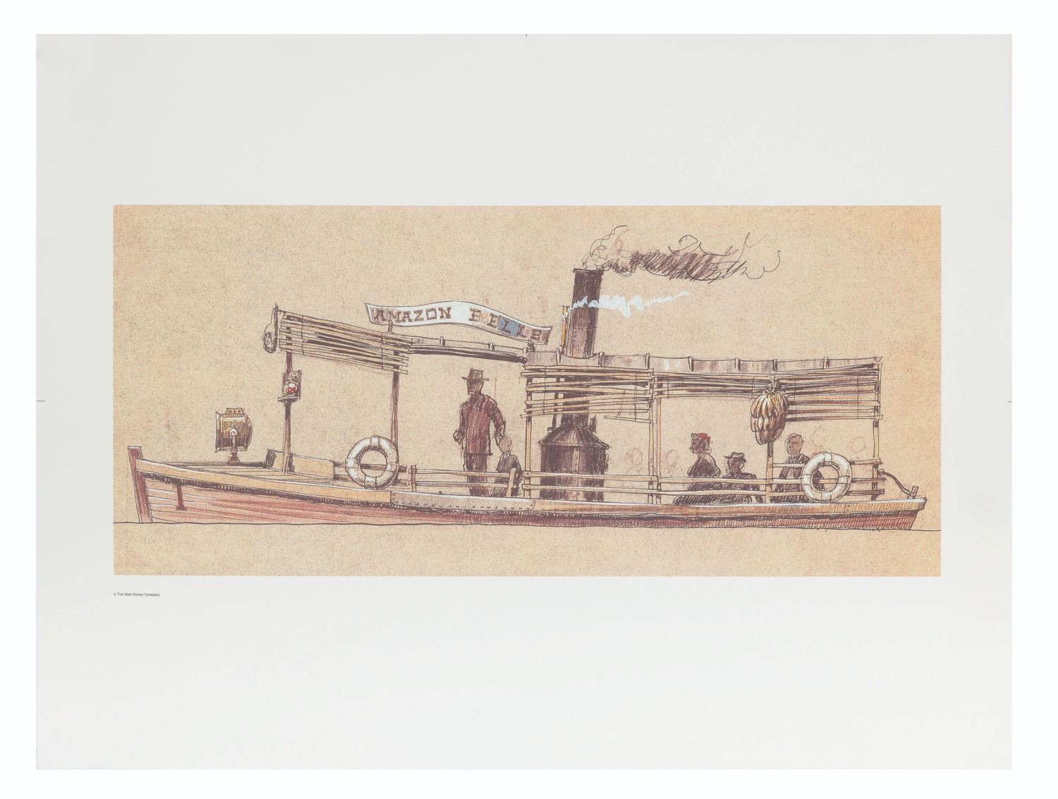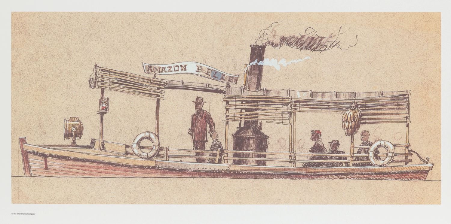 (Disneyland, 1980s-90s) A lithographic print of a Harper Goff concept for the Jungle Cruise at Disneyland. The print was used as decorative art in the Disneyland Hotel. With an image size of 8.75” x 19.5” on 17.5” x 23” paper, the artwork is in very good condition with light wear from handling.