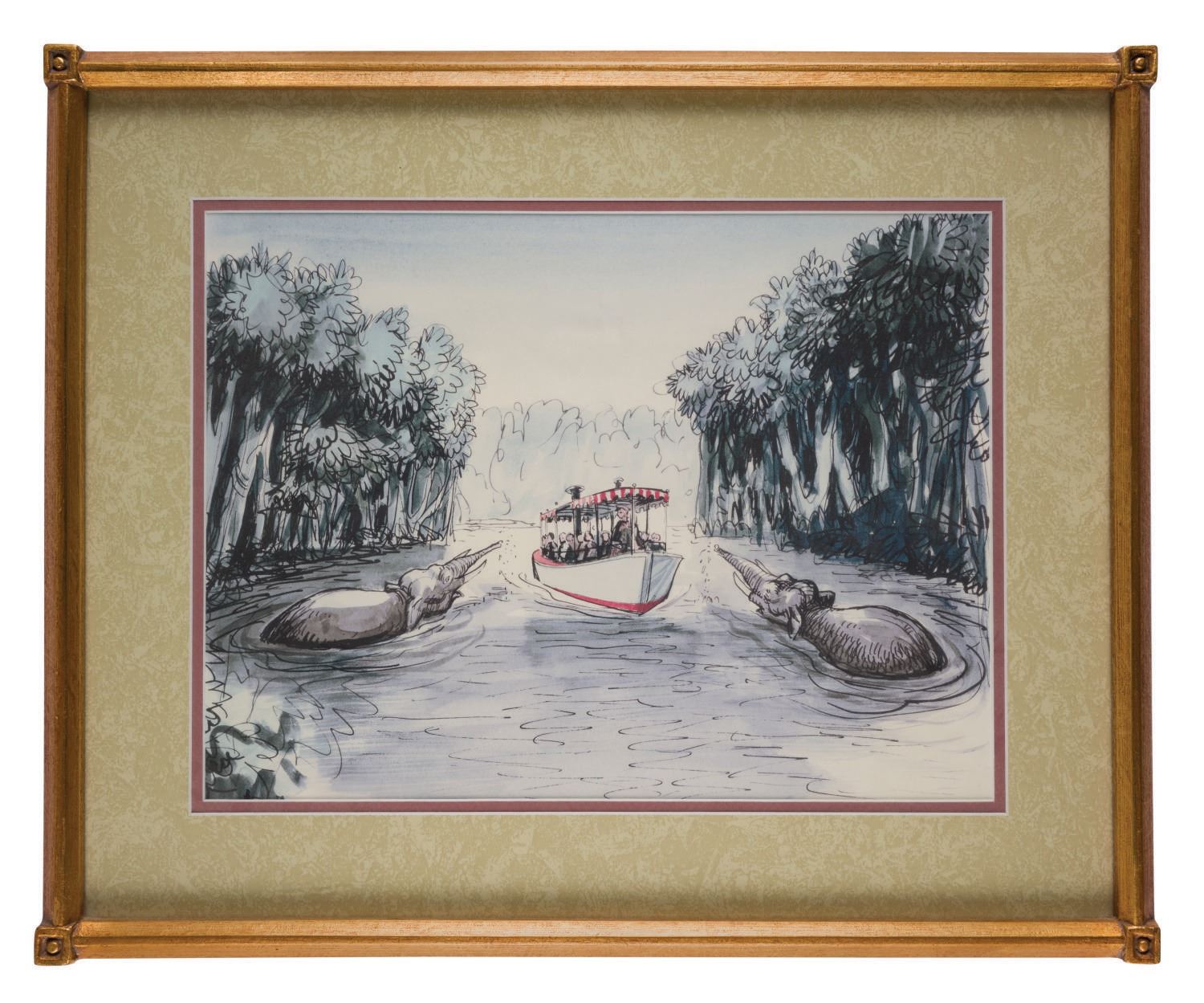 (Disneyland, 1990s) A framed print of a Marc Davis concept of a Jungle Cruise boat entering the Enchanted Bathing Pool of Elephants. Artwork from the history of the Park is a fixture of the Disneyland Hotel's decor, and this framed print was on display at the legendary establishment for several years. Measuring 15.75"x11.75" visible through a 22.25"x18.25" gold-tone wood frame, the piece displays in very good condition with minor frame wear.