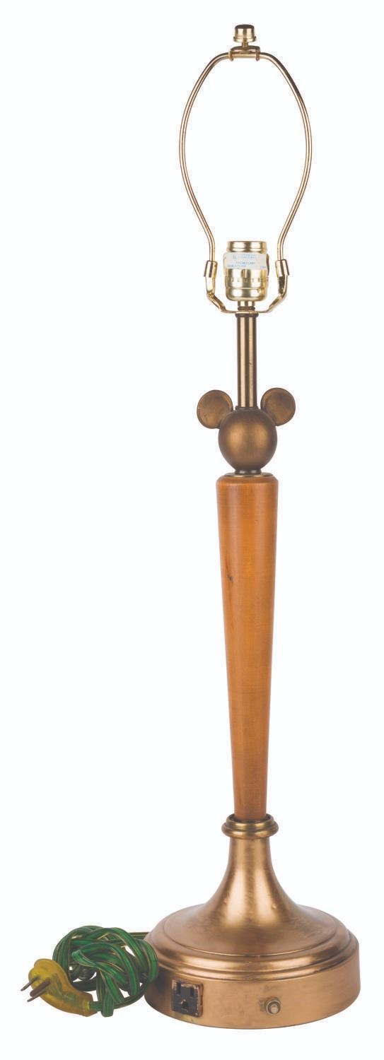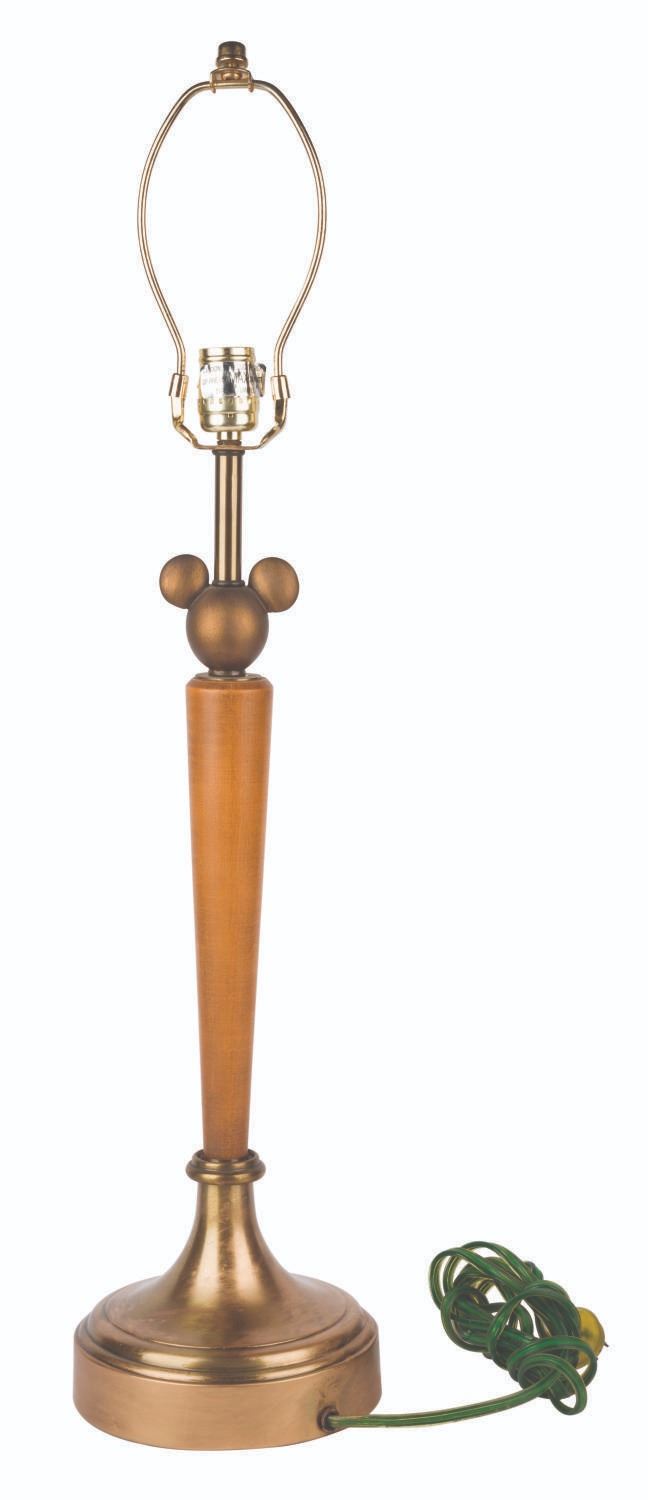 (Disneyland, 2001) A stylized Mickey Mouse desk lamp from the Disneyland Hotel. This metal and wood lamp features a gold-tone Mickey's head on top of the neck. The lamp’s switch is stuck in the “On” position and functioned when tested with a 100-watt, type “A” bulb (not included). Measuring approximately 18" in diameter and 31" tall, the lamp displays in very good condition with a chip on the neck and Mickey’s left ear, and very light tarnish to the brass lamp shade bracket.