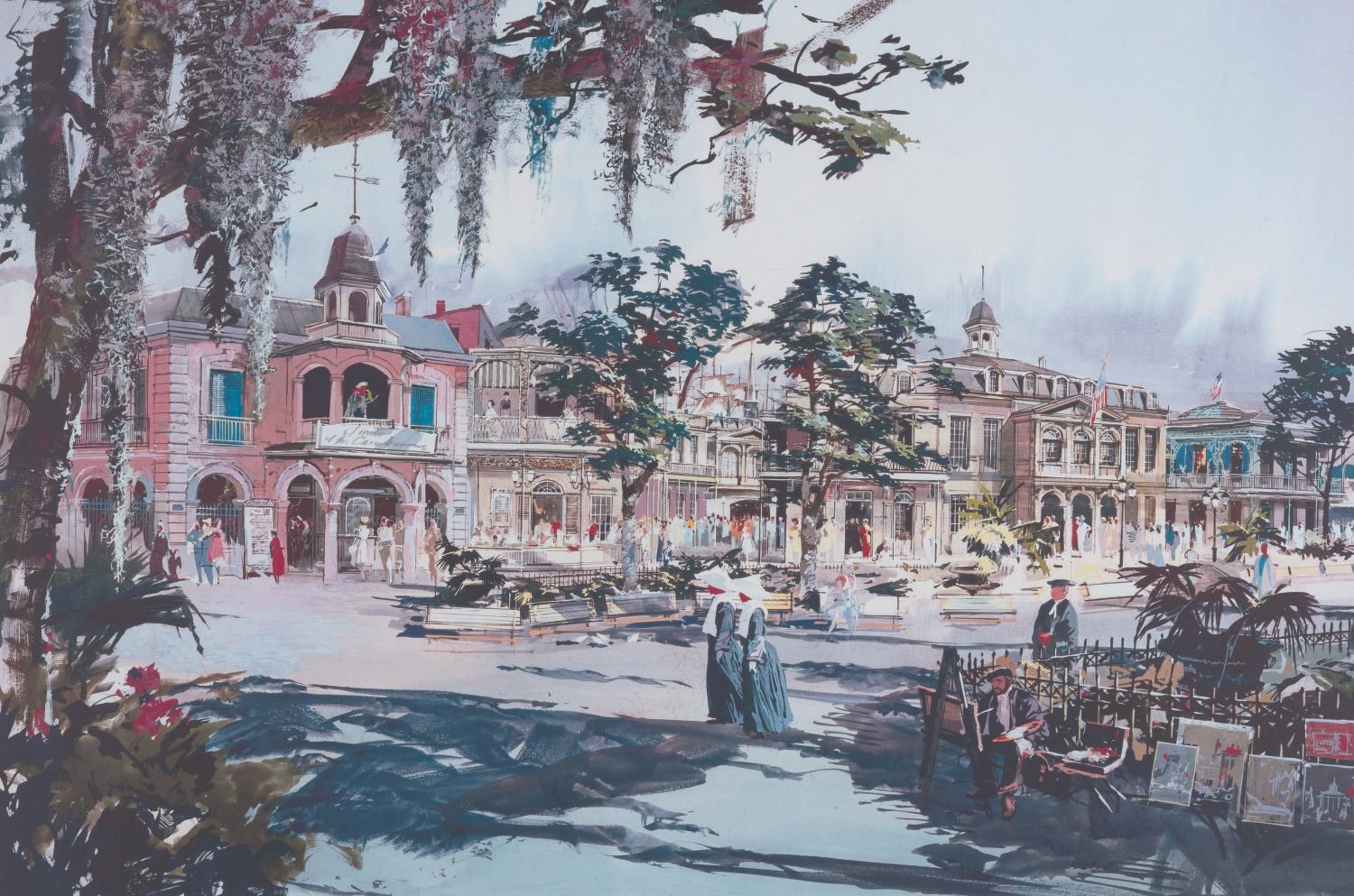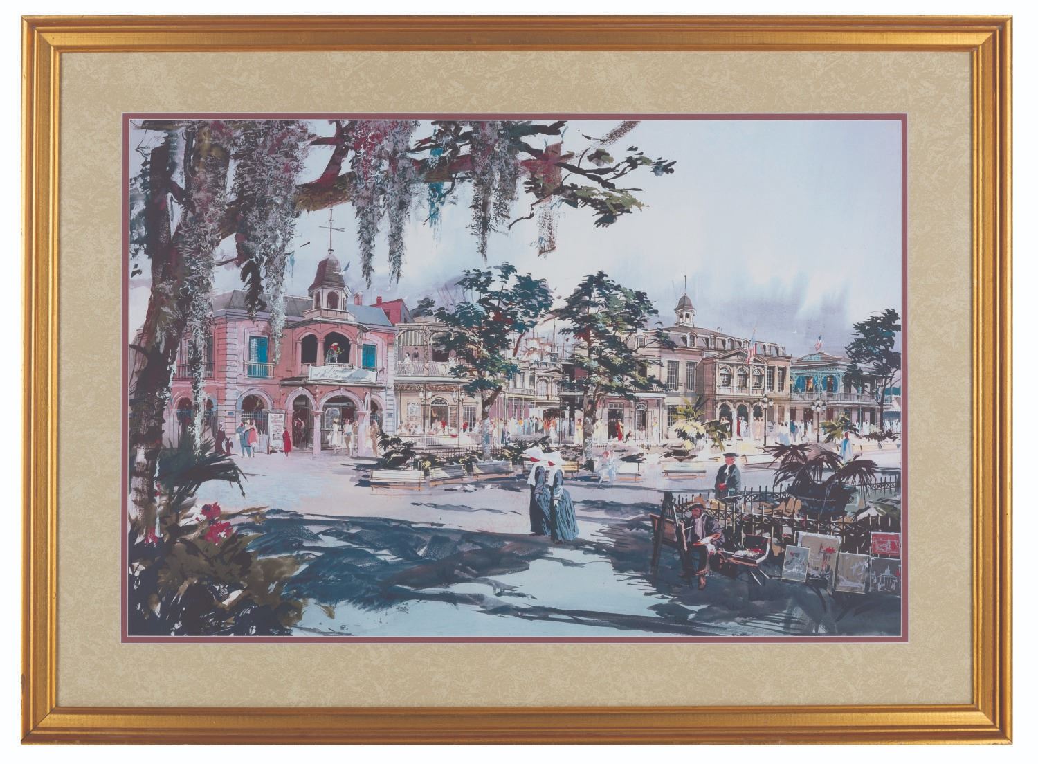 (Disneyland Hotel, 2000s) A framed print of Imagineer Herb Ryman's concept art for New Orleans Square at Disneyland. This high-quality print was displayed in the Disneyland Hotel. The artwork has an image size of 19.75" x 29.5" within its 28" x 38" gold-tone original frame. The print is in very good condition, with the frame in good condition exhibiting some scuffs and light wear from Hotel display.