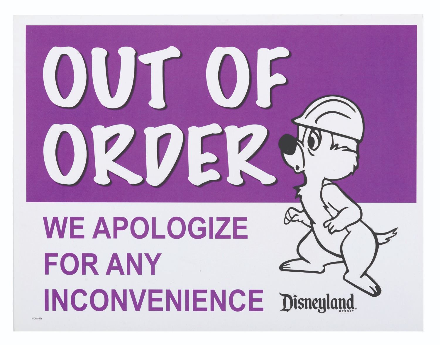 (Disneyland Hotel, 2000s) An "Out of Order" sign from the Disneyland Hotel Resorts. The sign features Chip the chipmunk. Measuring 11"x8.75", this cardstock sign is in very good condition faint wear to the edges and corners.
