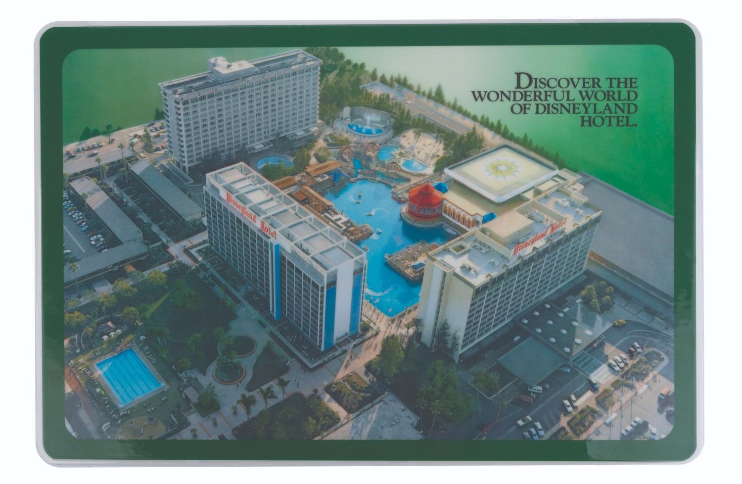 (Disneyland, 1970s-80s) A laminated placemat from the Disneyland Hotel, featuring the three hotel towers and the Marina. Measuring 15.25" x 10.25", the placemat is in very good condition with minor wear from Guest use.