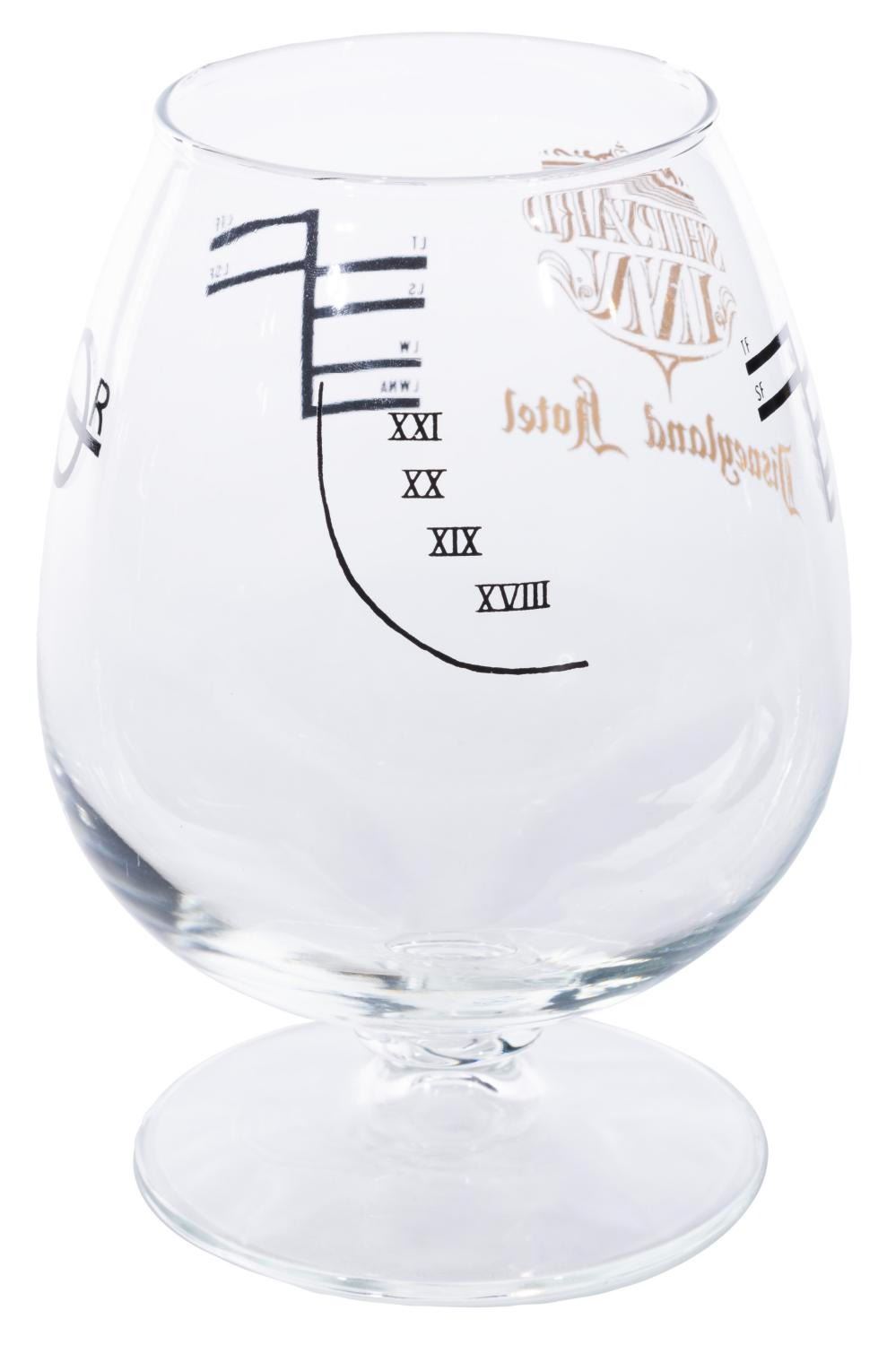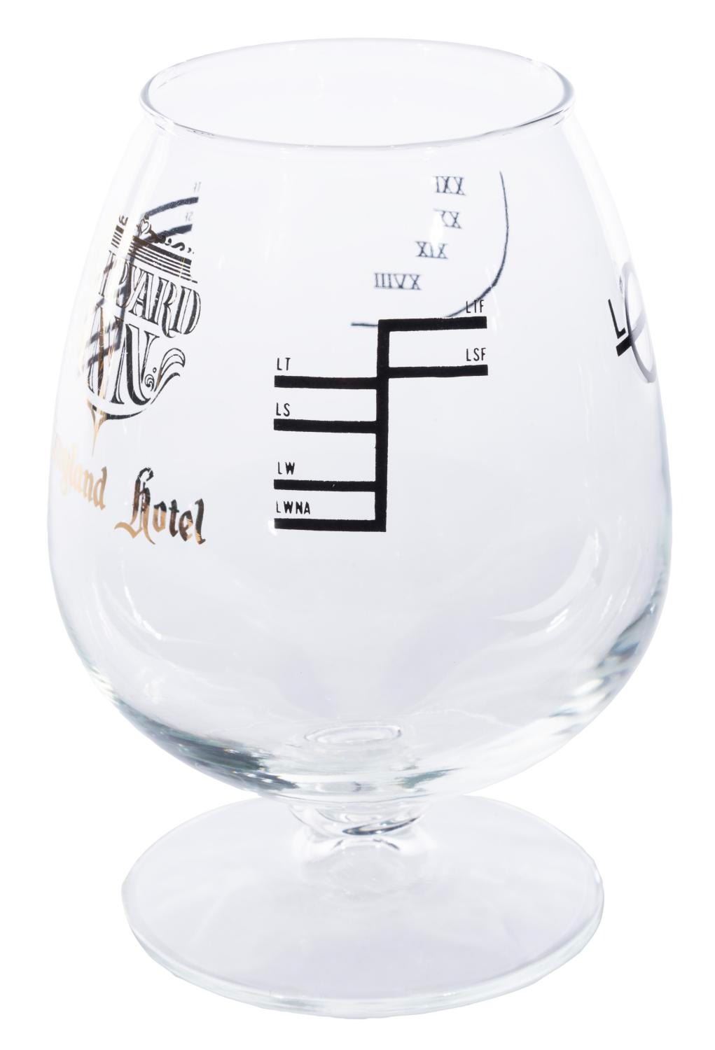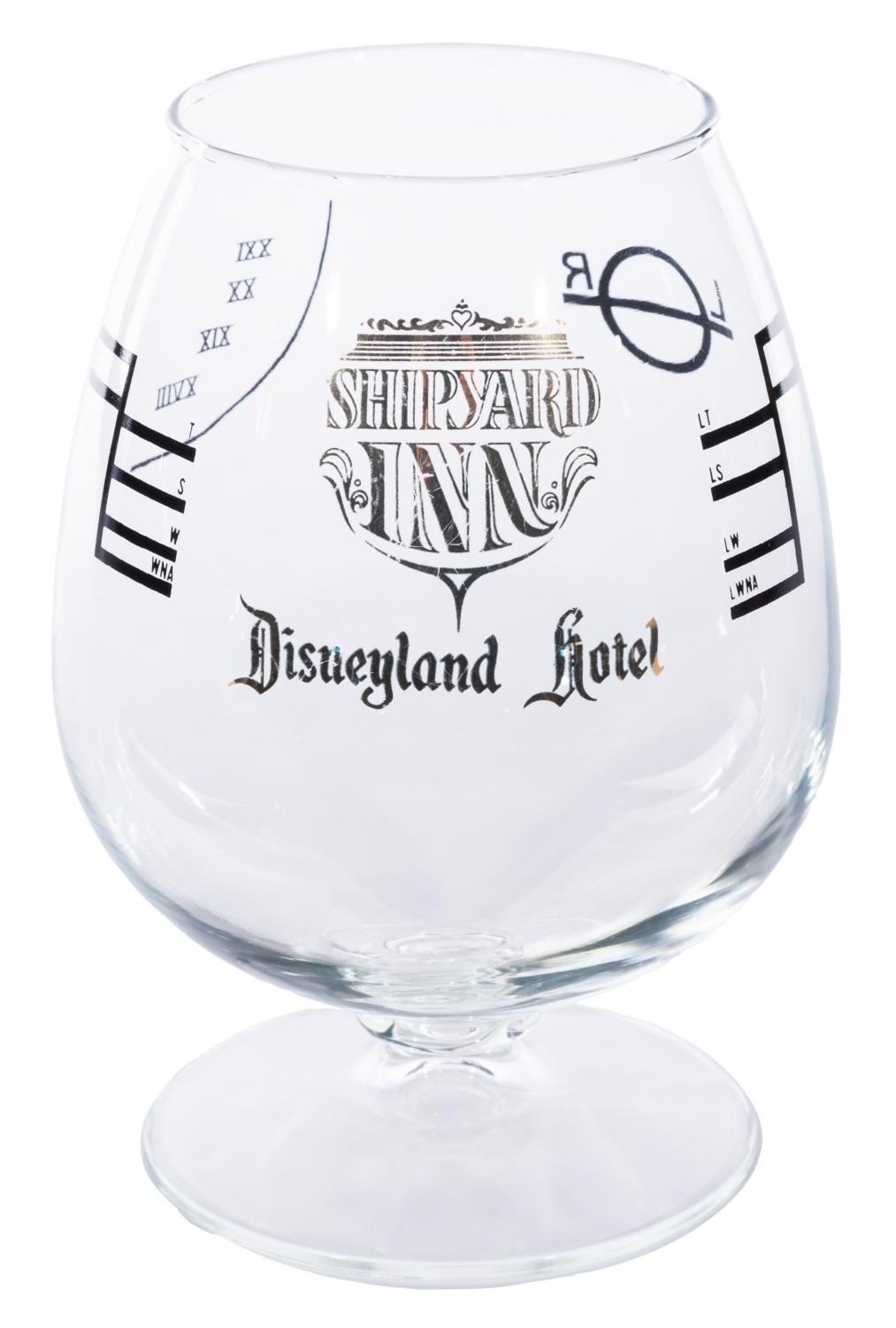 (Disneyland Hotel, 1990s) A Shipyard Inn brandy snifter featuring the restaurant's logo in gold. Measuring 4.5" x 6.25" tall, this piece is in very good condition with light wear to the restaurant's logo and very light wear to the glass.
