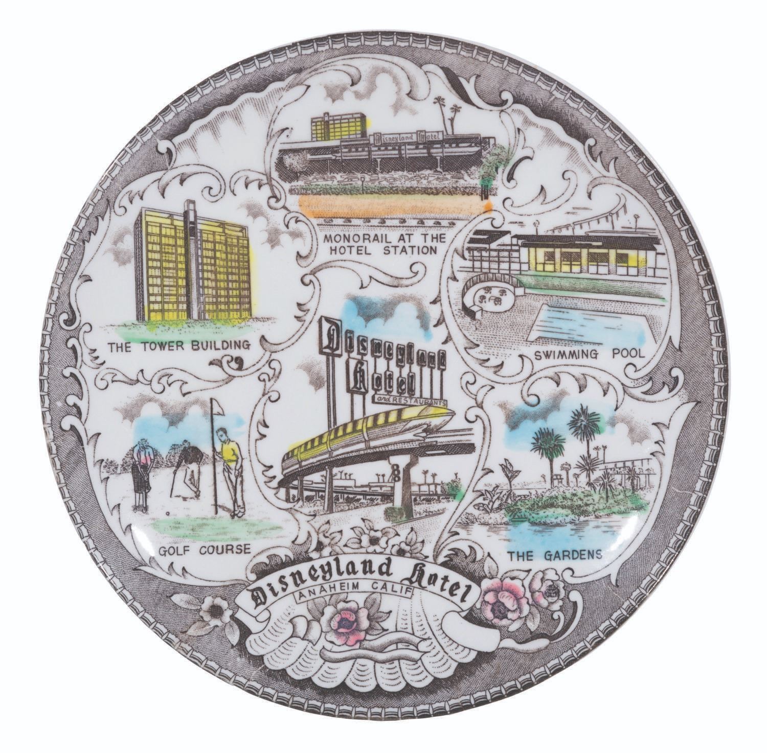 (Disneyland Hotel, 1961-66) A rare ceramic plate souvenir of the Disneyland Hotel. The 1960s era plate features the Tower Building, Golf Course, Monorail at the Hotel Station. Measuring 9.25" in diameter, this plate is in very good condition with light surface wear.