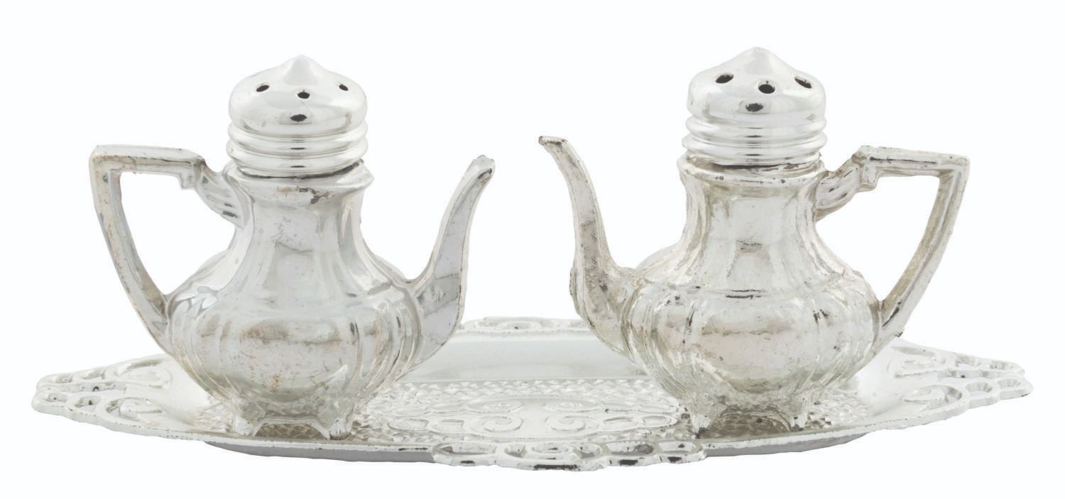 (Disneyland Hotel, 1960s) An unusual set of teapot-shaped salt and pepper shaker souvenirs of the Disneyland Hotel. The set is accompanied by a matching serving tray. Measuring 2"x2" and 4.75"x2", the metal pieces are in fine condition.