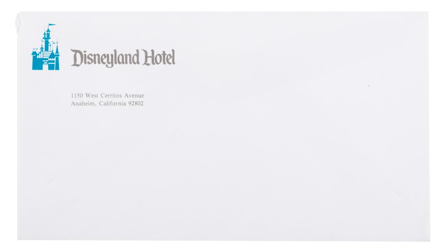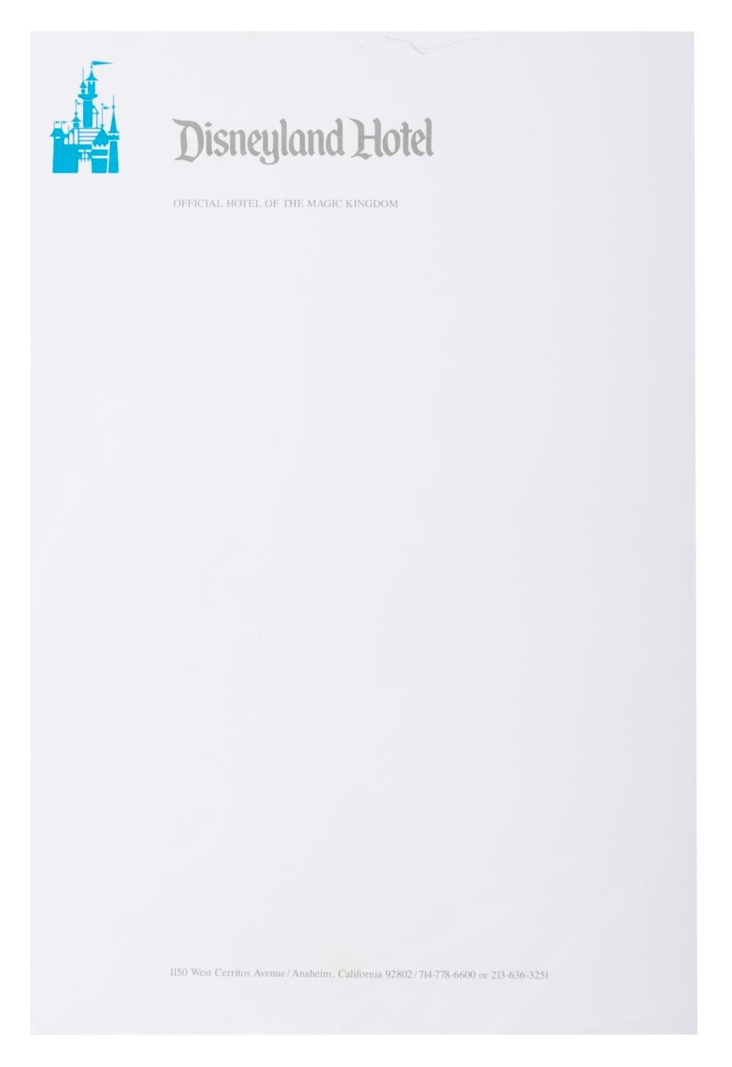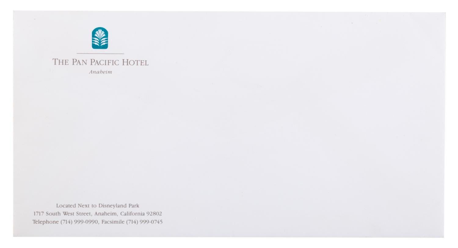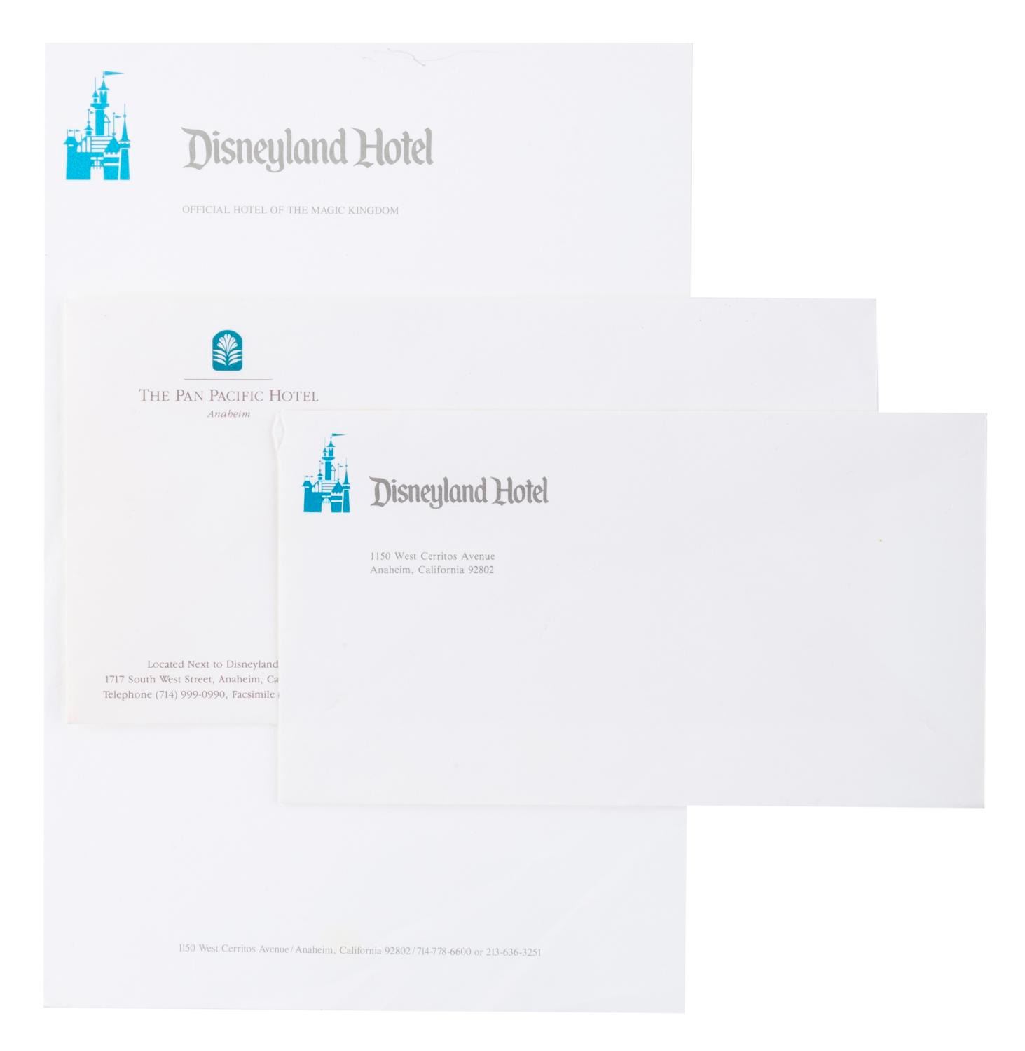 (Disneyland, 1990s) A collection of stationery from Disneyland hotels including a Disneyland Hotel envelope and sheet of note paper and a Pan Pacific Hotel envelope. The Pan Pacific was purchased by Disney in 1995, becoming the Disneyland Pacific Hotel, then Paradise Pier Hotel, and most recently the PixarPlace Hotel. Measuring from 3.5" x 6.5" to 6" x 9", the stationery is in good condition with a small tear to the Disneyland Hotel envelope and faint pencil marks at the top of the note paper.