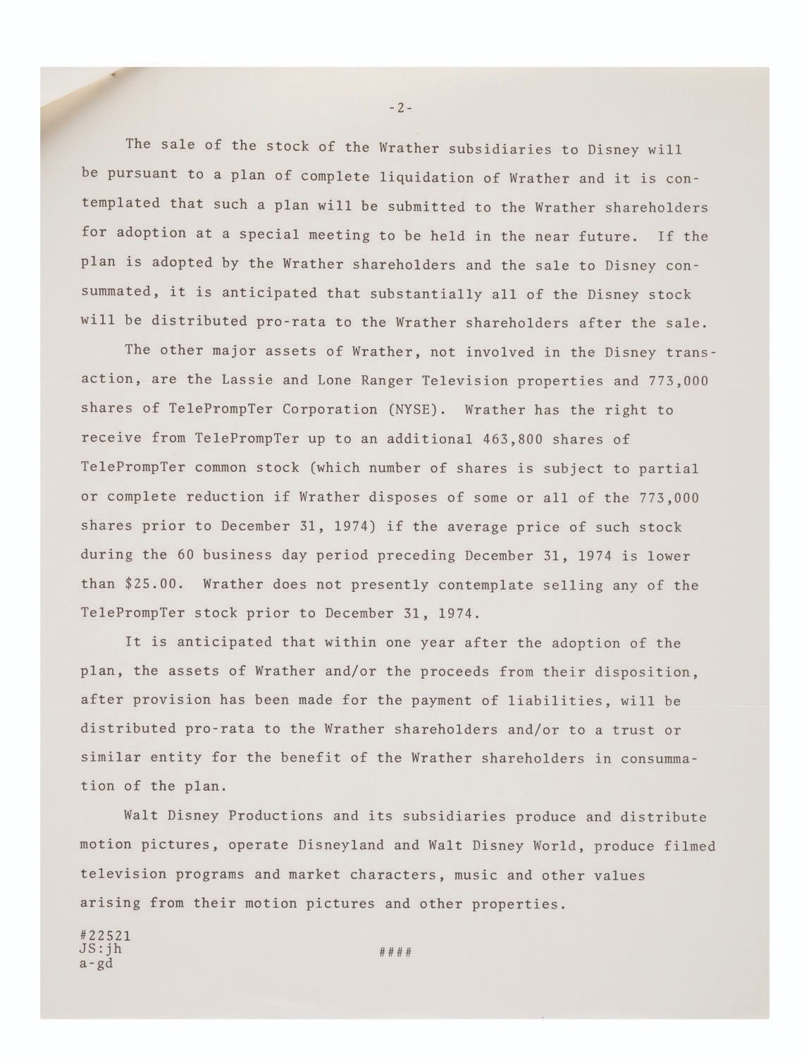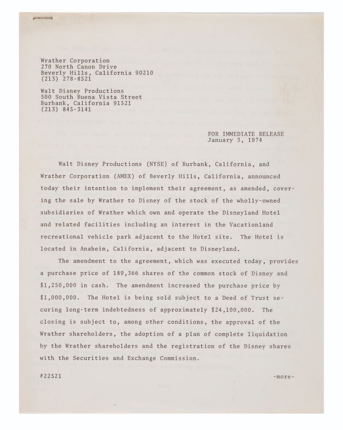 (Disney, 1974) A release letter regarding the approval of a liquidation plan to sell Wrather Corporation subsidiary stock to Walt Disney Productions. The proposed plan included a higher purchase price for Wrather stock and included common Disney stock for Wrather shareholders. Measuring 8.5"x11", the stapled documents are in very good condition with discoloration and wear.