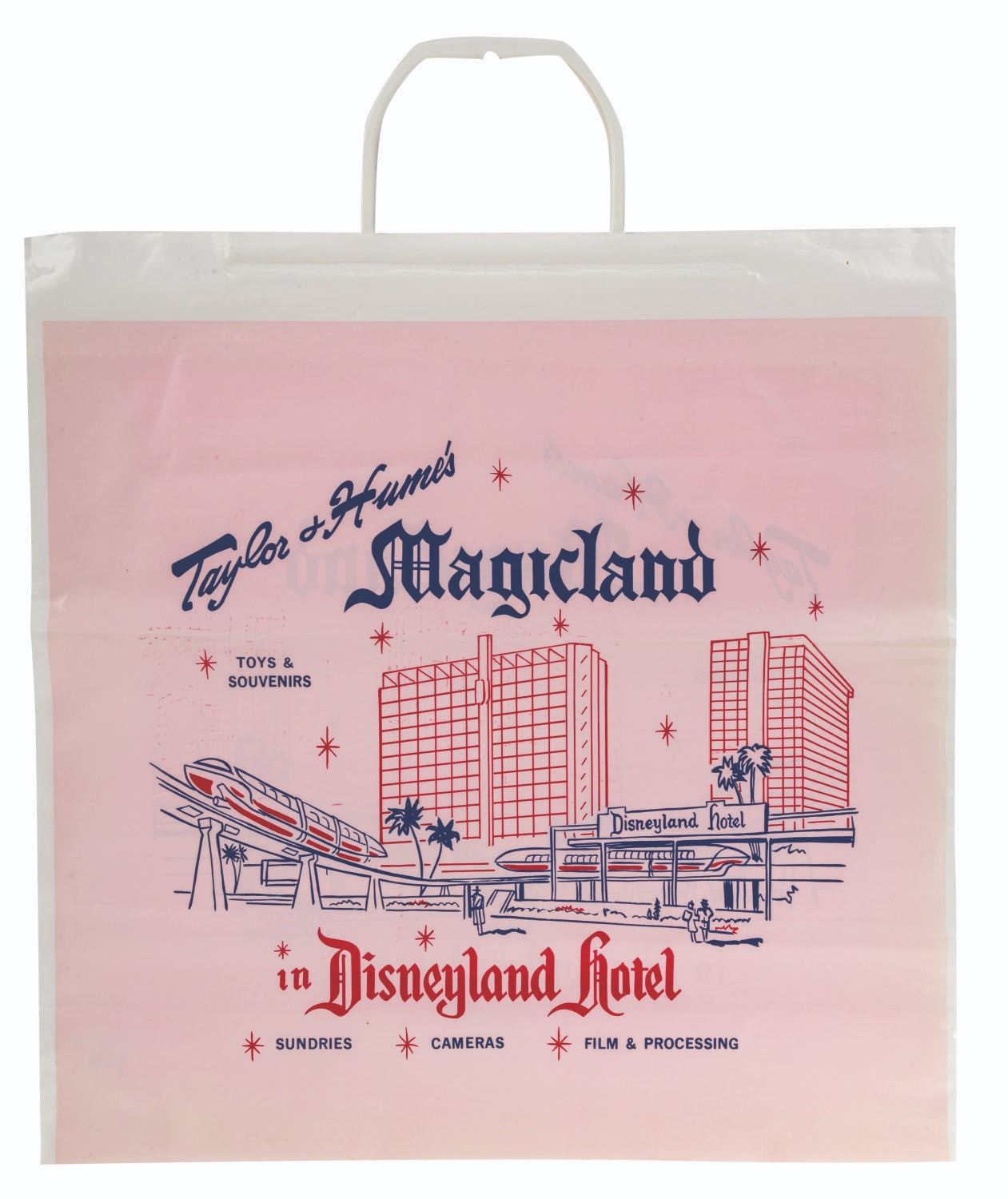 (Disneyland, 1960s-70s) A rare plastic shopping bag from Taylor & Hume's Magicland at the Disneyland Hotel. Measuring 17.5" x 21.5”, the bag is in good condition with some creasing from use and slight color transfer of red lines where left folded.