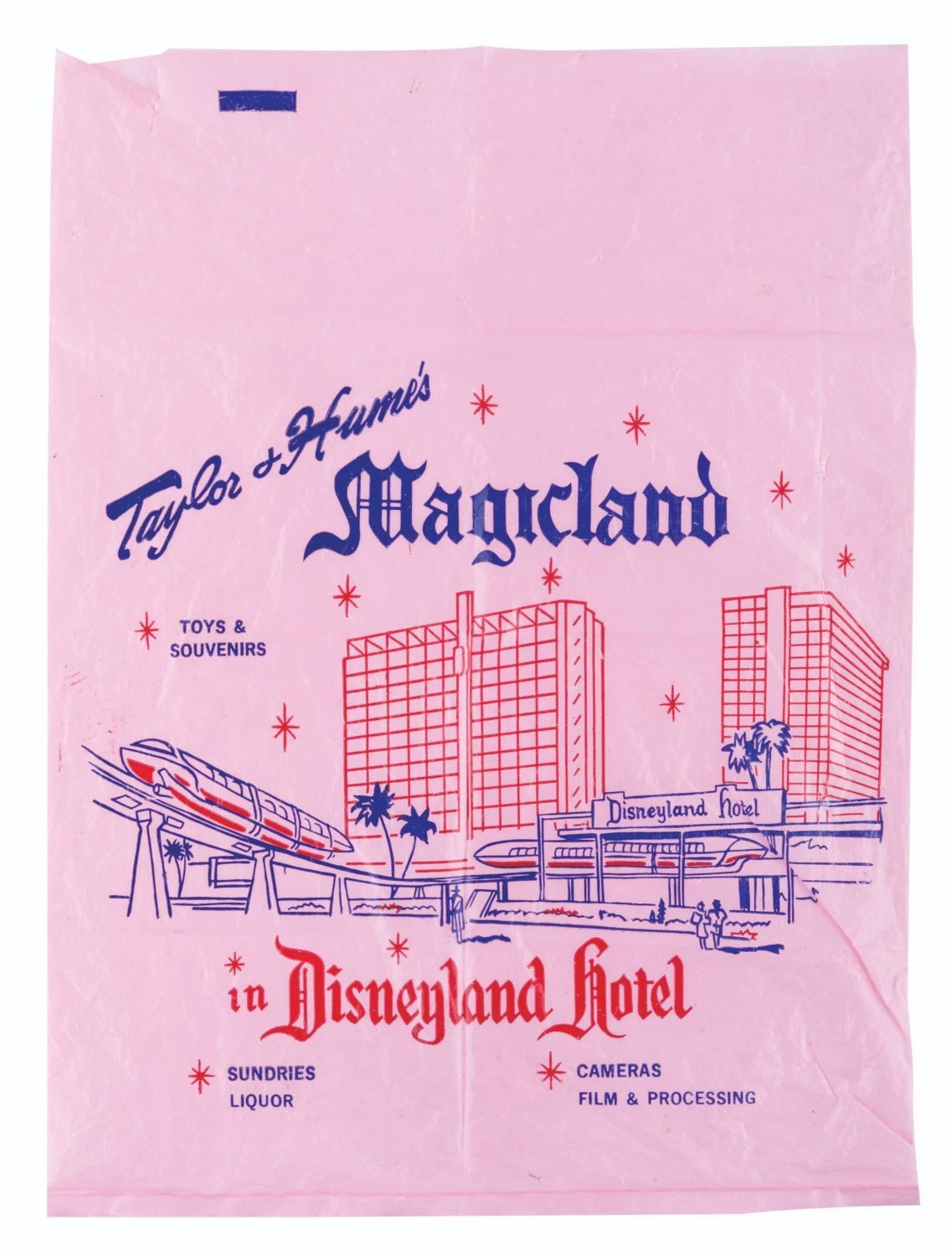 (Disneyland Hotel, 1960s-70s) A rare plastic shopping bag from Taylor & Hume’s Magicland at the Disneyland Hotel. Owners Merv Taylor and James Hume also collaborated with the Park on magic shops in Fantasyland and Main Street, U.S.A. Measuring 11.25” x 15.5”, the bag displays in very good condition with light stains, wear, color transfer, creases, and a 1” tear at the top.