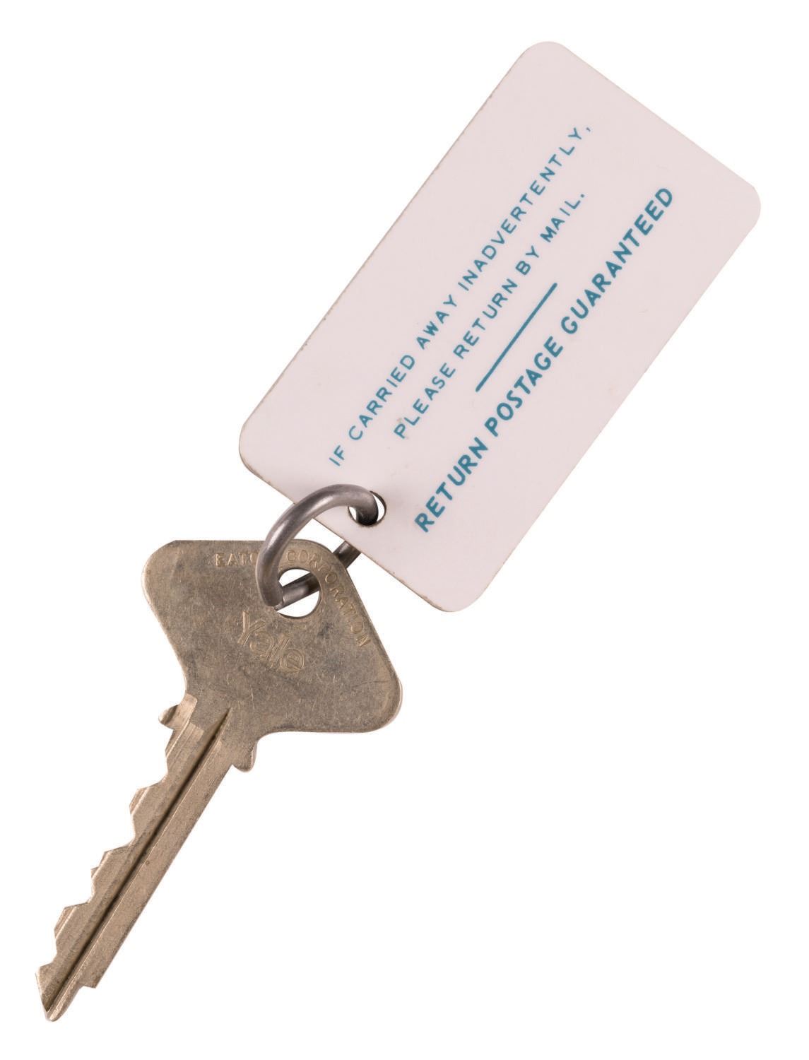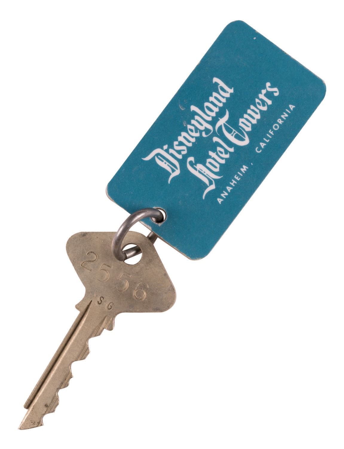 (Disneyland Hotel, 1960s-70s) A key and blue keychain fob from The Disneyland Hotel Towers. The first Disneyland Hotel Tower was constructed in 1961, while the Sierra Tower was added in 1966. The fob measures 2.5"x1.5" while the YALE key is 2.5" long. Each is in very good condition with minor wear scuffs and wear from use.