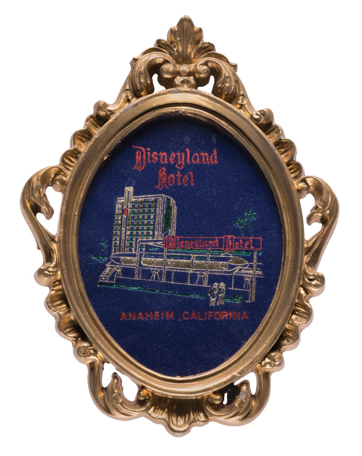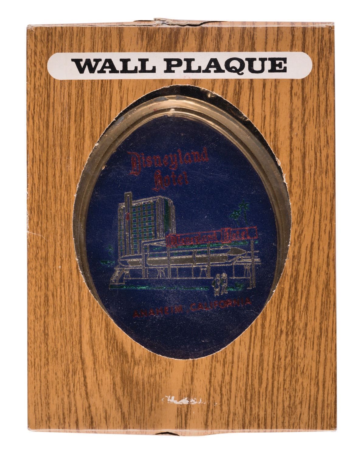 (Disneyland Hotel, 1960s) A vintage Disneyland Hotel wall plaque in original box. The plaque consists of a gold-painted molded plastic frame containing a piece of stamped velvet with an image of the Disneyland Hotel and Monorail station. The plaque retains its original cardboard box packaging with a Taylor & Hume Disneyland Hotel price tag sticker on the reverse. Measuring 7.25"x5.5", the plaque is in very good condition with some paint loss around the edges of the frame and some surface tearing, scuffing, denting, and wear to the box.