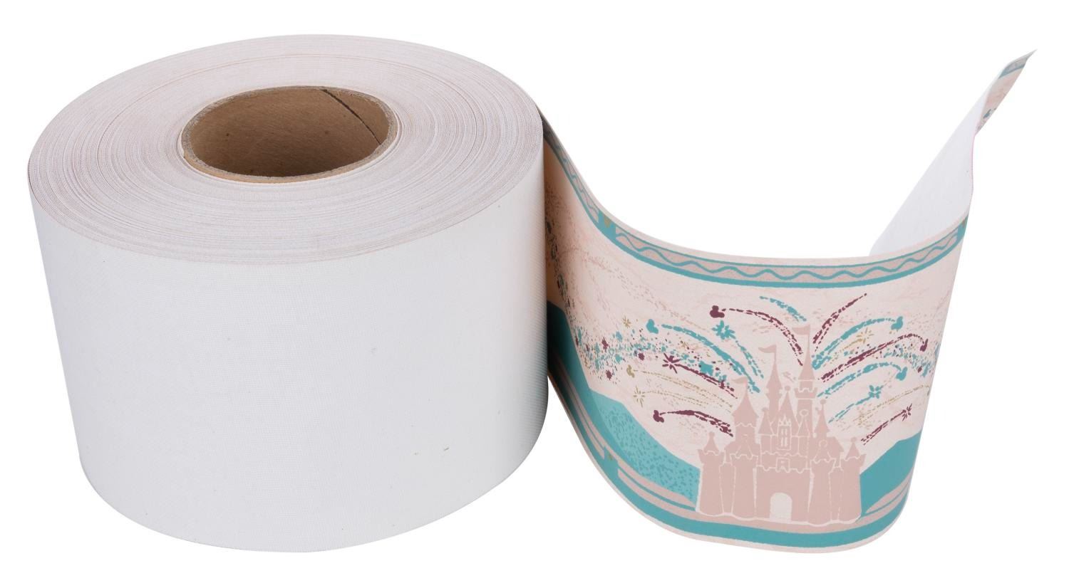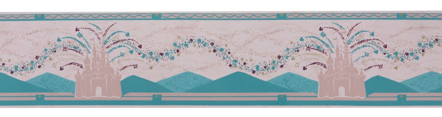 (Muharram, 2000s) A roll of wallpaper border from the Disneyland Hotel featuring fireworks, Hidden Mickeys, and Sleeping Beauty Castle. Measuring 5" wide, the border is in overall very good condition with minor wear.
