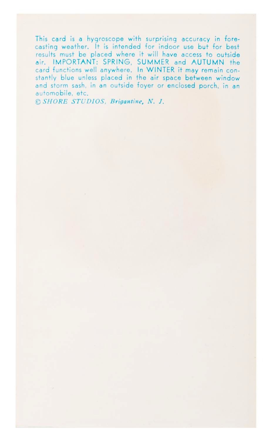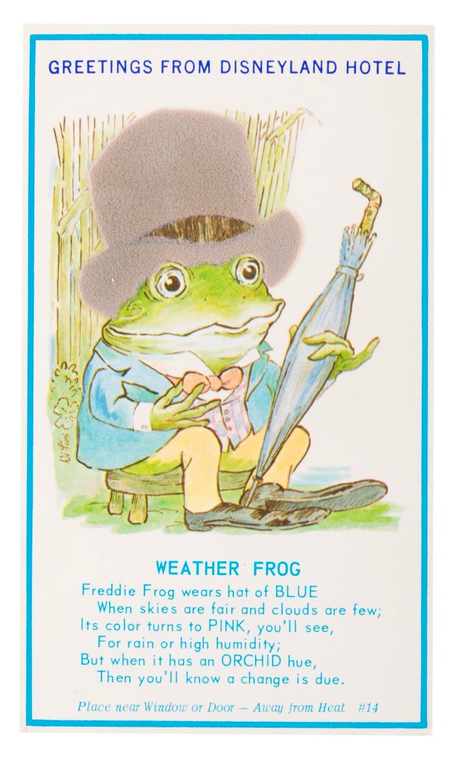 (Disneyland, 1960s) A #14 "Weather Frog” hygroscope card from the Disneyland Hotel. These cards would change color to reflect the current weather and were intended for indoor use. Measuring 6" x 3.5", the card is in very good condition. The hygroscope has changed to an orchid tone, indicating that it needs to be replaced with a new one.