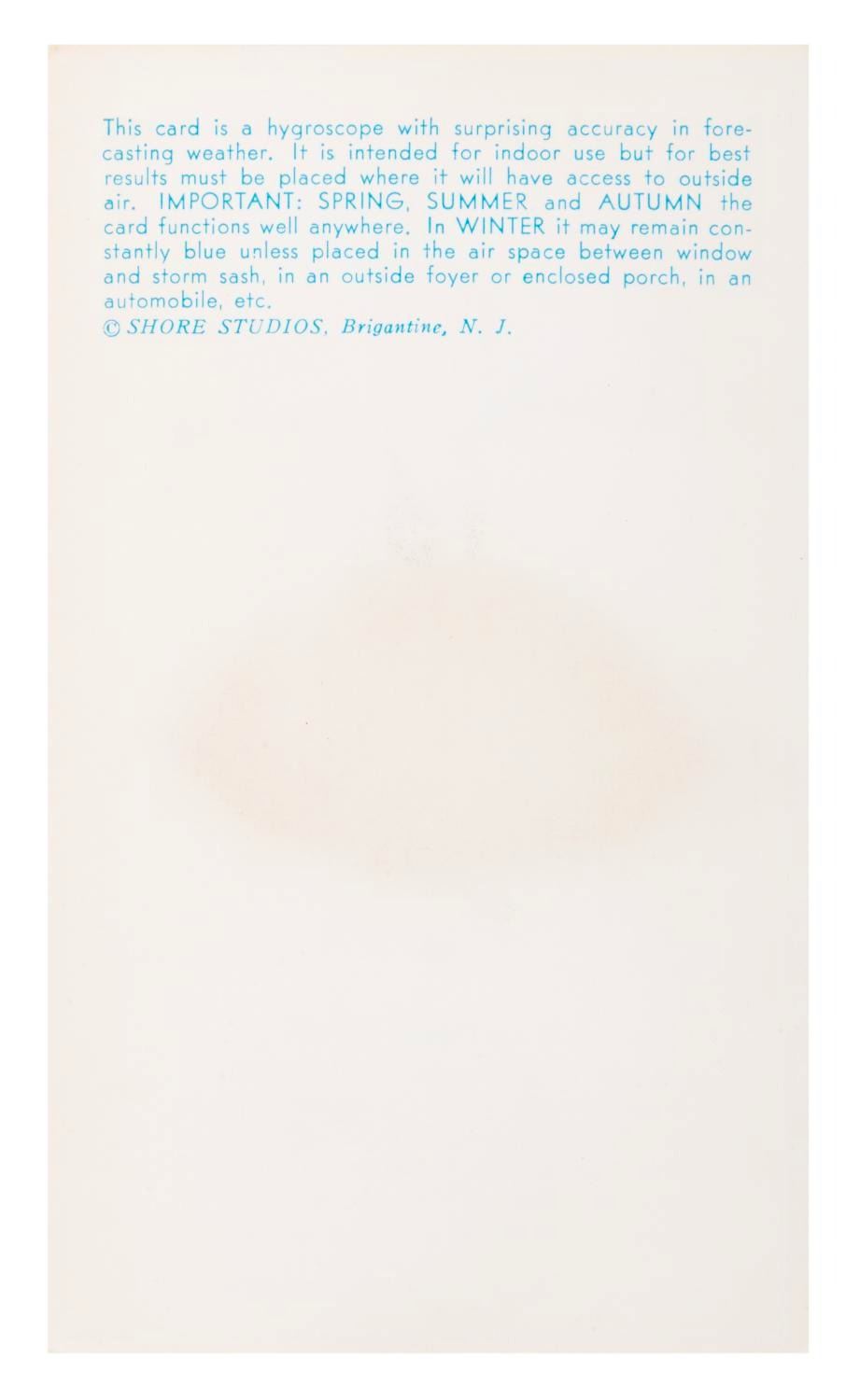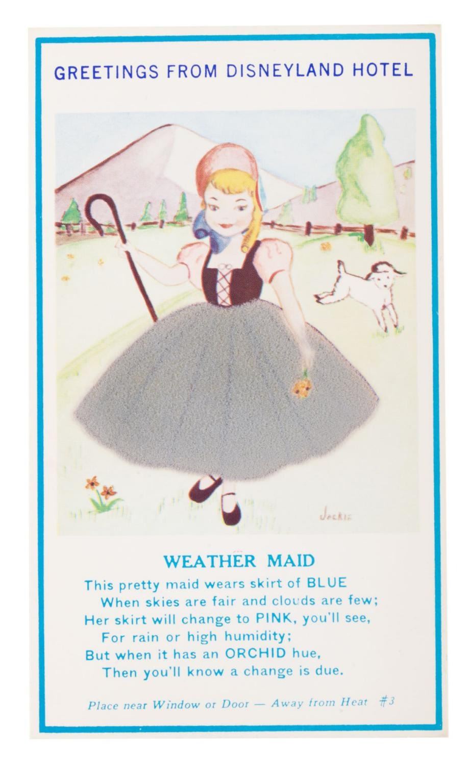 (Disneyland, 1960s) A #3"Weather Maid” hygroscope card from the Disneyland Hotel. Cards like these would change color to reflect the current weather and were intended for indoor use. Measuring 6" x 3.5", the card is in good condition. The hygroscope has changed to an orchid tone, indicating that it needs to be replaced with a new one.