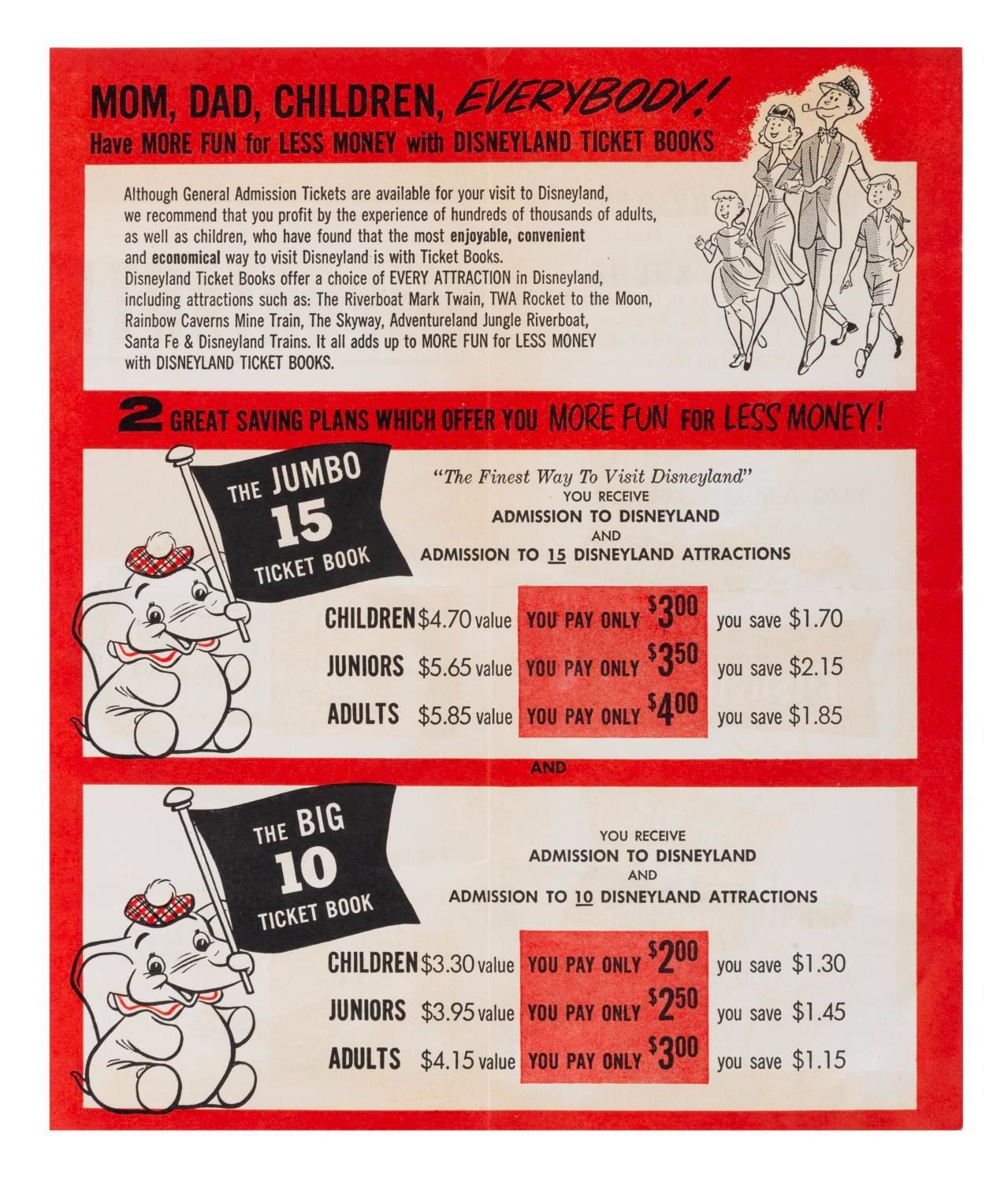 (Disneyland, 1957-61) A collection of four early Disneyland Main Gate "Important" information brochures about admission ticket prices, hours, and special events. Measuring 5.75"x9.5" and 4.5"x10", these pieces of Disneyland ephemera are in very good condition with yellowing and wear.
