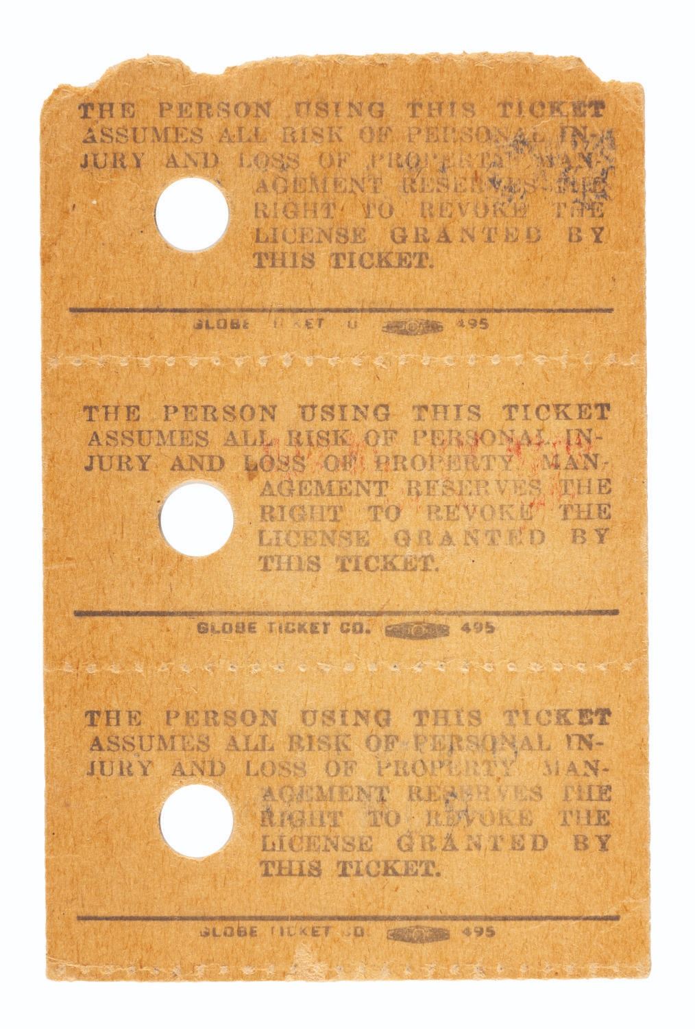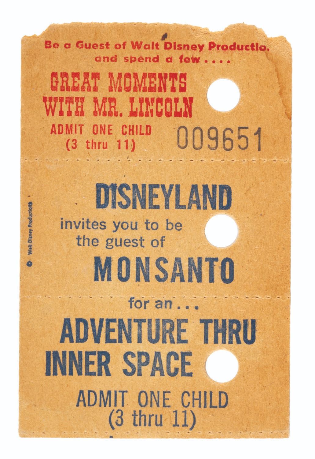 (Disneyland, 1970s) A ticket with punched stubs for Great Moments with Mr. Lincoln and Monsanto Adventure Through Inner Space. The tickets were printed circa 1972 when Monsanto’s Adventure Through Inner Space operated as a free attraction and before Great Moments with Mr. Lincoln was replaced by The Walt Disney Story. Measuring 3"x2", the tickets are numbered "009651," and are in very good condition with a small stain along one edge, light wear, and punches through each one.