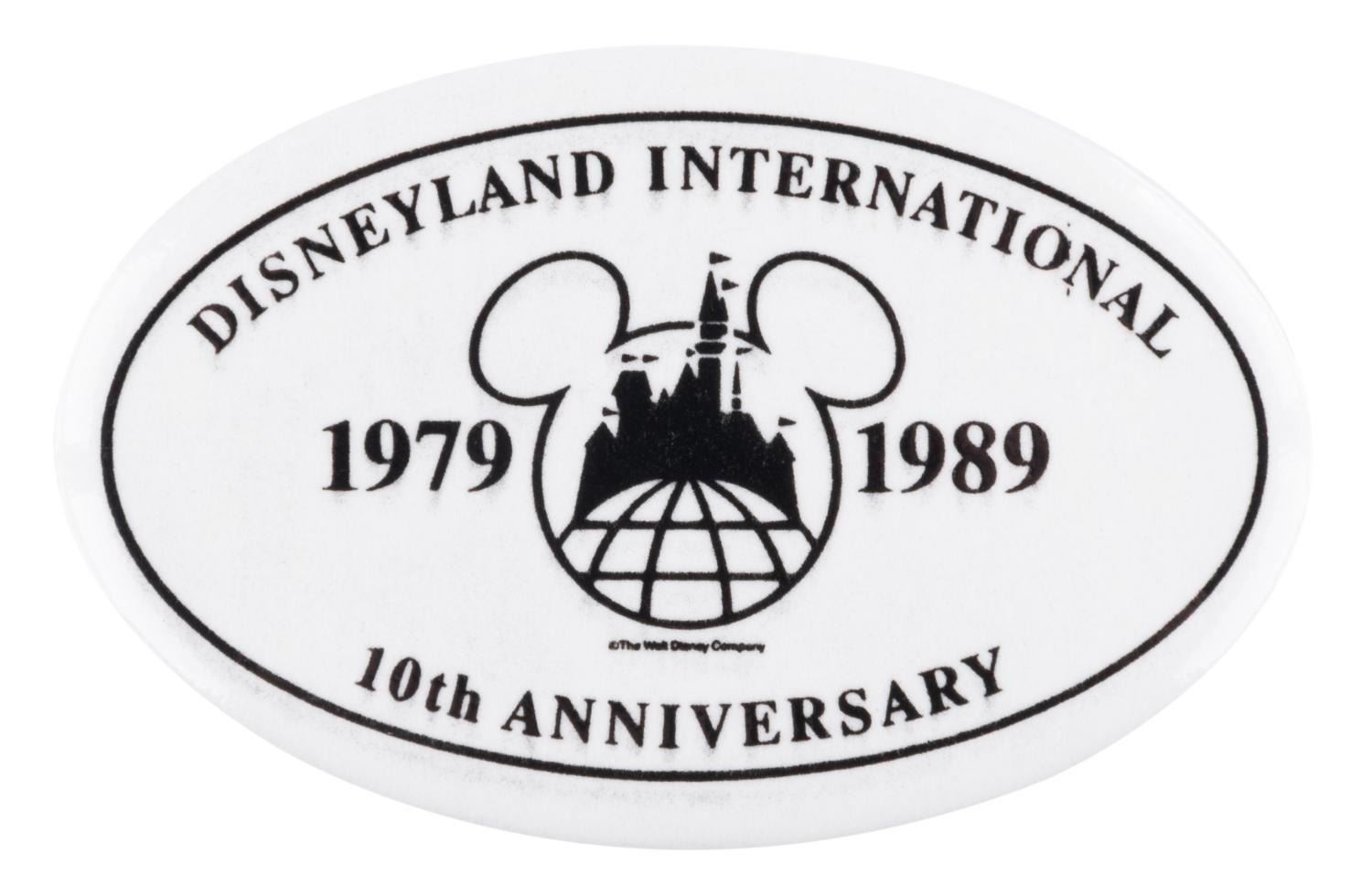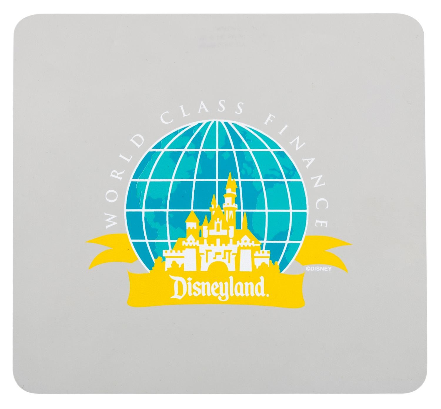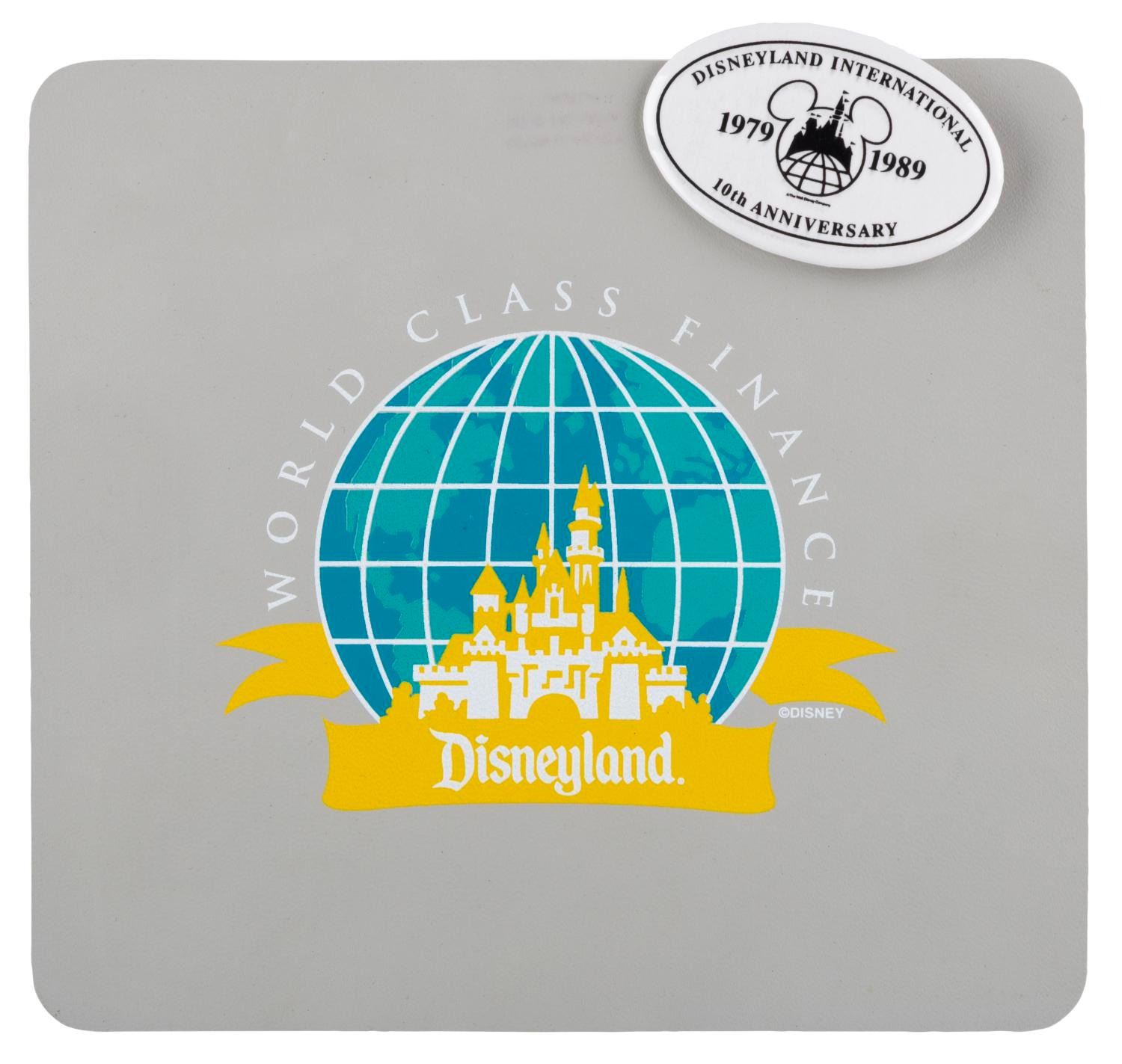 (Disneyland, 1980s) A Disneyland International 10th anniversary button and "World Class Finance" Mousepad. Measuring 7.5" x 7.5" and 2.75" x 1.75", the pad and button are in very good condition.