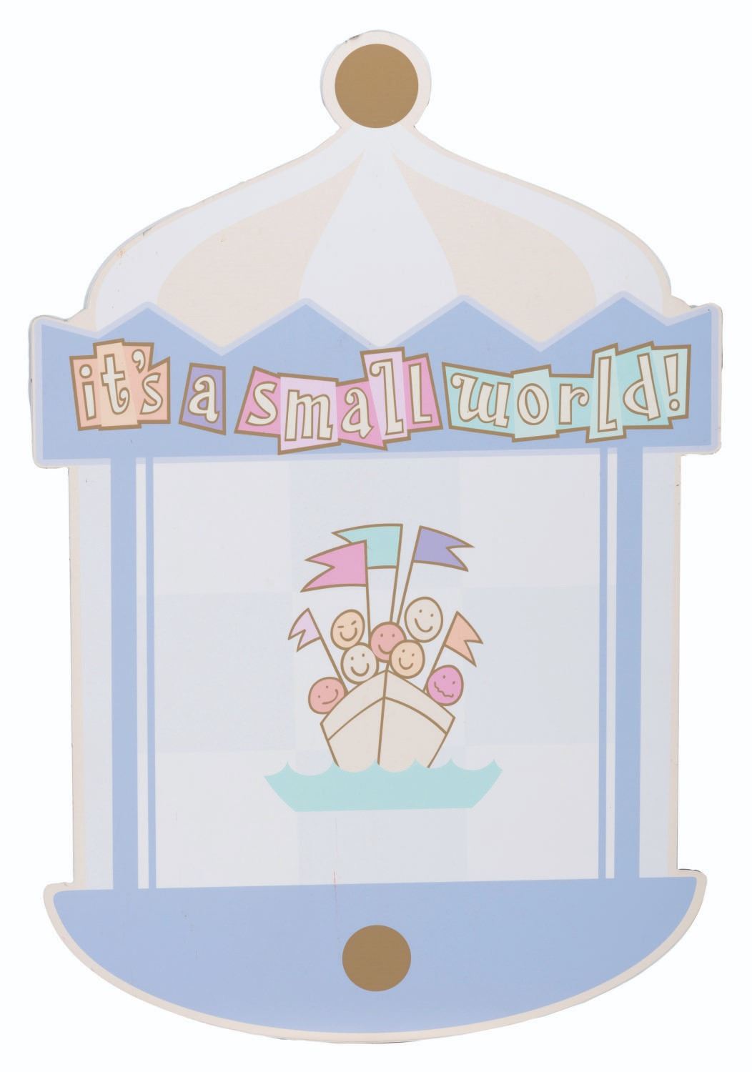 (Disneyland, 2000s) An It's A Small World sign most likely for a special event or temporary use. The 21.5" x 31.5" sign is constructed of two thin metal pieces sandwiched over a board with velcro on the reverse for display. The sign is in very good condition with some light fading and small dents and scratches to the metal, mainly along the top and edges.