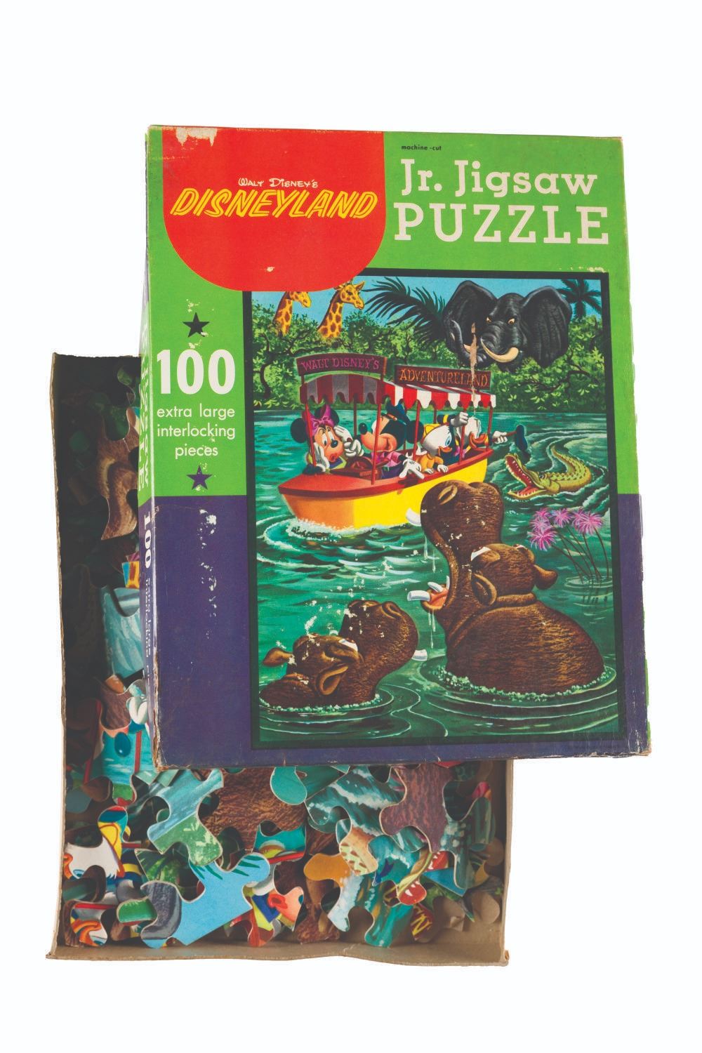 (Whitman, 1960s) A 100-piece Walt Disney’s Disneyland Jungle Cruise Jr. Jigsaw Puzzle of Mickey, Minnie, and Donald riding the attraction. The puzzle is complete, with one piece showing much wear, and the rest in good condition. The 8.5" x 11" x 1" box is in good condition with typical scuffs and edge wear.