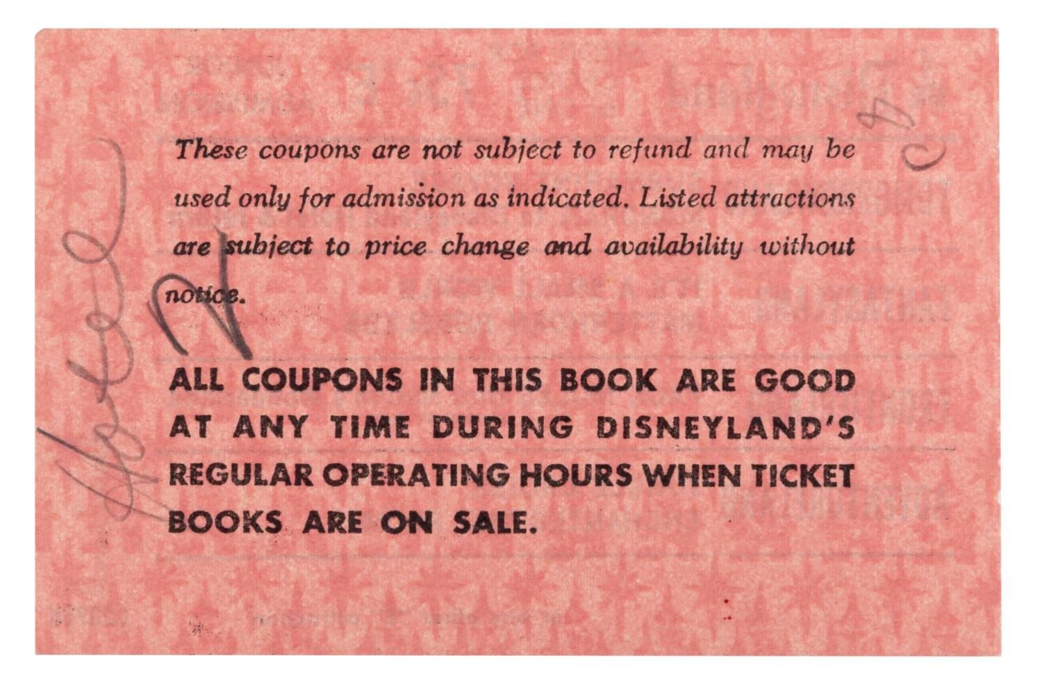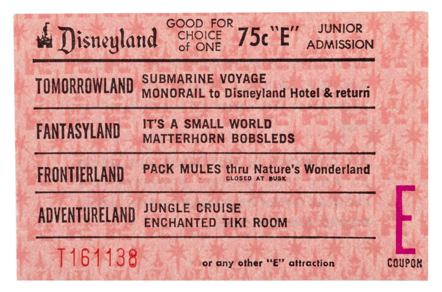 (Disneyland, 1960s) A junior admission "E" ticket that could be used for Disneyland attractions Submarine Voyage, the Monorail, It's a Small World, Matterhorn Bobsleds, Pack Mules through Nature's Wonderland, Jungle Cruise, and Walt Disney's Enchanted Tiki Room. Measuring 2.5" x 4", ticket number T161138 is in very good condition with pencil notations on the reverse.