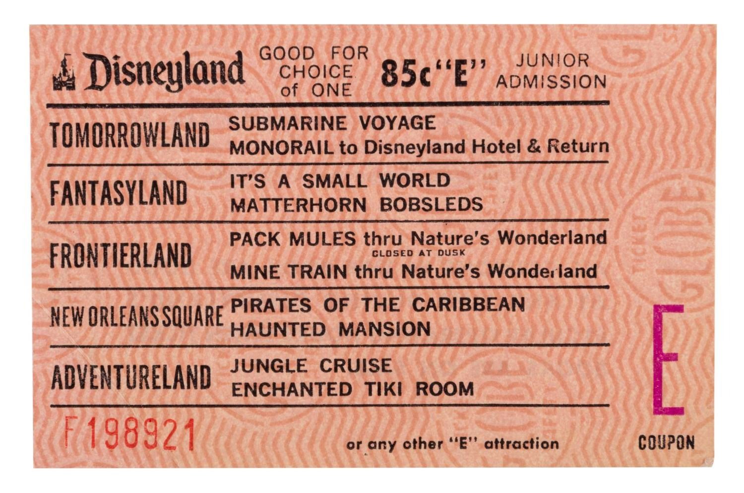 (Disneyland, 1970s) A junior admission "E" ticket from the early 1970s, which added the newly-opened The Haunted Mansion. Measuring 2.5" x 4", ticket F198921 is in very good condition with pencil notations on the reverse and a fold in the lower left corner.