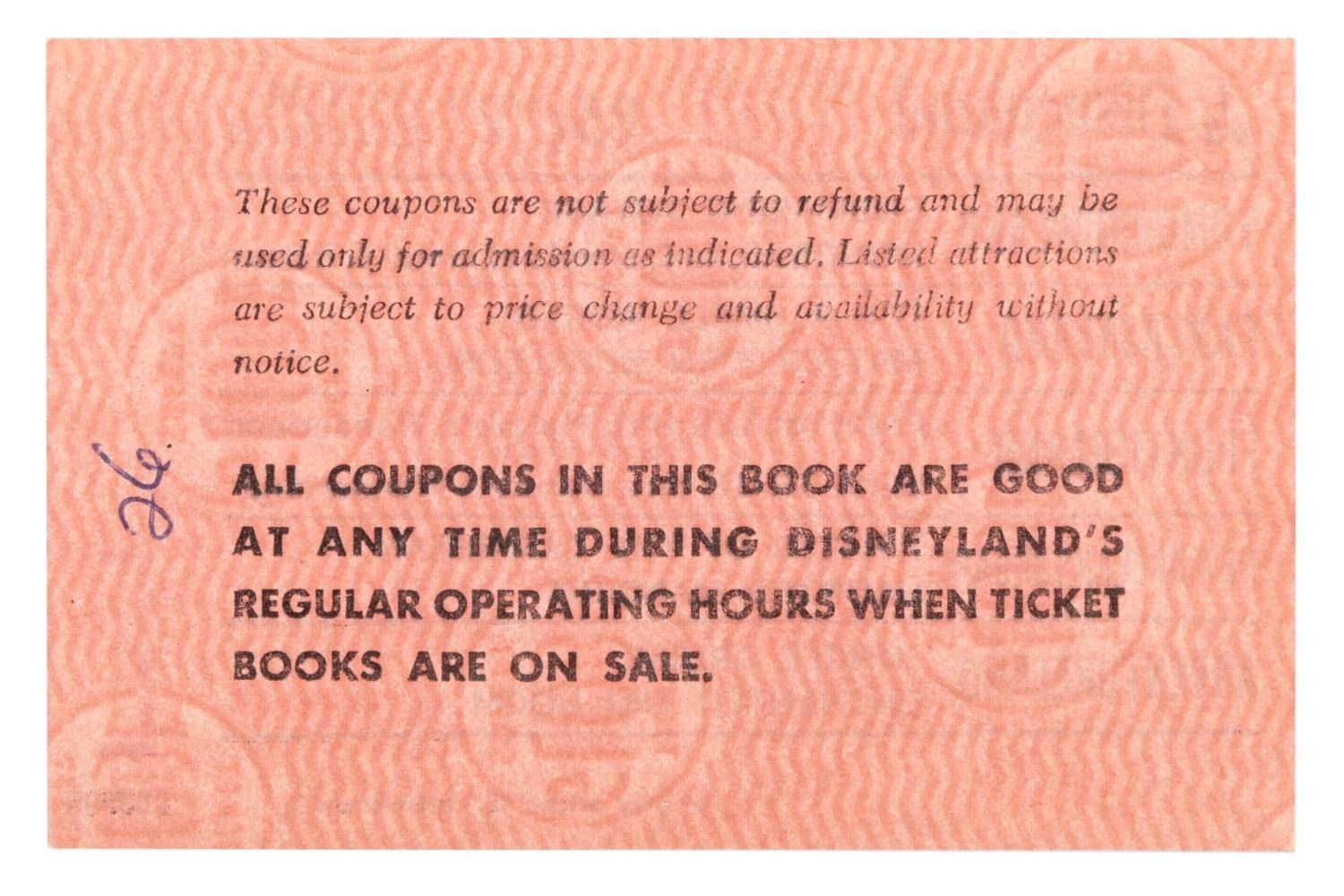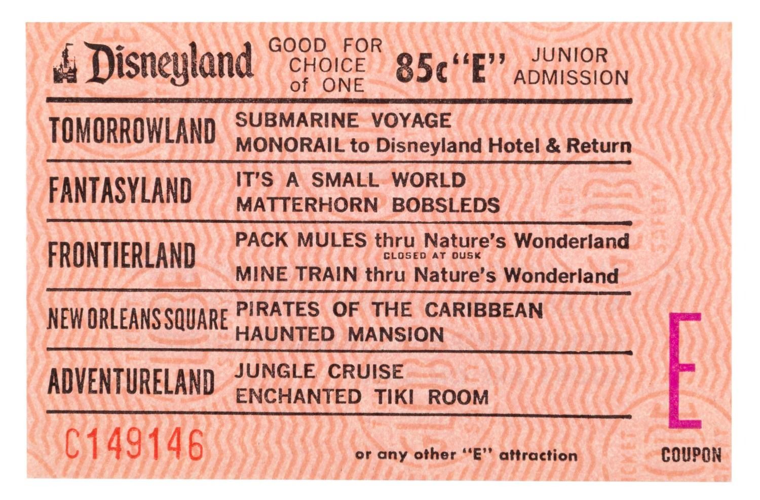 (Disneyland, 1970) A Junior admission “E” ticket from the summer of 1970, after the Haunted Mansion was added in May, but before the Pack Mules were removed in September. Measuring 2.5” x 4”, the ticket is in very good condition with a small number written on the back in ink.