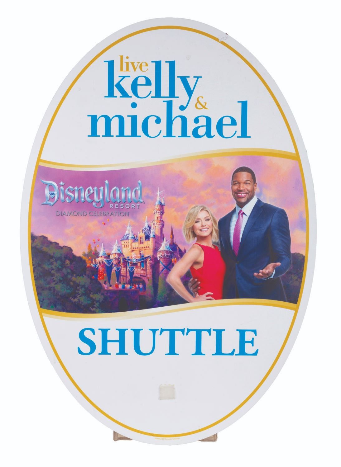 (Disneyland, 2015) A sign identifying the audience shuttle stop for the “Live with Kelly and Michael” broadcast from the Disneyland Resort’s Diamond Celebration. Measuring 22” x 32”, the sign is in good condition with velcro taped to the front and back, scratches, and wear from Park use.