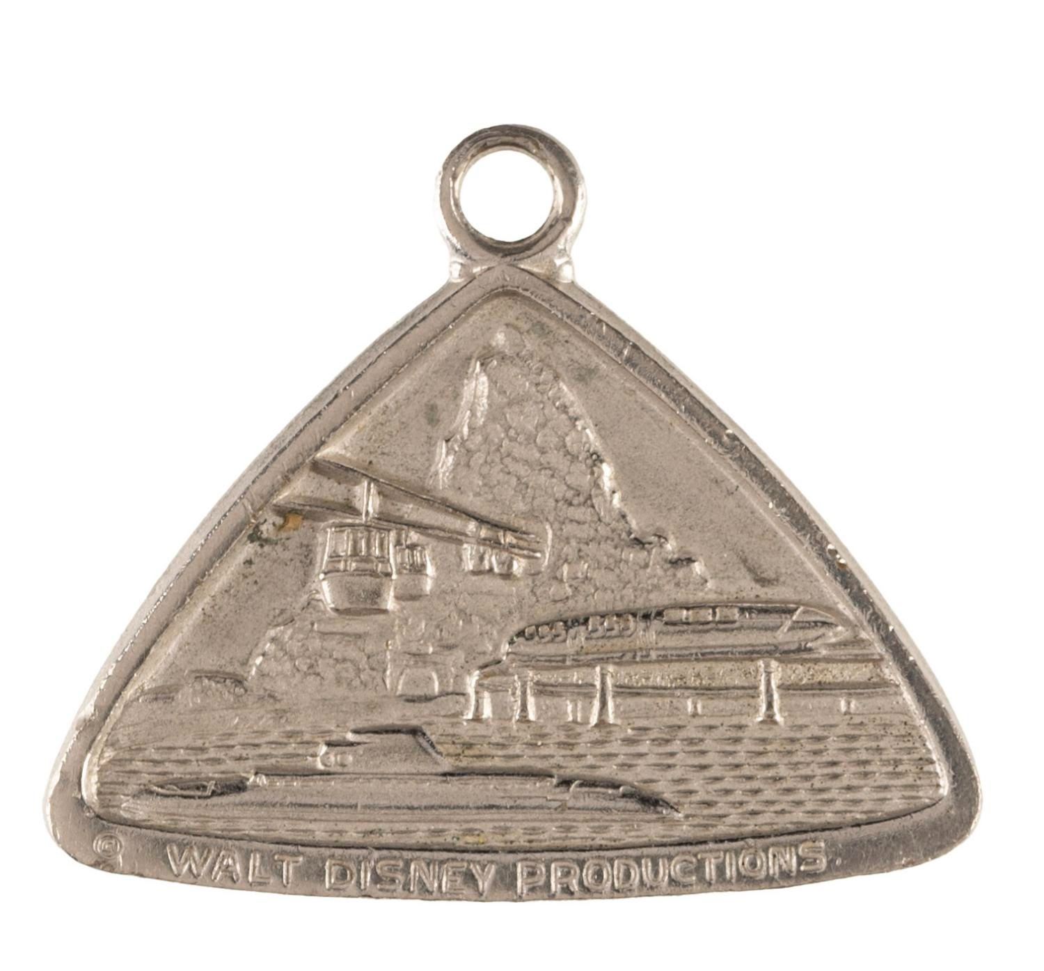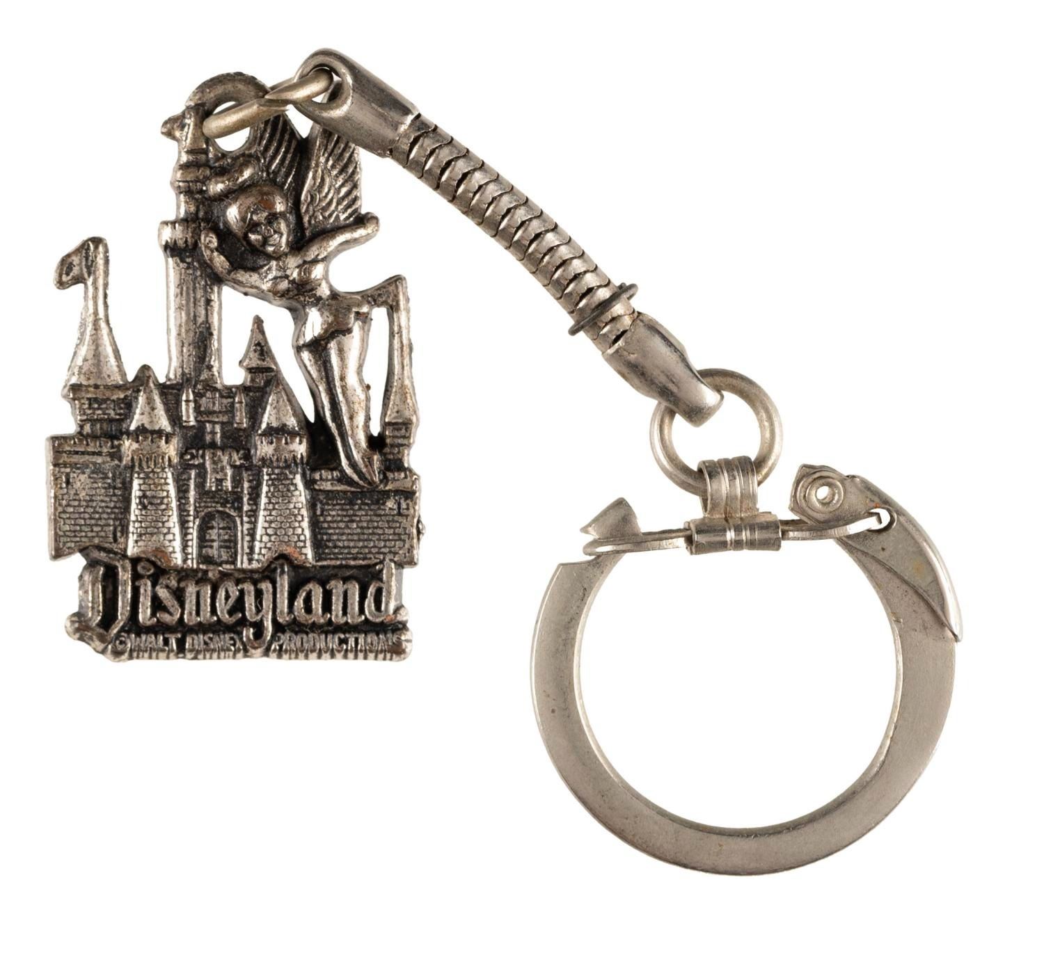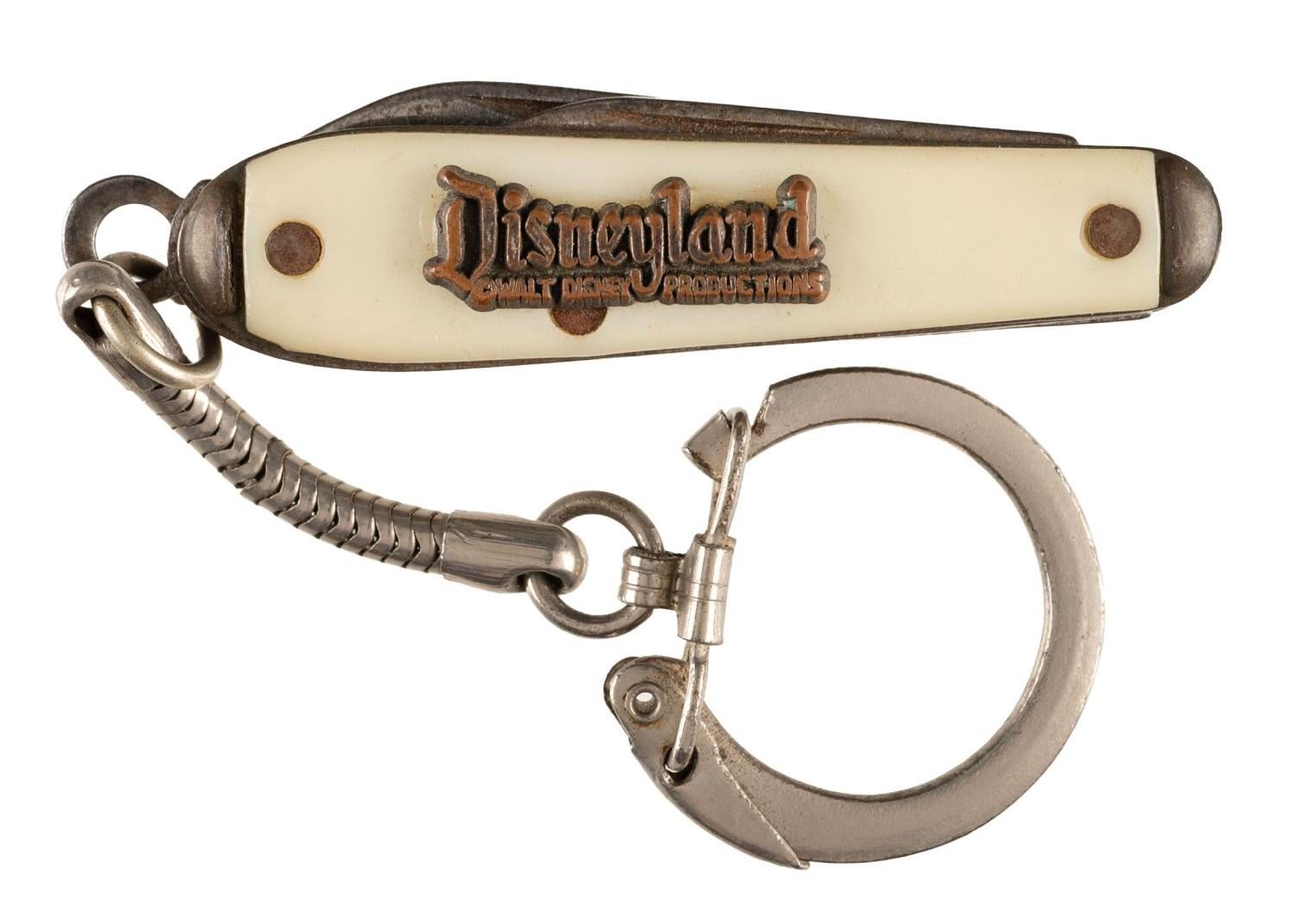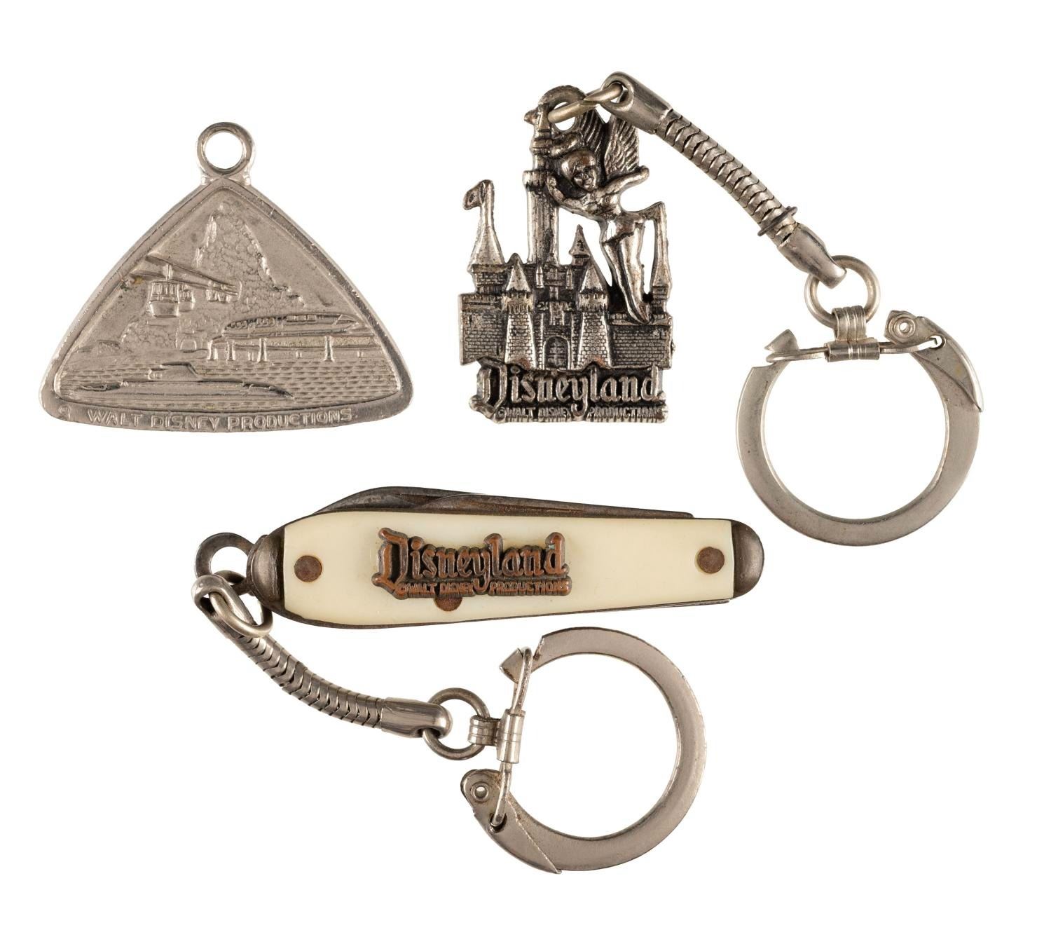 (Disneyland, 1950s-60s) A Tomorrowland keyring, a Sleeping Beauty Castle and Tinker Bell keyring, and a pocket knife keyring from Disneyland. The pocket knife measures 2" long (when closed), and the keyring charms range from 1"x1.5" to 1.25"x1.5". These vintage pieces are in fair-to-good condition, with minor oxidation to the pocket knife, and scuffs and wear to each piece.