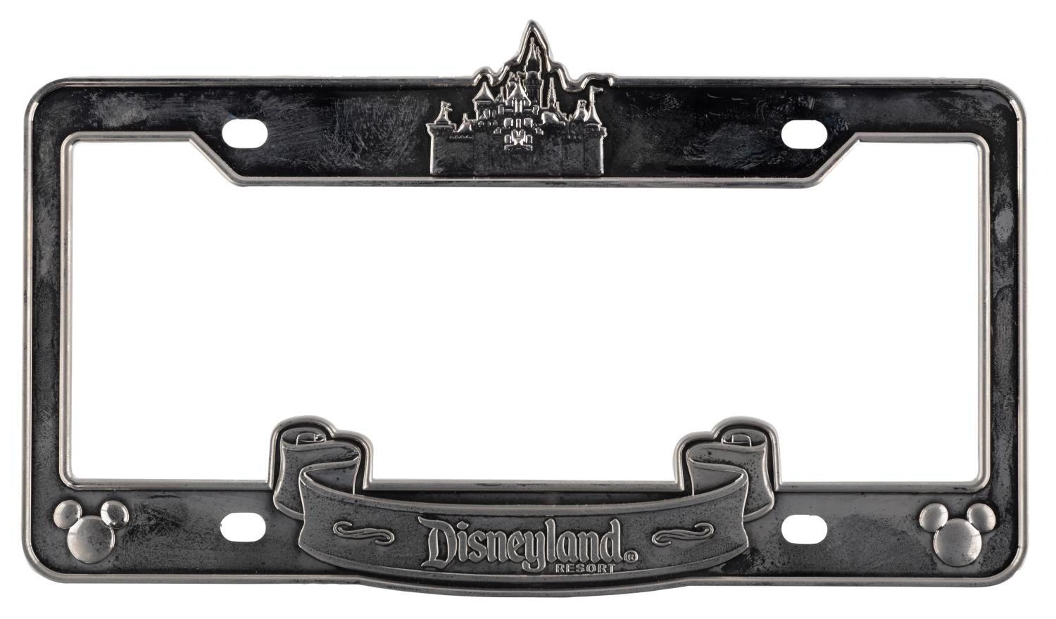 (Disneyland, 2000s) A silver-toned souvenir license plate frame from Disneyland featuring Sleeping Beauty Castle. Measuring 7" x 12.25", the frame is in good condition with scuffs, smudges, and overall wear from age and use.