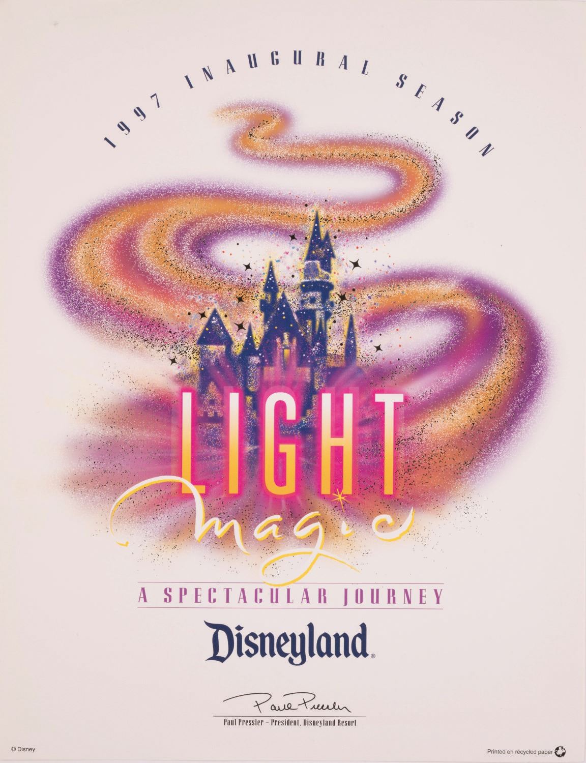 (Disneyland, 1997) A Disneyland Light Magic Inaugural Certificate. The certificate commemorates the Inaugural Season of the nighttime spectacular with shiny gold-finished imagery of Sleeping Beauty Castle enveloped in Light Magic, and the printed signature of Paul Pressler (President, Disneyland Resort). Measuring 8.5"x11", the document is in very good condition with little light to surface and edges from handling and age.