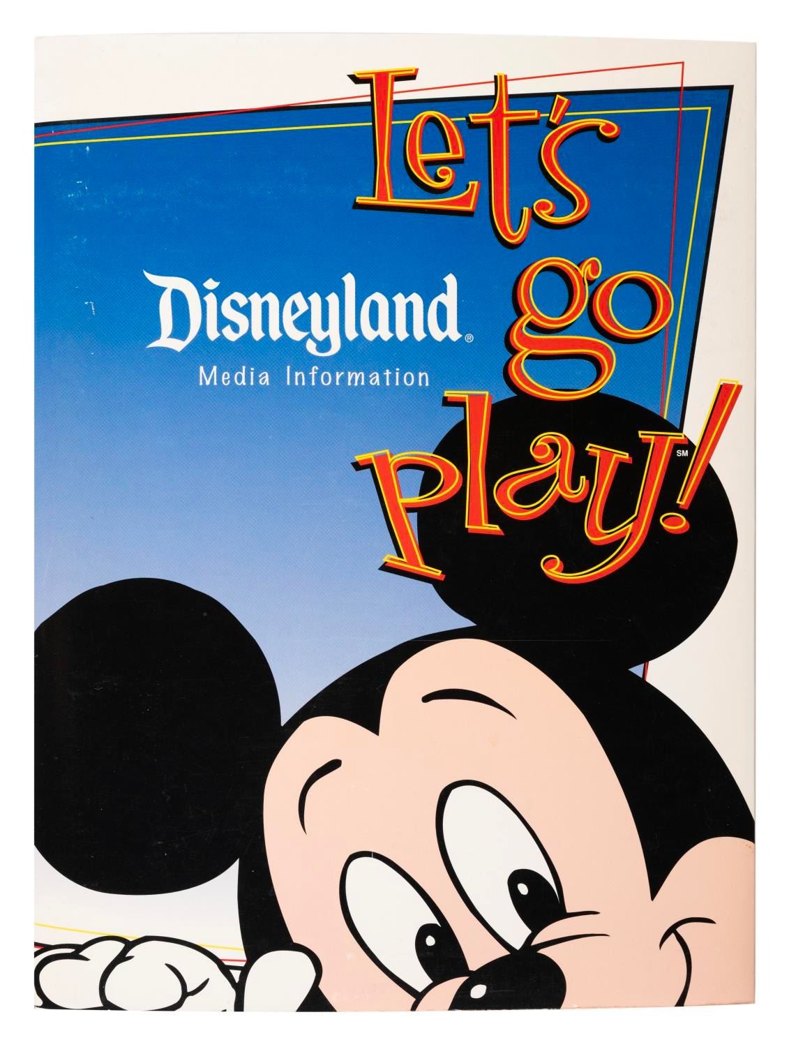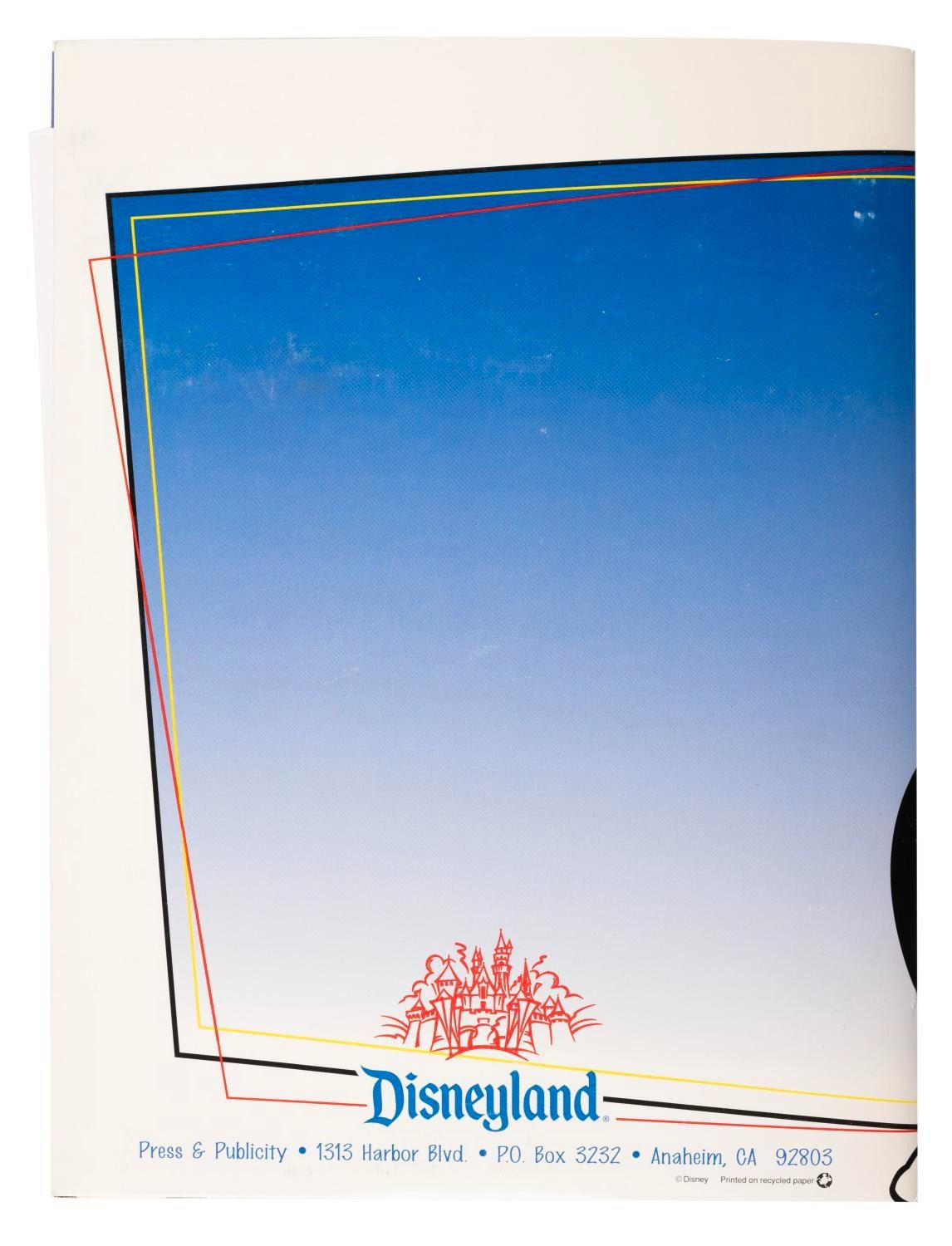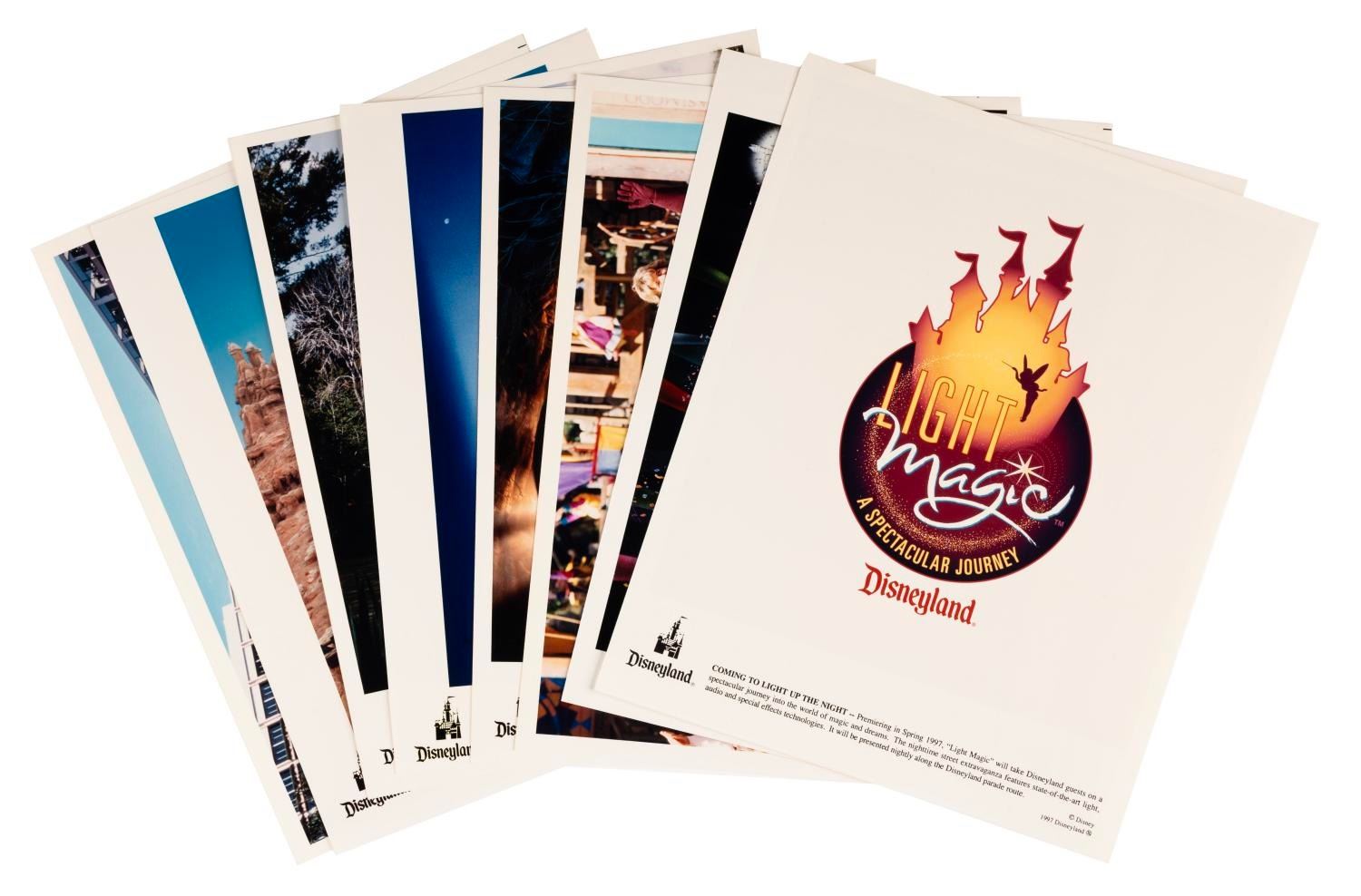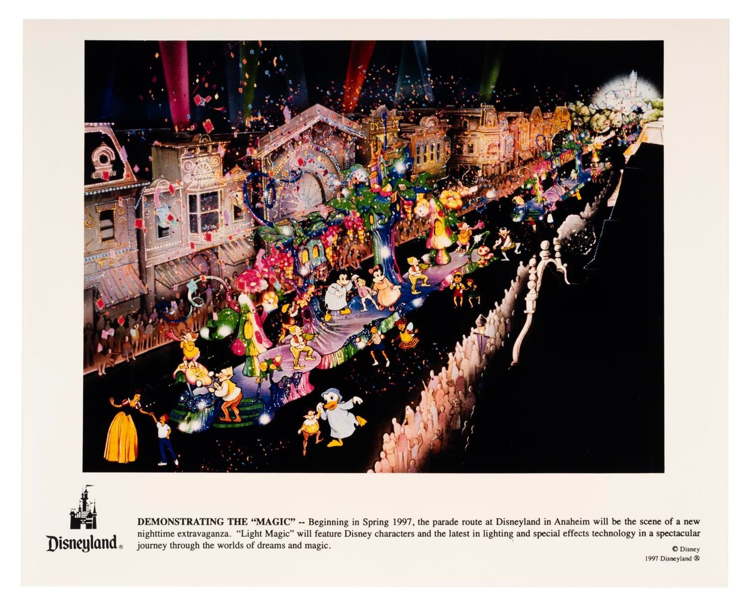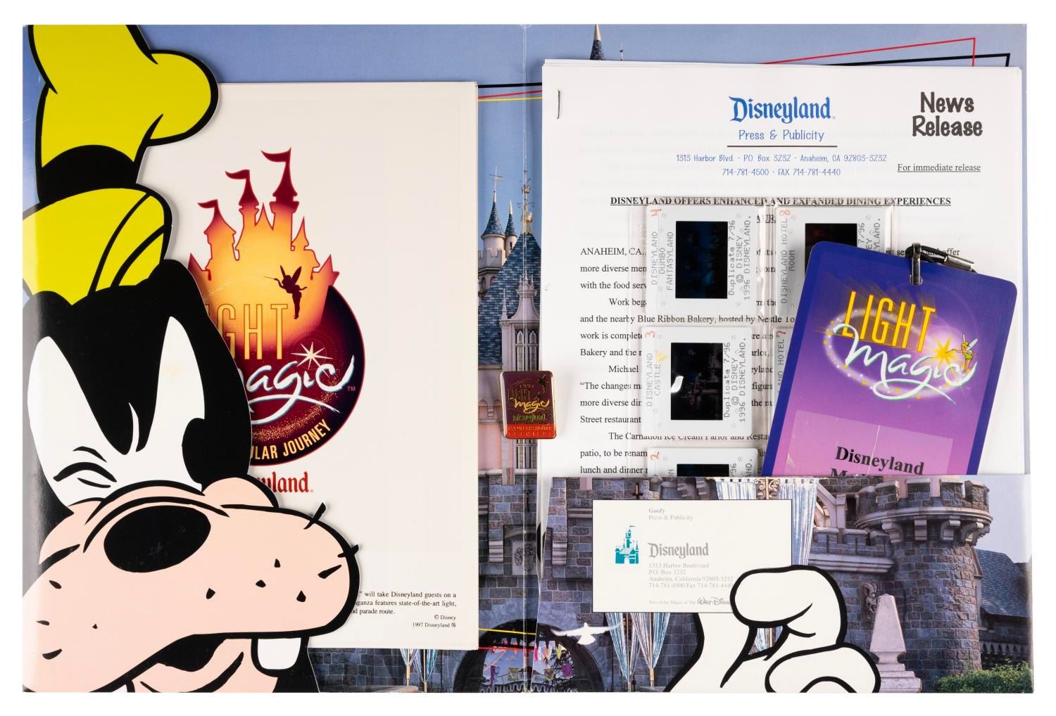 (Disneyland, 1997) A collection of Light Magic Parade memorabilia including an Annual Passholder exclusive pin, a Disneyland Media Host badge, and a press kit. The press kit includes eight 35mm slides of Disneyland, eight color 8” x 10” glossy color prints including a Light Magic Parade logo and concept, and five press releases on the latest developments at the Park. The collection is in very good condition with light scuffs to the press kit folder.