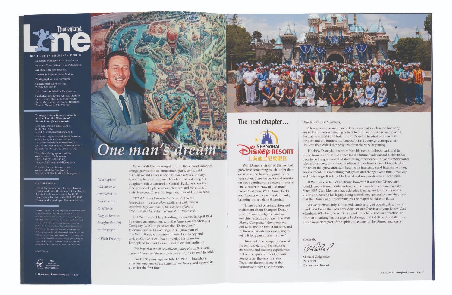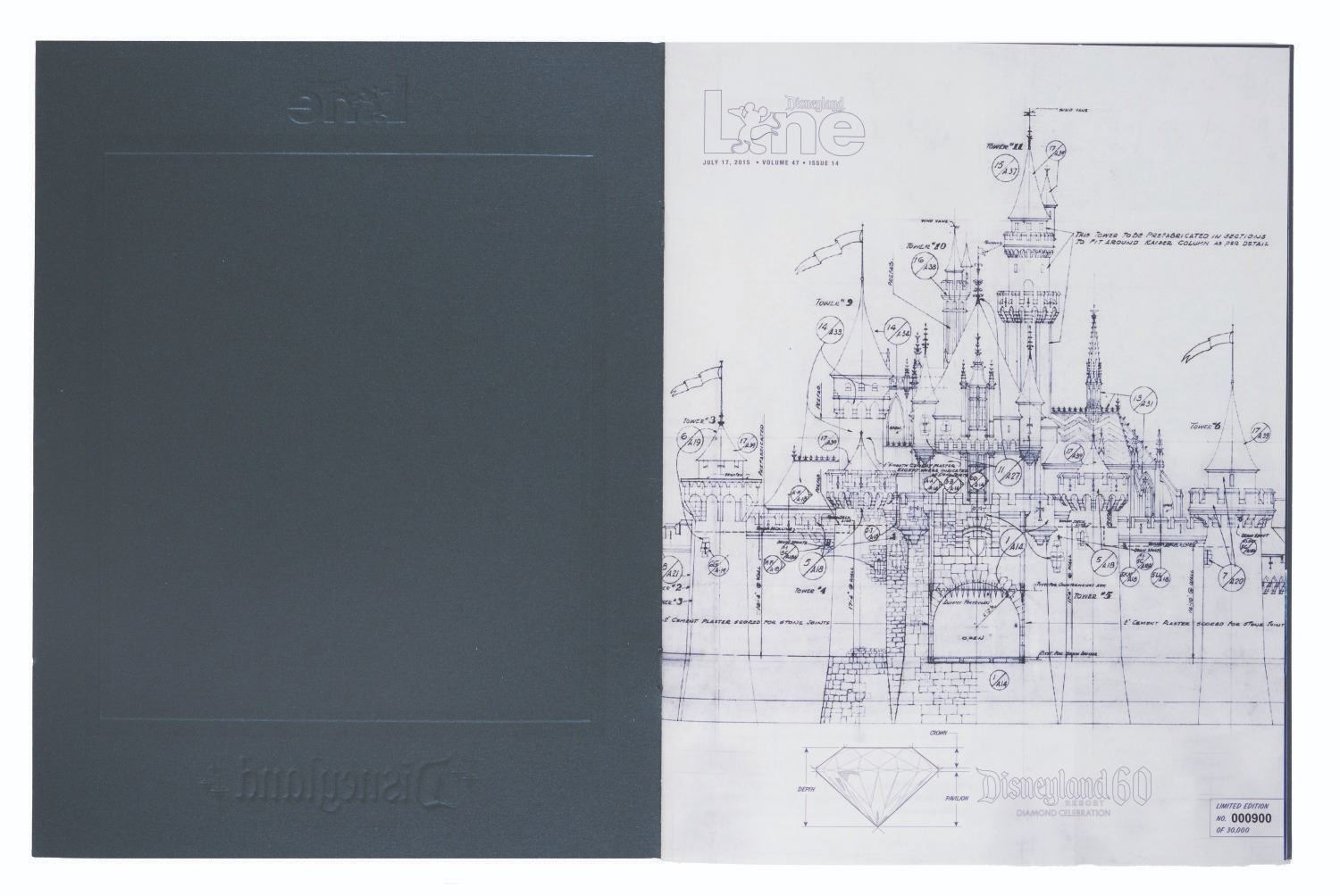 (Disneyland, 2015) A July 17, 2015 Disneyland 60th Anniversary issue of the Cast exclusive Disneyland Line magazine. This special Diamond Celebration issue features a lenticular cover and contains stories and information relating to Cast Member and Park news. The 28-page magazine measures 8.75" x 11” and is in very good condition with light edge nicks and the original postage and mailing label on the back cover.