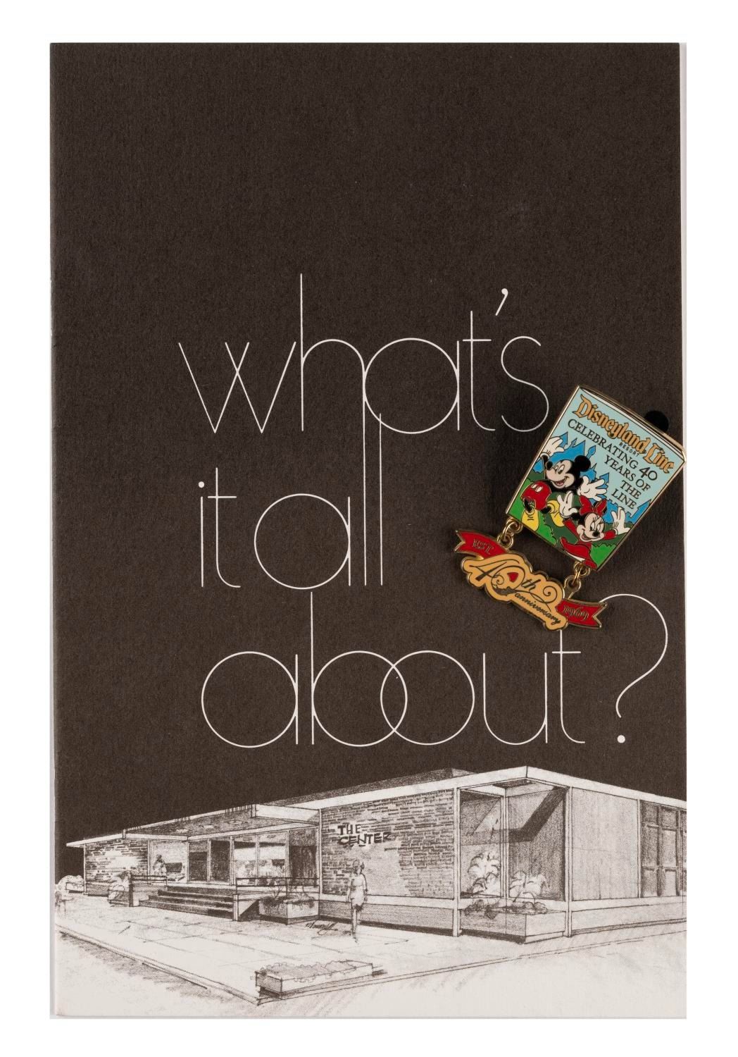 (Disneyland, 1970s/2009) A Disneyland Line pin and "The Center" publication. The limited edition 500 Cast Member exclusive pin commemorates 40 years of Disneyland's internal newsletter and "The Center" internal publication that helped employees understand the newly-built Center in Backstage Disneyland. Measuring 5.5"x8.5" and 1.5"x2", these rare pieces are in fine condition.