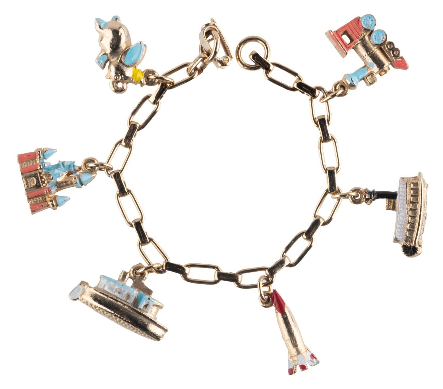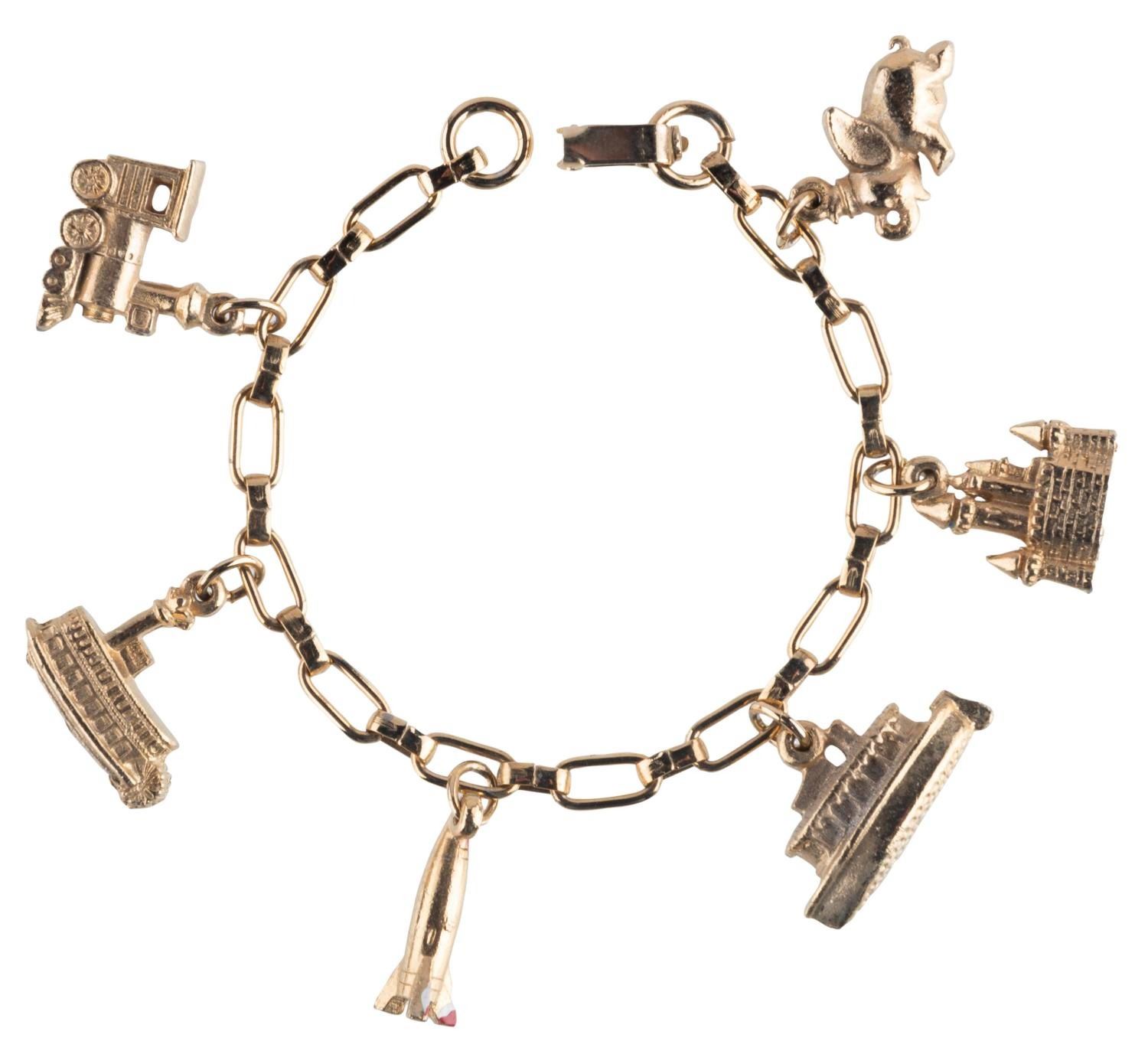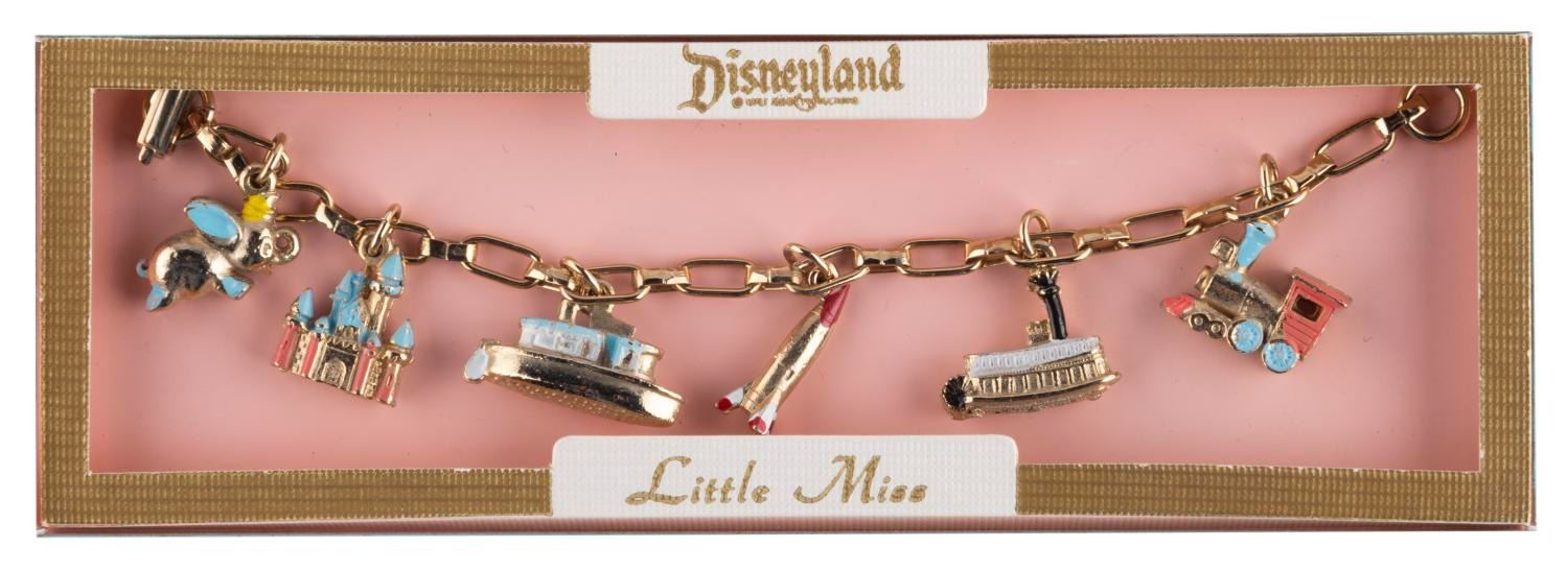 (Disneyland, 1960s) A souvenir Little Miss Disneyland charm bracelet featuring 6 charms shaped like Dumbo, Sleeping Beauty Castle, a Jungle Cruise boat, the moonliner, the Mark Twain Riverboat, and Casey Jr. Measuring 1.75” x 5.75” in the original box, the bracelet and box are in very good condition with very light scuffing to the box.