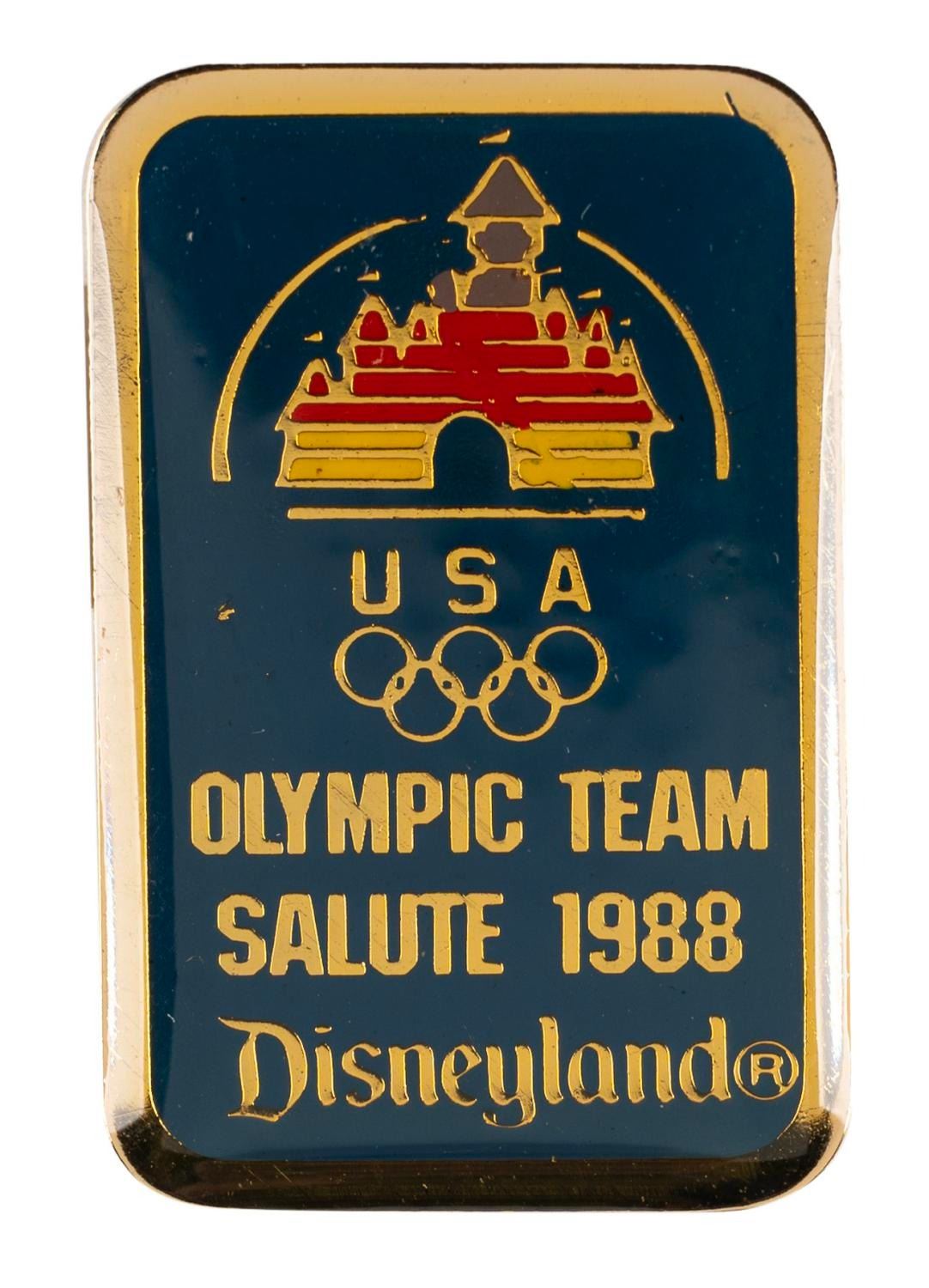 (Disneyland, 1988) A Disneyland Olympic Team Salute 1988 pin featuring Sleeping Beauty Castle. Measuring 1.25" tall, the pin is in very good condition with slight color shift from age.