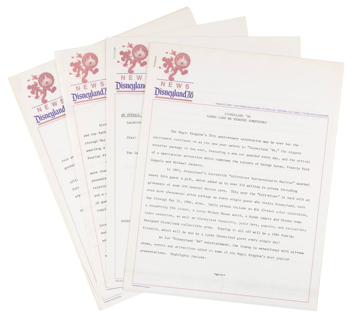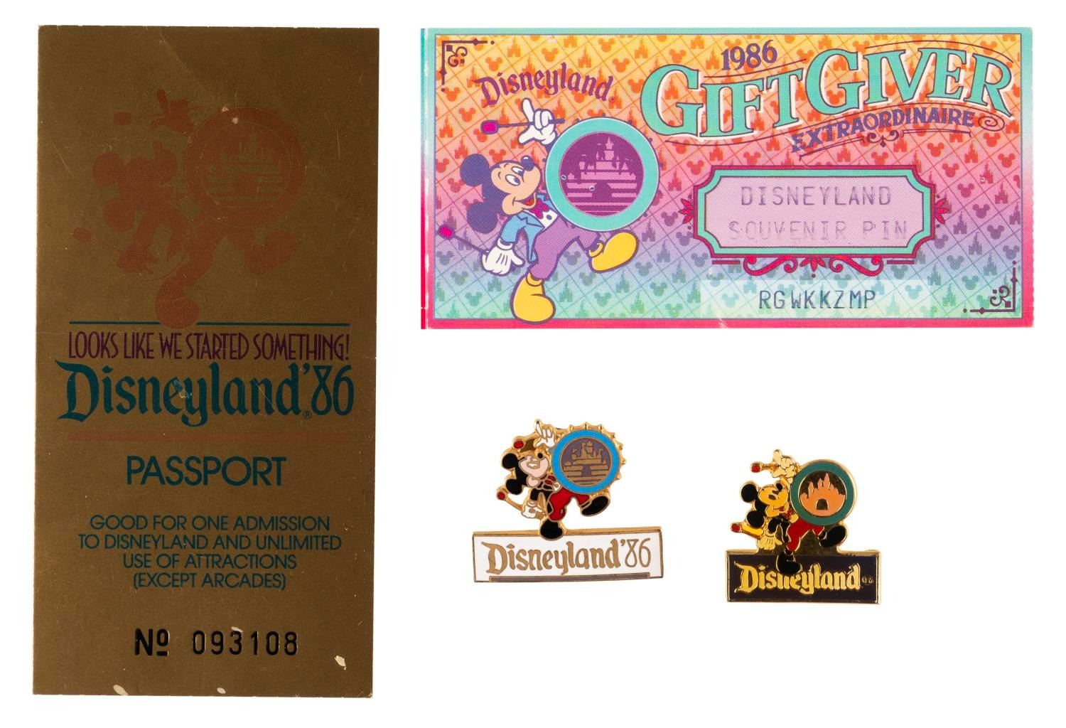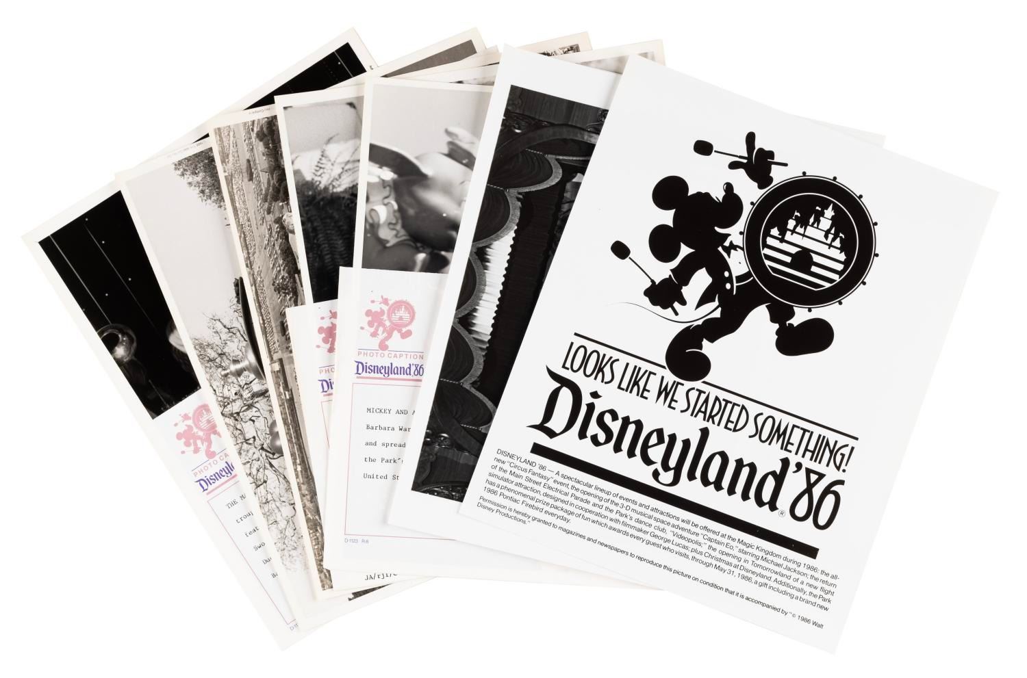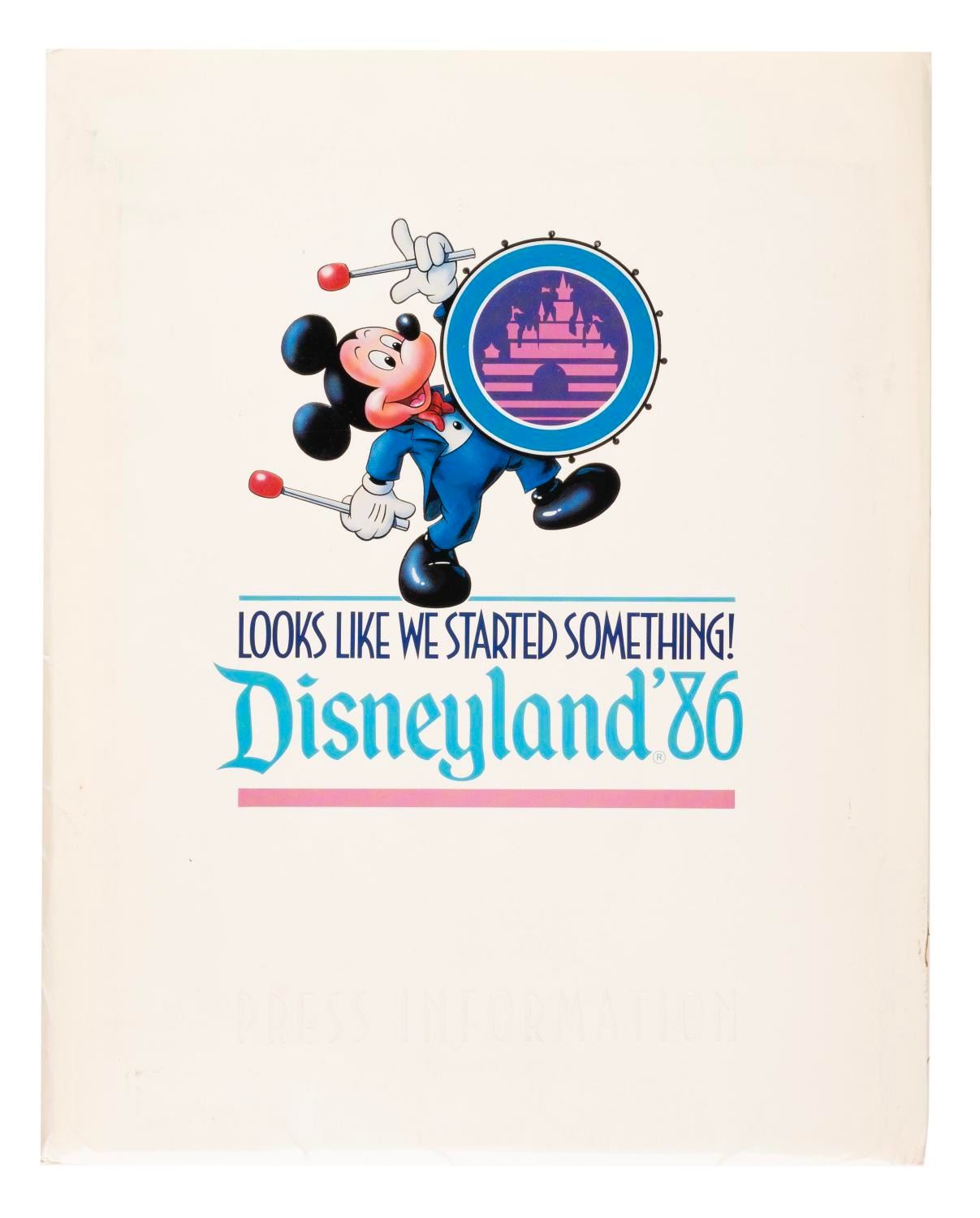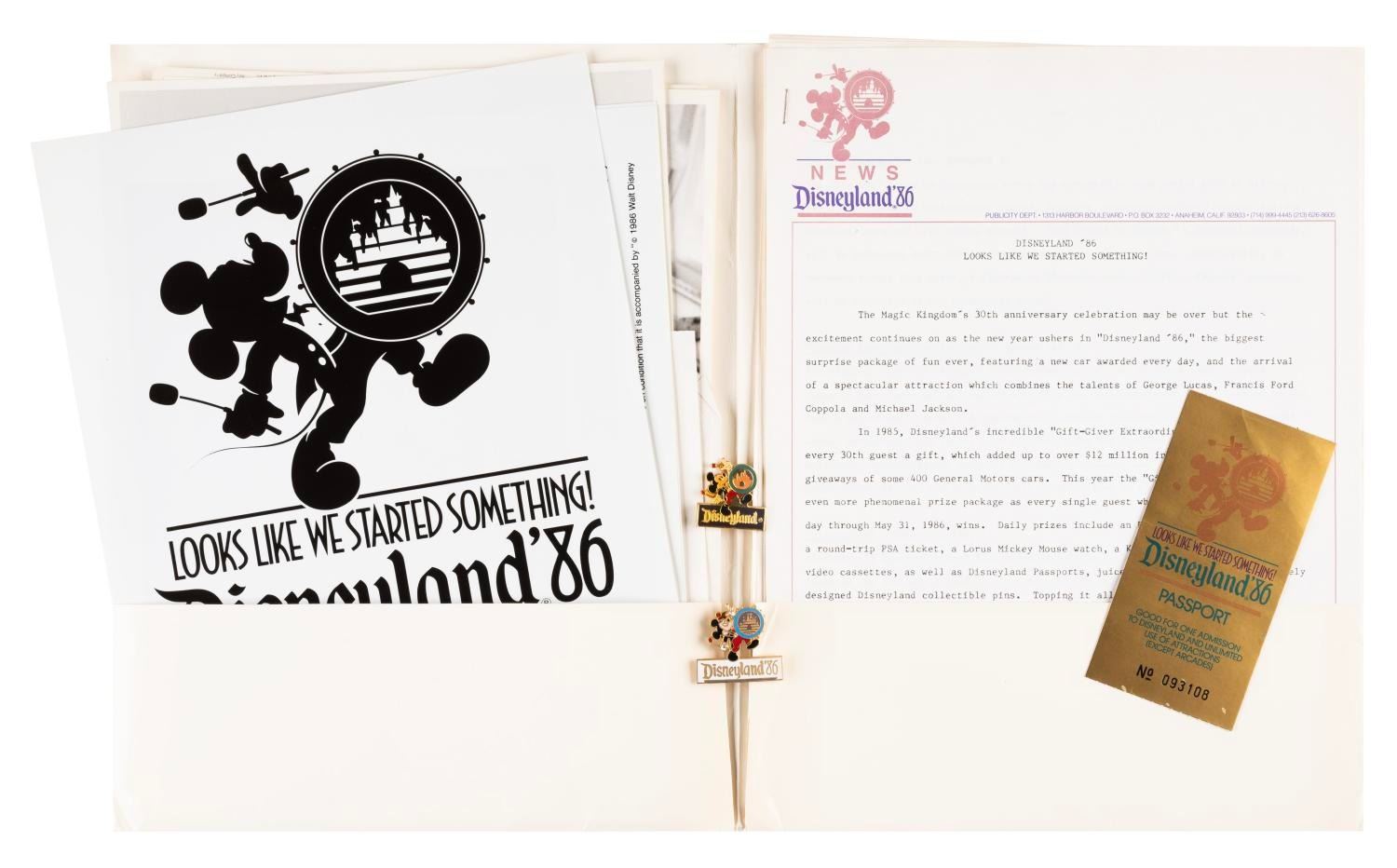 (Disneyland, 1986) A press information kit from the Park’s “Looks Like We Started Something” campaign. Inside are black and white glossy press photos, press releases, two pins, a used Disneyland passport, and a gift coupon. Ranging in size from a 1.25” x 1.25” pin to the 9” x 11.5” folder, the items are in good to very good condition with light creases and wear.