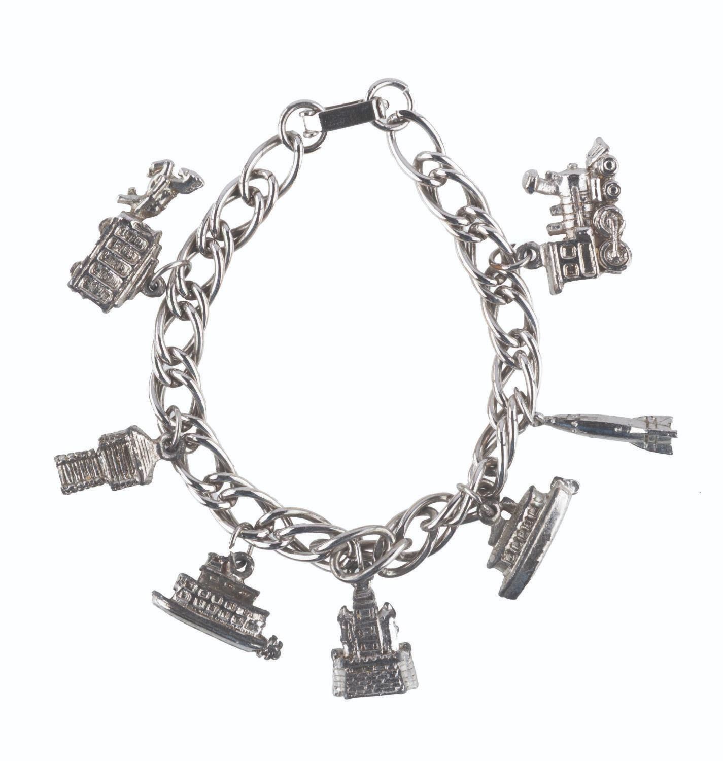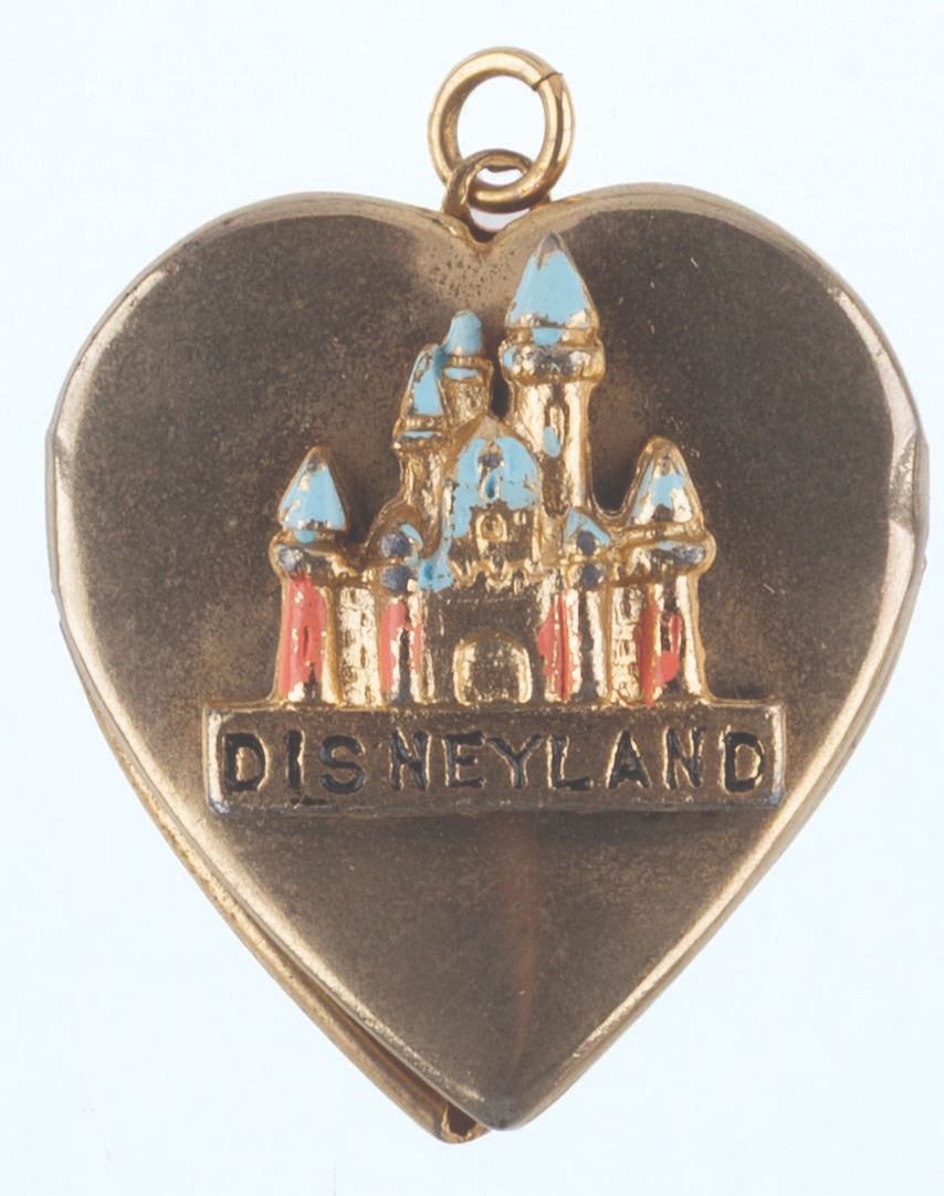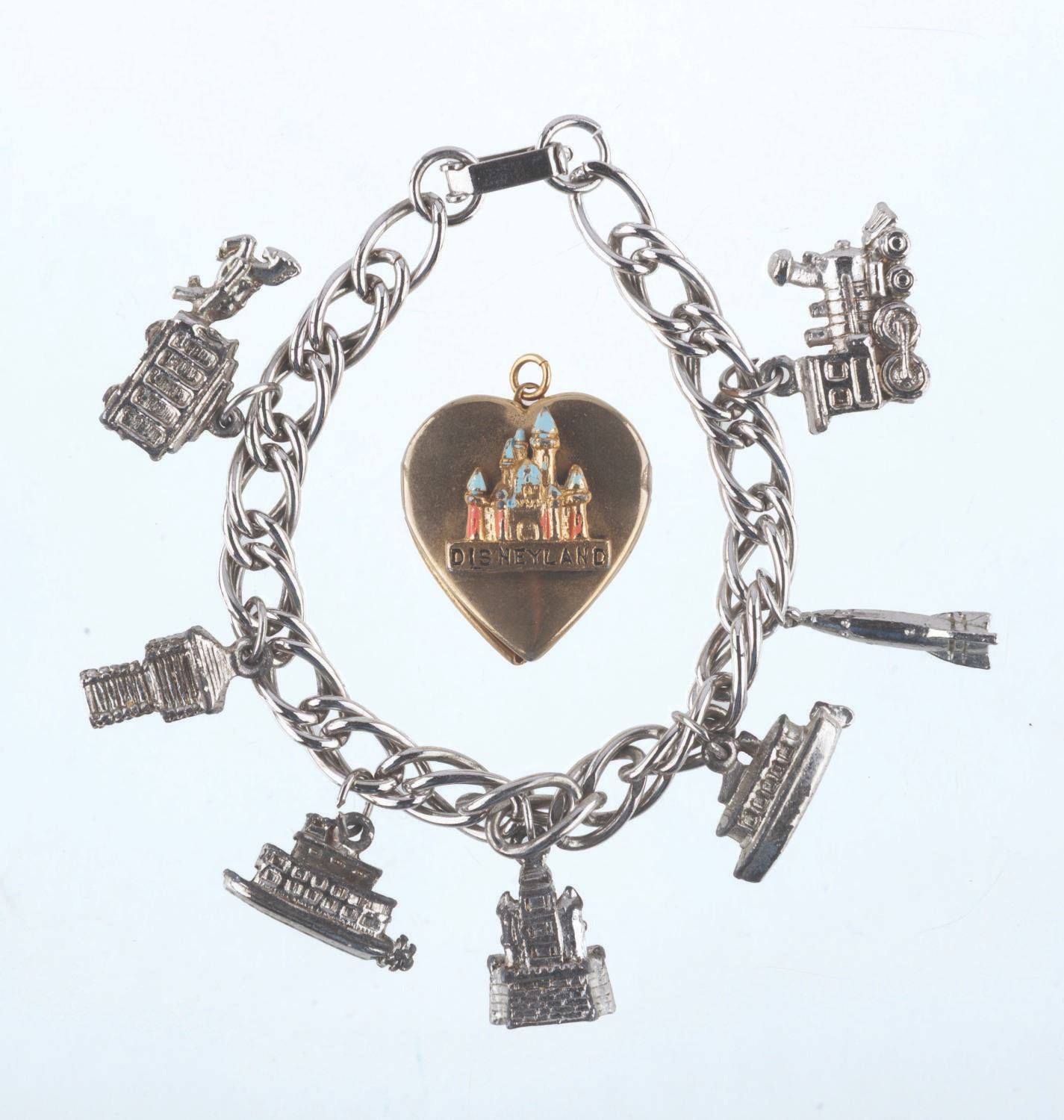 (Disneyland, 1950s-60s) A Disneyland Sleeping Beauty Castle locket, and a charm Bracelet featuring a silver-toned curb chain with seven Disneyland attraction charms, including the Mark Twain, Tomorrowland Rocket, and Casey Jr. The locket and bracelet are in very good condition with light handling wear.