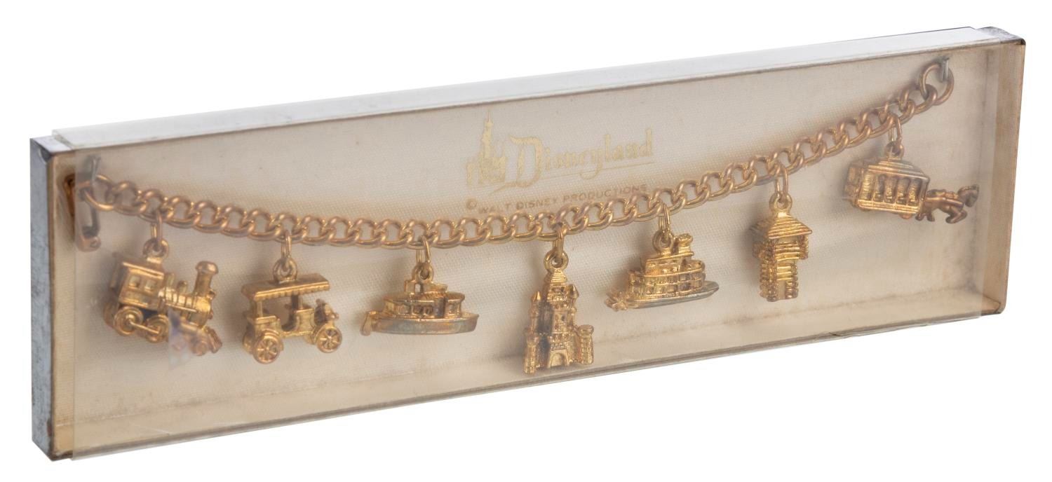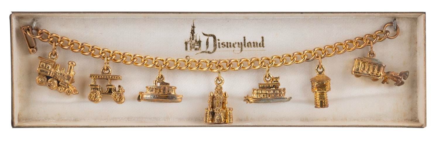 (Disneyland, 1950s-60s) A Disneyland Magic Charm Bracelet featuring a gold-toned curb chain with seven Disneyland attraction charms. Measuring 6.75" long, this bracelet is in good condition with some discoloration, tarnish, and wear to the patina of some charms. This comes within its original 7.25"x2" Disneyland souvenir window box, exhibiting minor wear to the box.