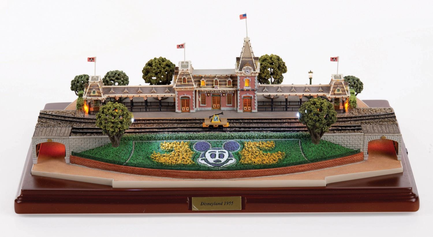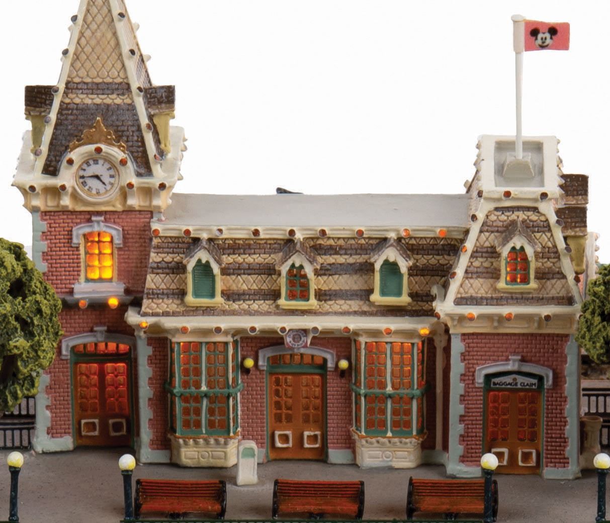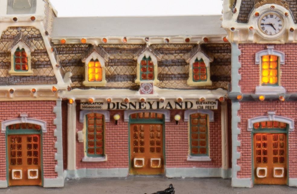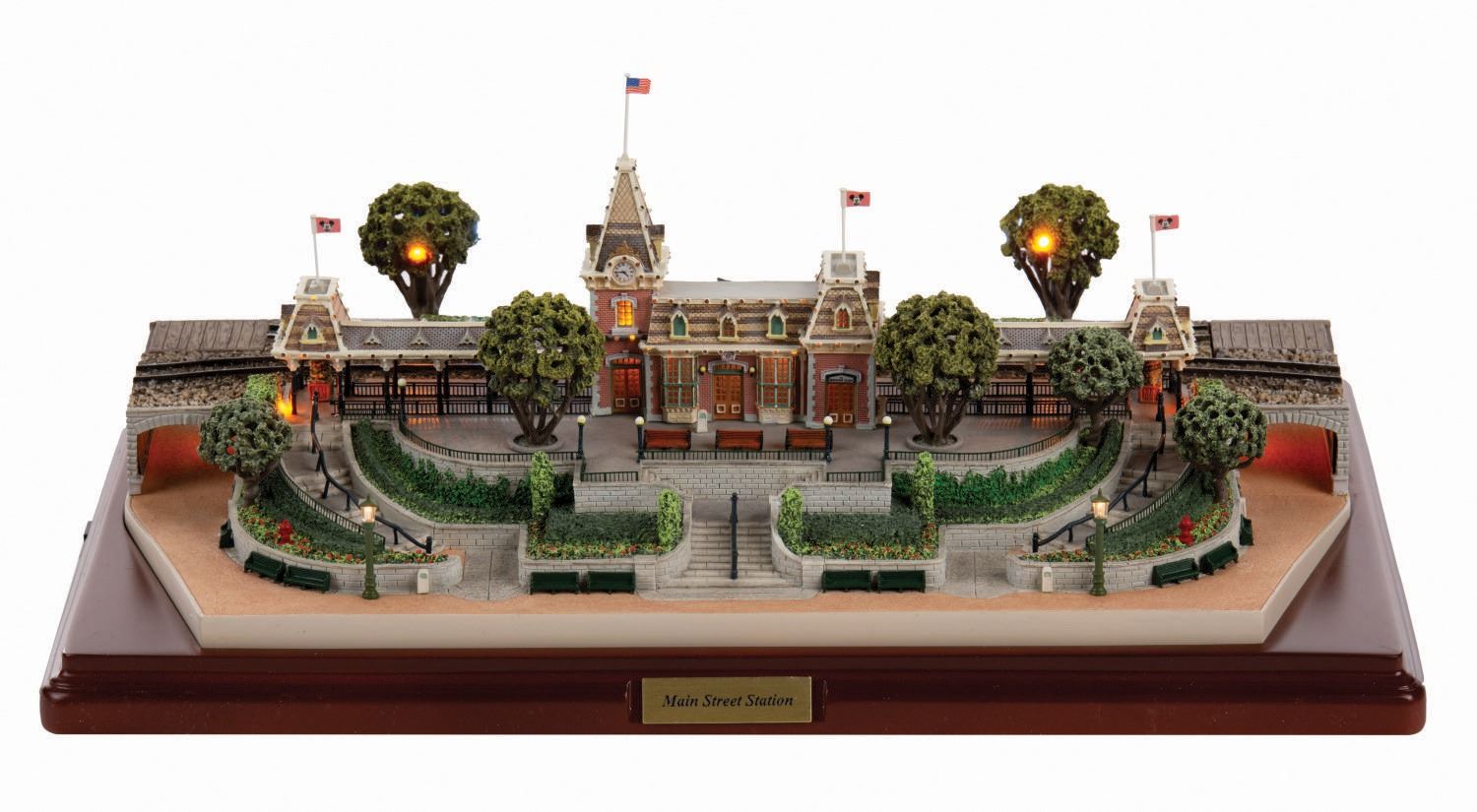 (Disneyland, 2005) An original scale model of Main Street Station at Disneyland, created by renowned miniaturist Robert Olszewski. This First Edition model has lighted elements and comes with a handcar, flag accessories, power cord and a certificate of authenticity in its original Disneyland 50th Anniversary Commemorative Collection box. The model measures approximately 14"x9.5" and 6" tall. The piece is in fine condition with light wear from previous display.