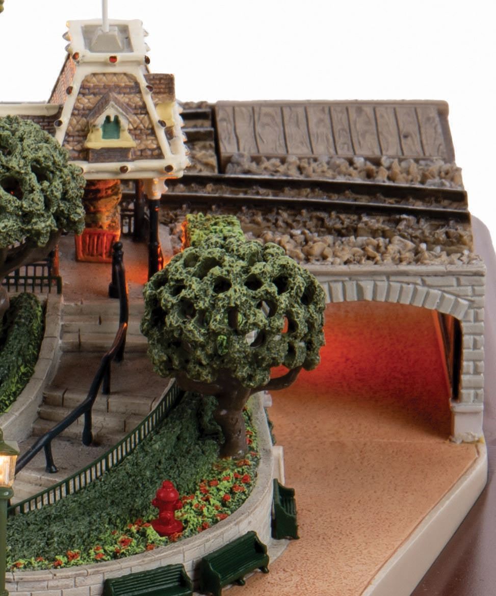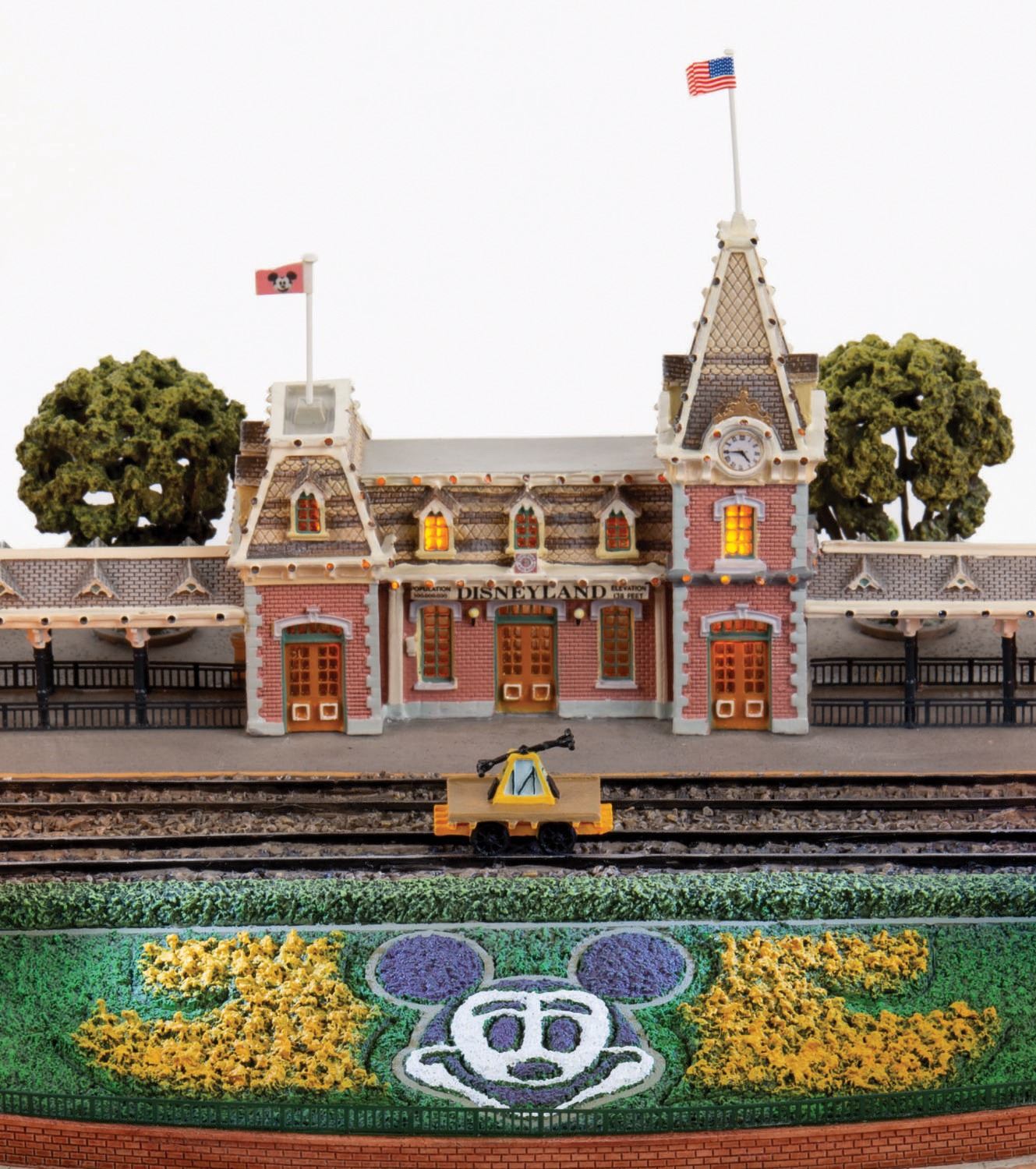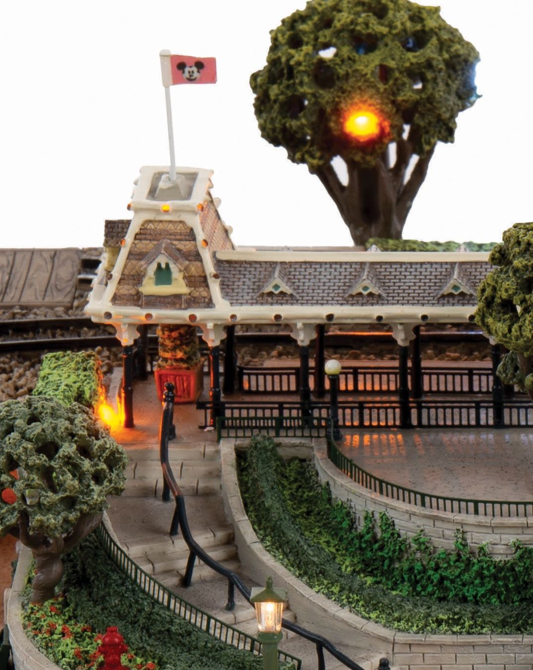 (Disneyland, 2005) An original scale model of Main Street Station at Disneyland, created by renowned miniaturist Robert Olszewski. This First Edition model has lighted elements and comes with a handcar, flag accessories, power cord and a certificate of authenticity in its original Disneyland 50th Anniversary Commemorative Collection box. The model measures approximately 14"x9.5" and 6" tall. The piece is in fine condition with light wear from previous display.