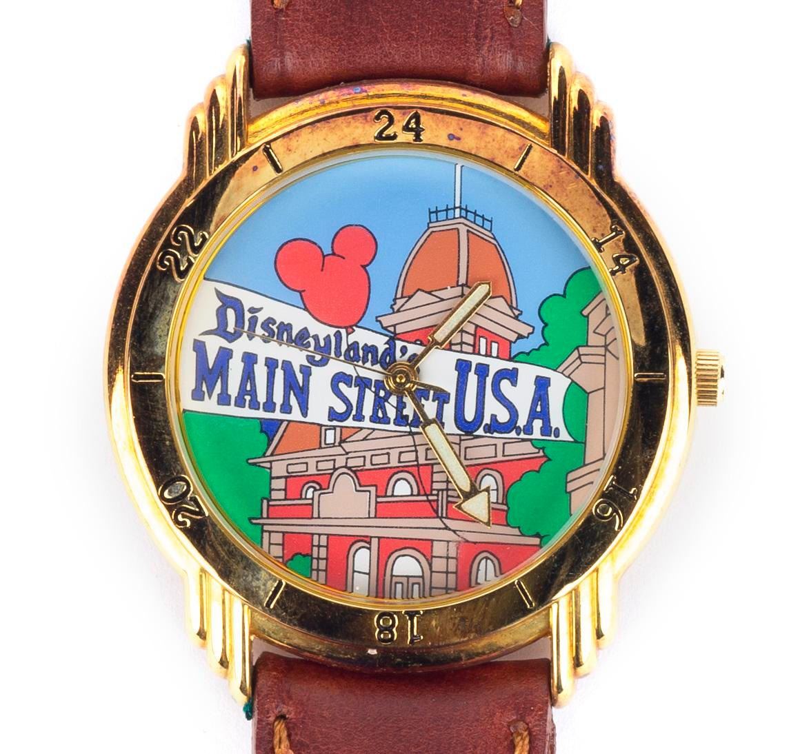 (Disneyland, 1995) A Disneyland Main Street U.S.A. Watch. The watch was once offered through New Century Timepieces at Disneyland and features a colorful image of Main Street Station a dial, with metallic case and leather band. Measuring 9" long, the watch is numbered 254/300, and is in very good condition with minor tarnish to the metal and slight scuffs to the rear of the case.