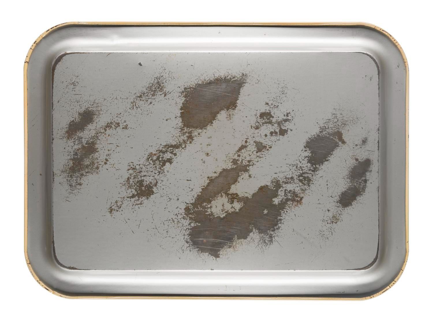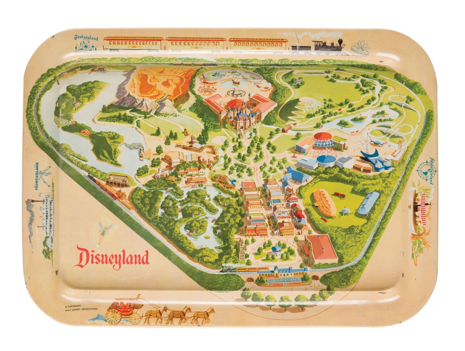 (Disneyland, 1955) An aluminum lithographic Disneyland tray. This tray features a color aerial view of the Park, depicting some of its inaugural areas, like Holiday Land and Recreation Land, alongside those still recognizable today. The piece offers a glimpse into some of the earliest licensed Disneyland merchandise. Measuring 12.5"x17.5", the tray is in very good condition.