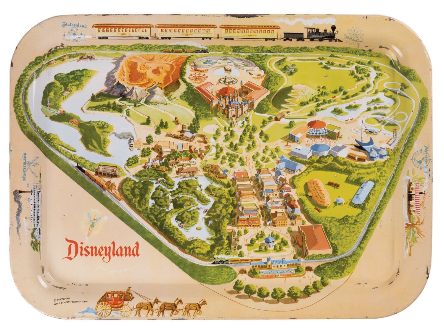 (Disneyland, 1955) A tin lithographic Disneyland television tray by California Metalware Corporation.  This television tray features a color aerial depiction of Walt Disney's Disneyland. The tray "serves" as an excellent example of some of the earliest licensed Disneyland merchandise, depicting Holiday Hill, International Street, and the Mickey Mouse Club Circus among the Park's five lands. Measuring 17.5"x12.5", it is in good condition with scratches, scuffs, and wear from use.