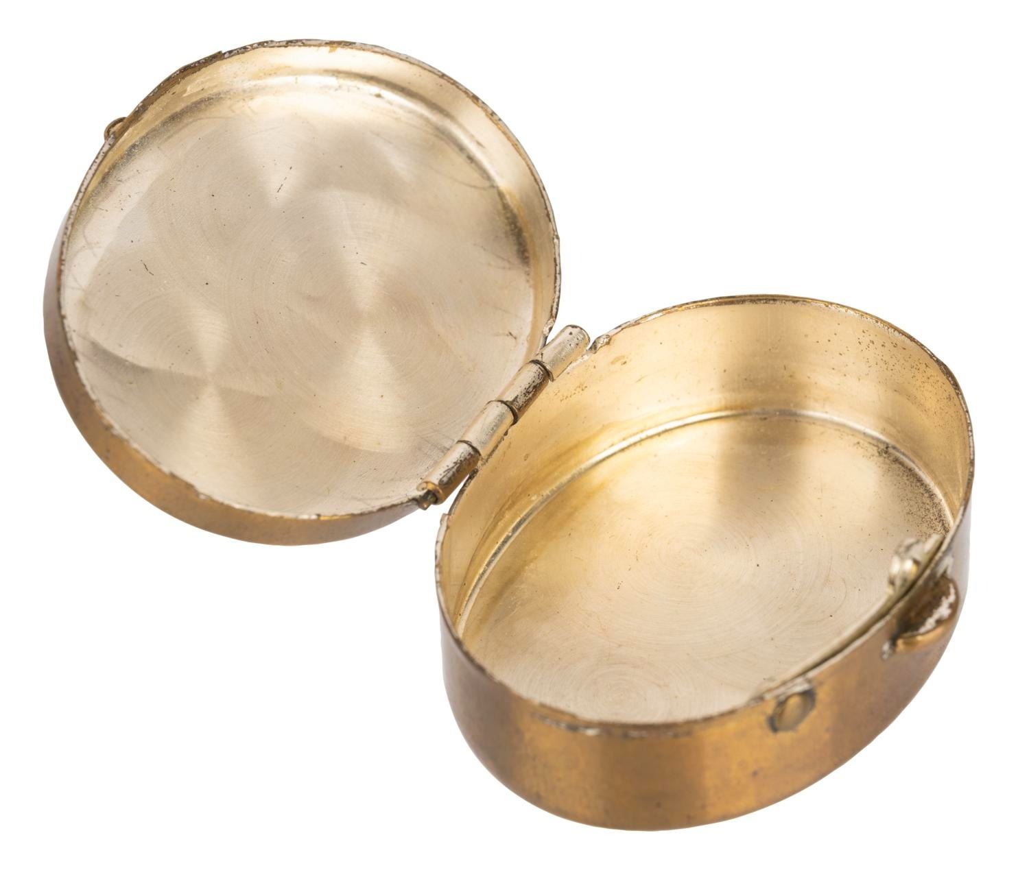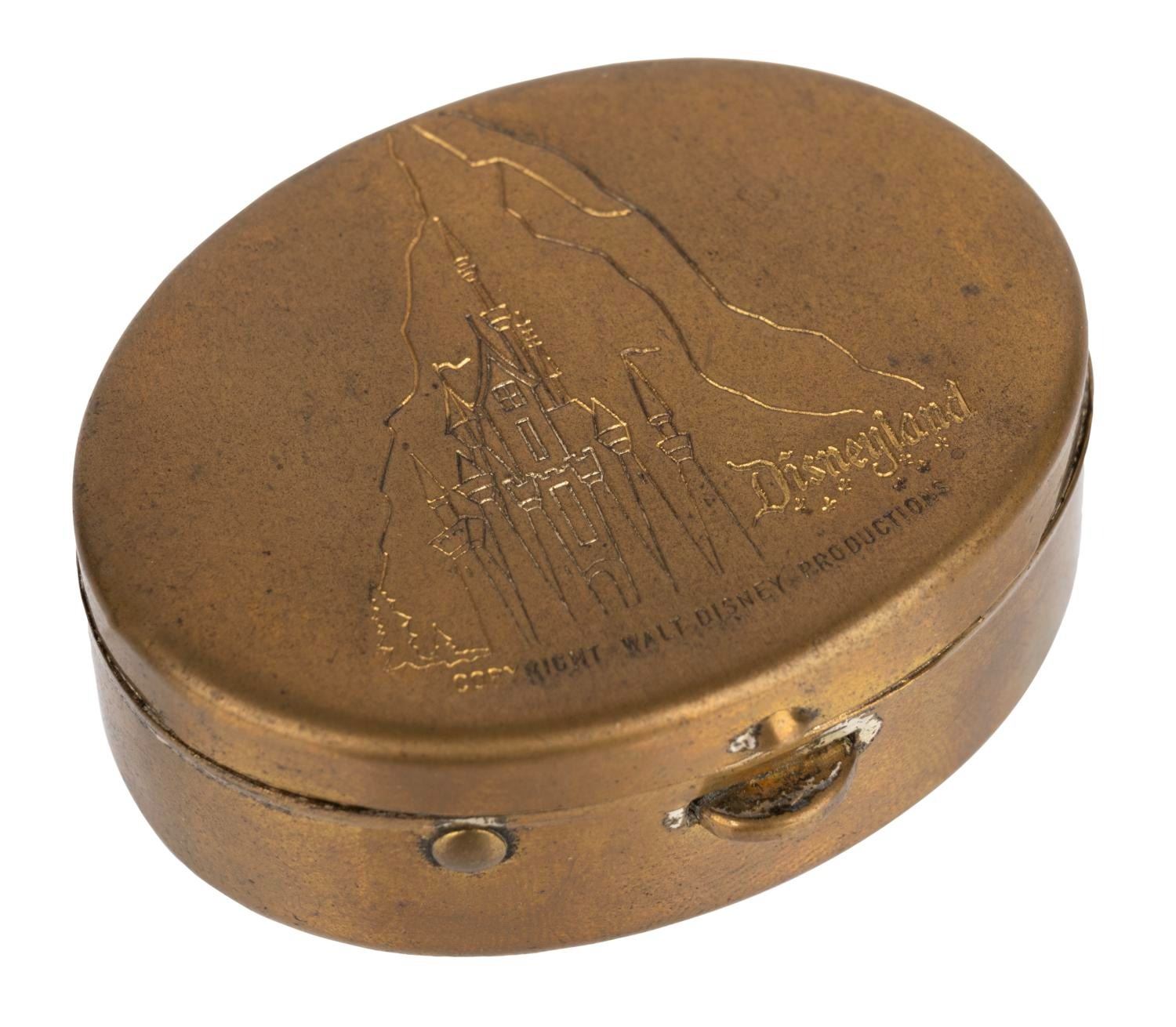 (Disneyland, 1950s-60s) A rare oval pill box souvenir of Disneyland's Matterhorn towering over Sleeping Beauty Castle. Measuring 1.5"x1.25"x.5", this small hinged box is in good condition with a few small spots of discoloration and surface wear.