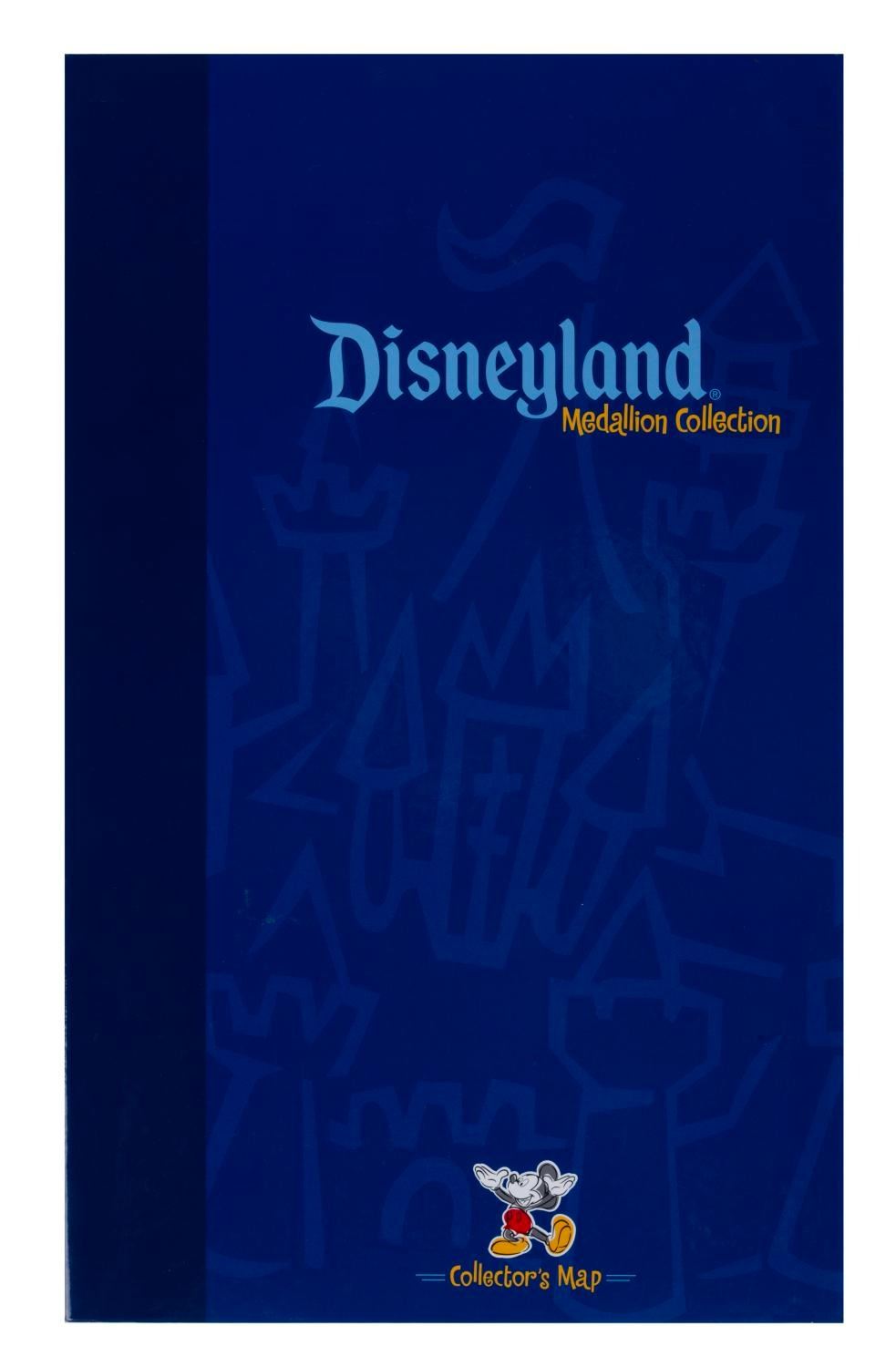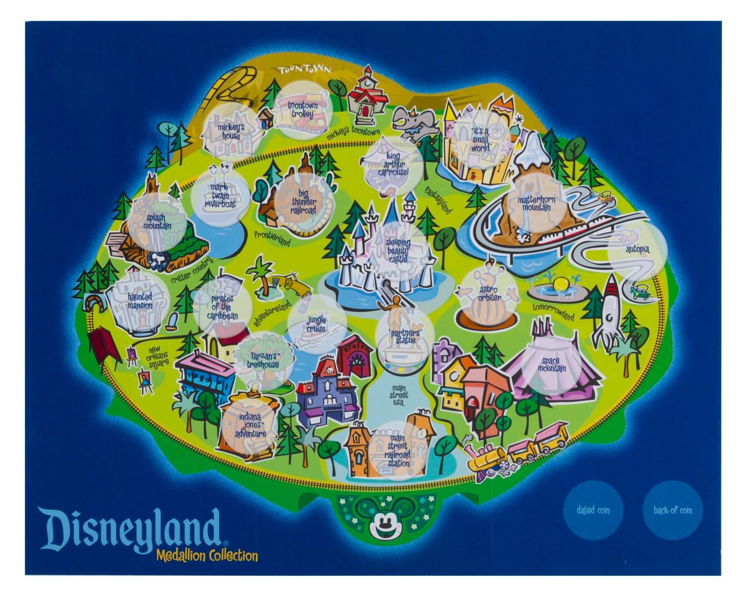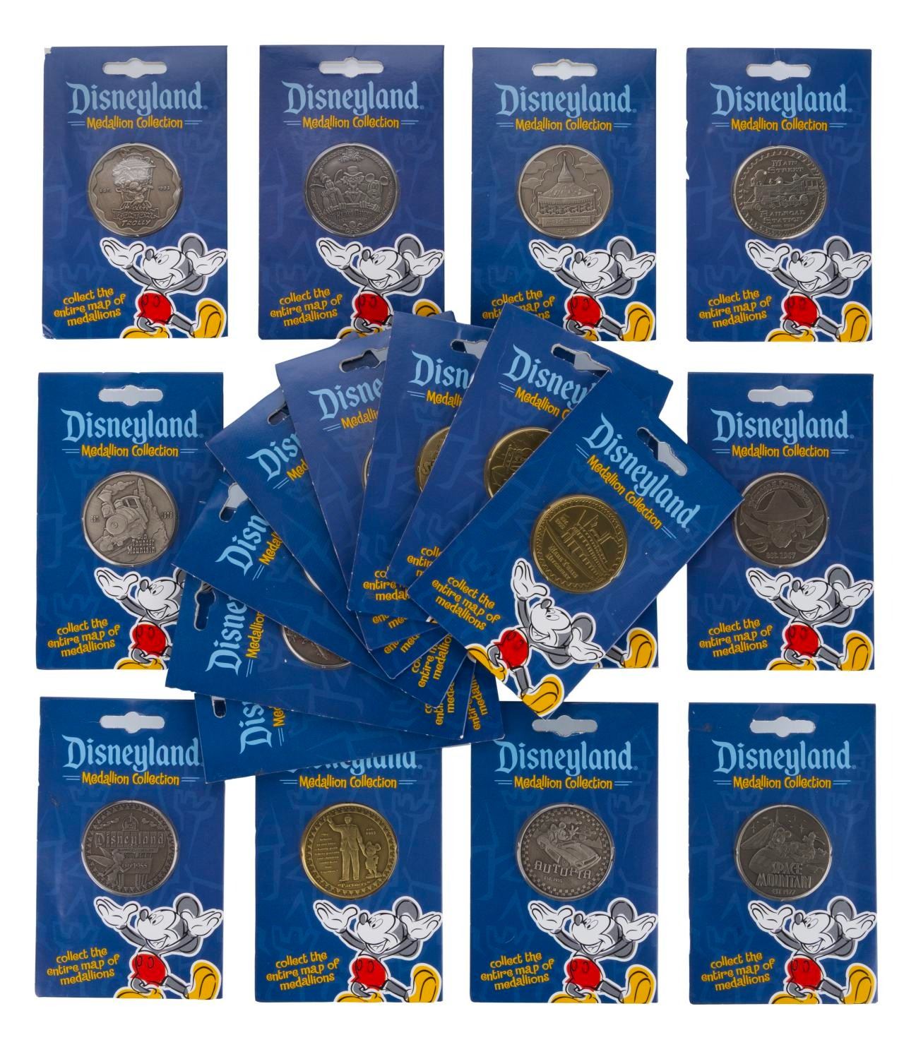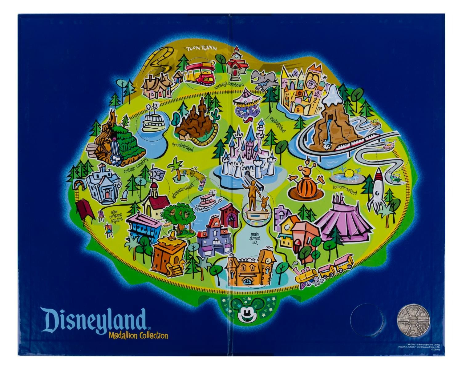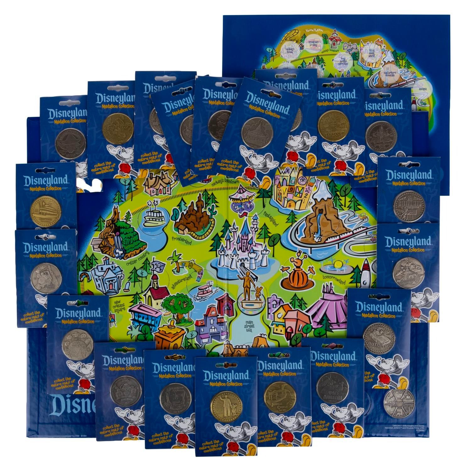(Disneyland, 2001) A Disneyland medallion collection of twenty double-sided medallions celebrating individual attractions, lands, and areas of the Park. The coins are accompanied by their original Collector's Map containing an additional coin and a checklist. Measuring 1.5", each nickel coin is in fine condition on its original 3"x4.75" card. Measuring 10"x16", the hardcover Collector's Map is in fine condition.