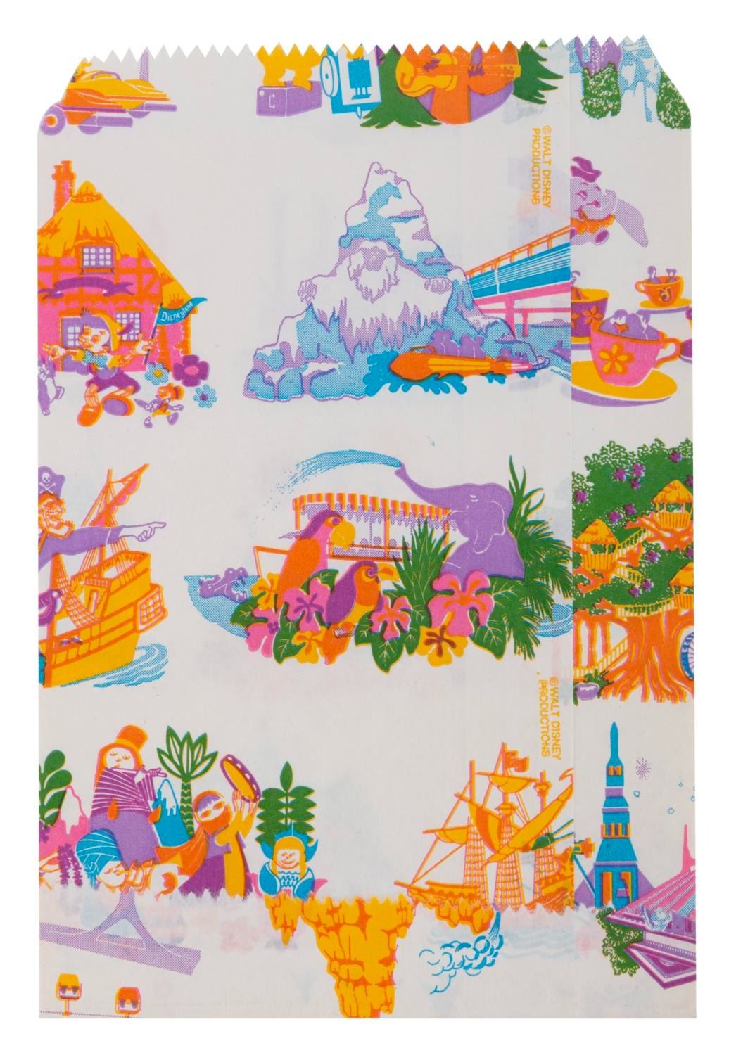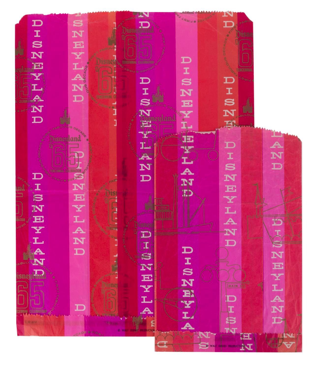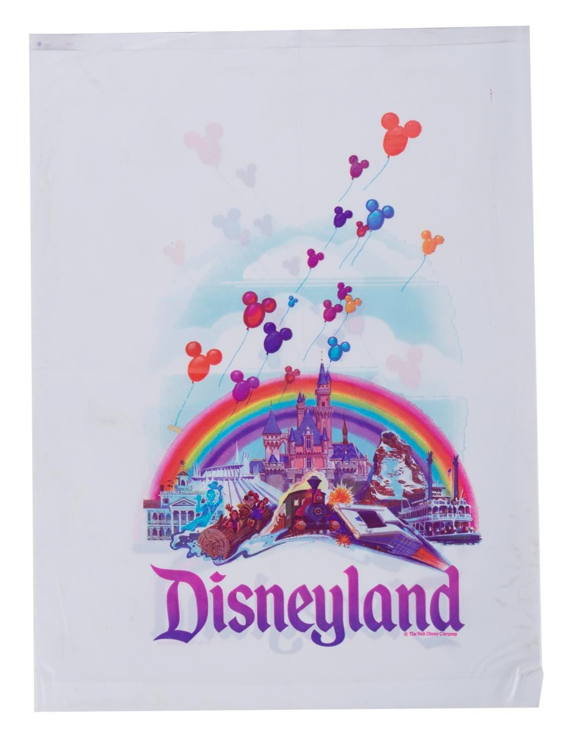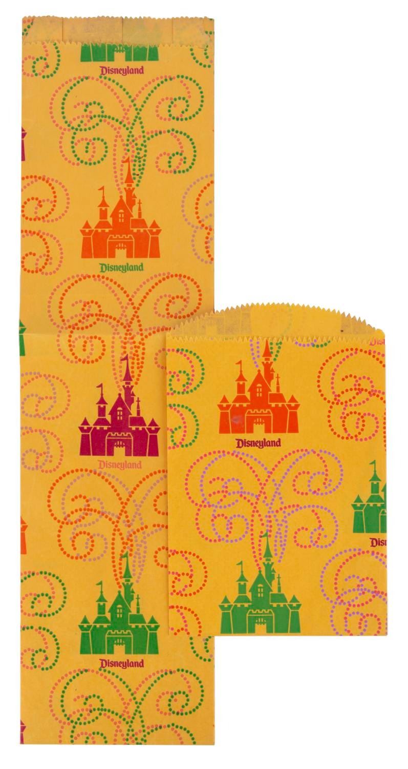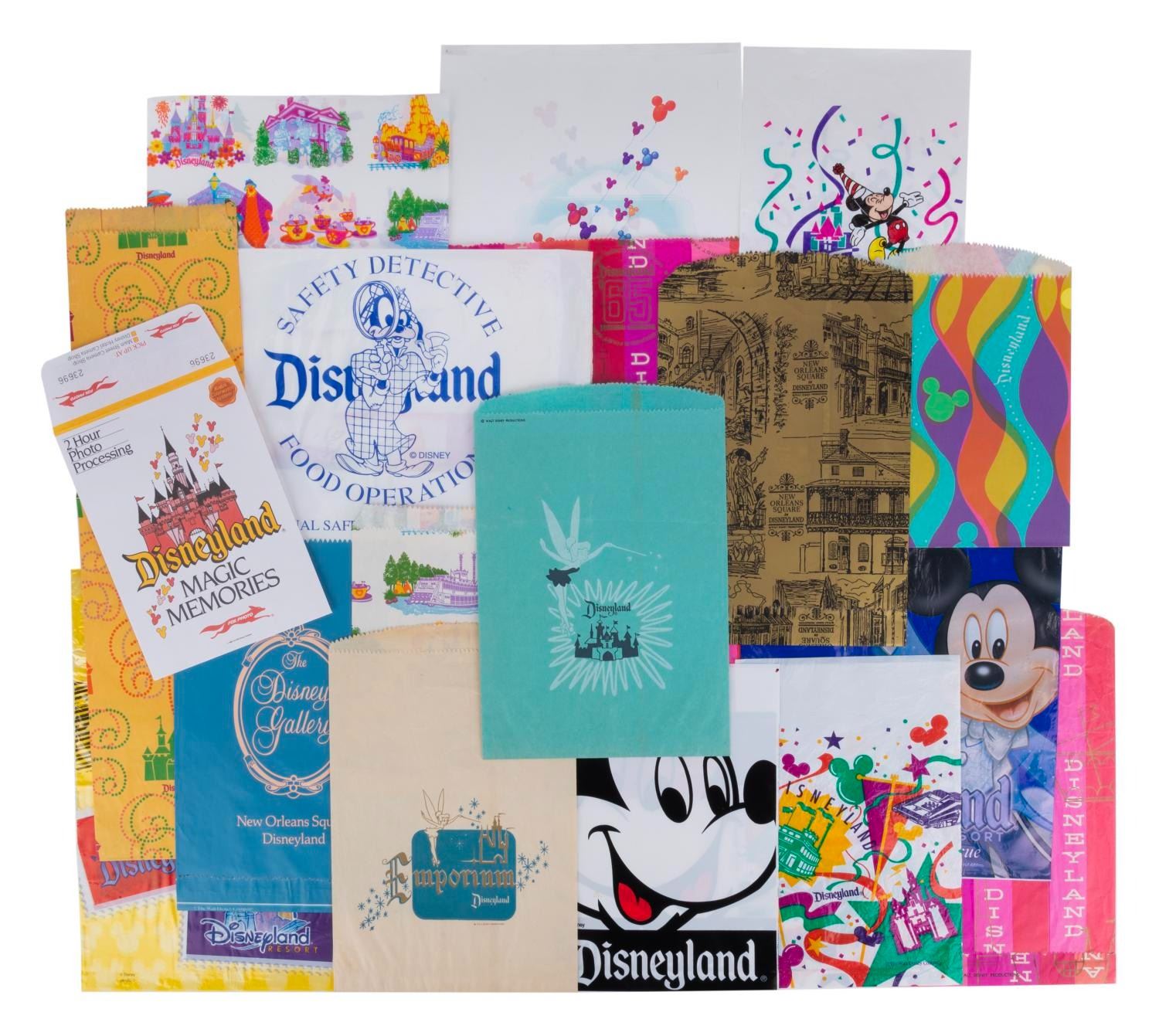 (Disney Parks, 1950s-2000s) An archive of souvenir bags from Disneyland and Disney’s California Adventure Park. Notably among this collection of merchandise bags are pieces exclusive to the Emporium, New Orleans Square, The Disney Gallery, and the Tencennial Celebration of 1965. Measuring in size from 5.5”x8.5” to 11.5”x15.75”, each bag is in good to very good condition with creases, fading, and wear from handling and age.
