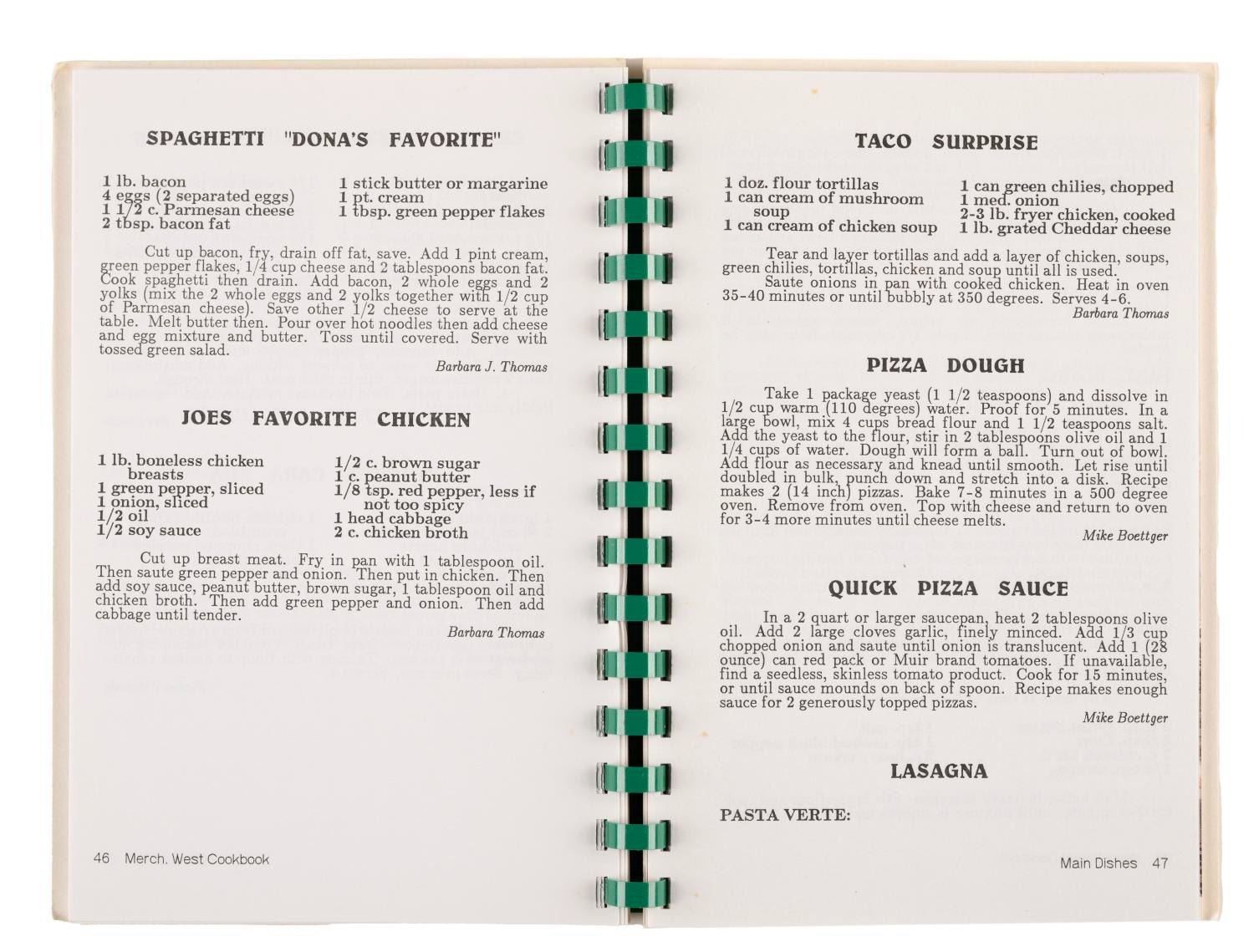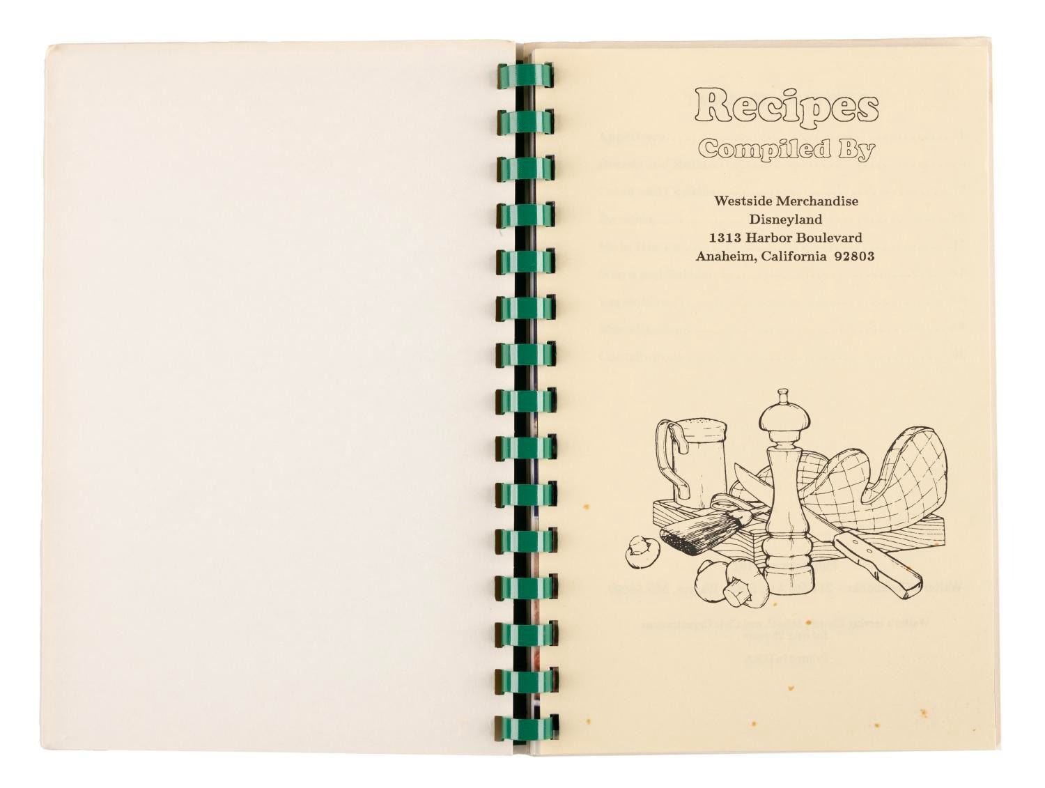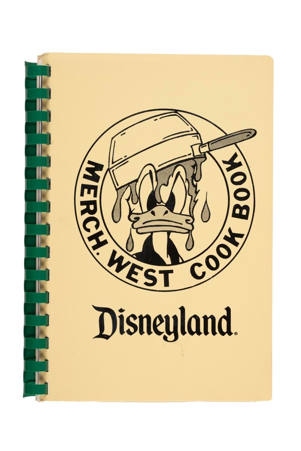 (Disneyland, 1980s) A Disneyland Merchandise West Cook Book featuring 72 pages of recipes from the Westside Merchandise employees of Disneyland. Measuring 6.25"x8.75", this spiral-bound publication is in very good condition exhibiting wear and spots of discoloration to its cover.